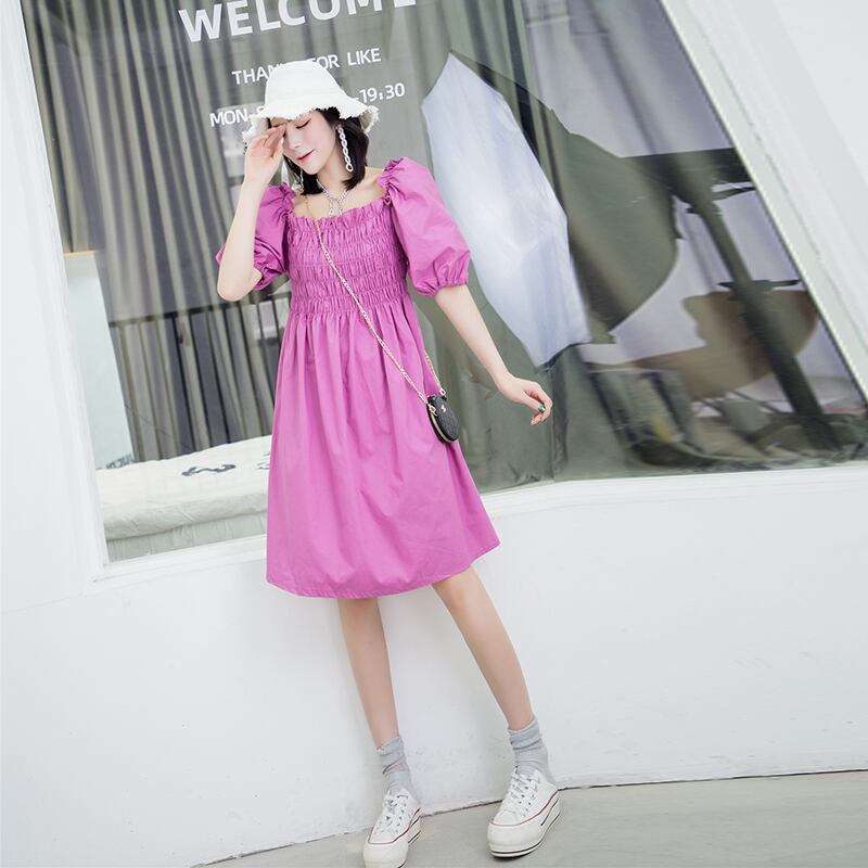 スタンダードストレッチハイウェストウェストプリーツスリーブドレス レトロ エラスティック 伸縮 大きめサイズ スクウェア ミックスインファッション10358877939