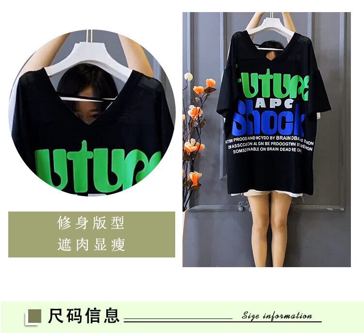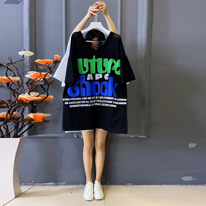 VネックプリントルーズTシャツ カジュアルトップス ストリート 大きめサイズ ミックスインファッション20051366457