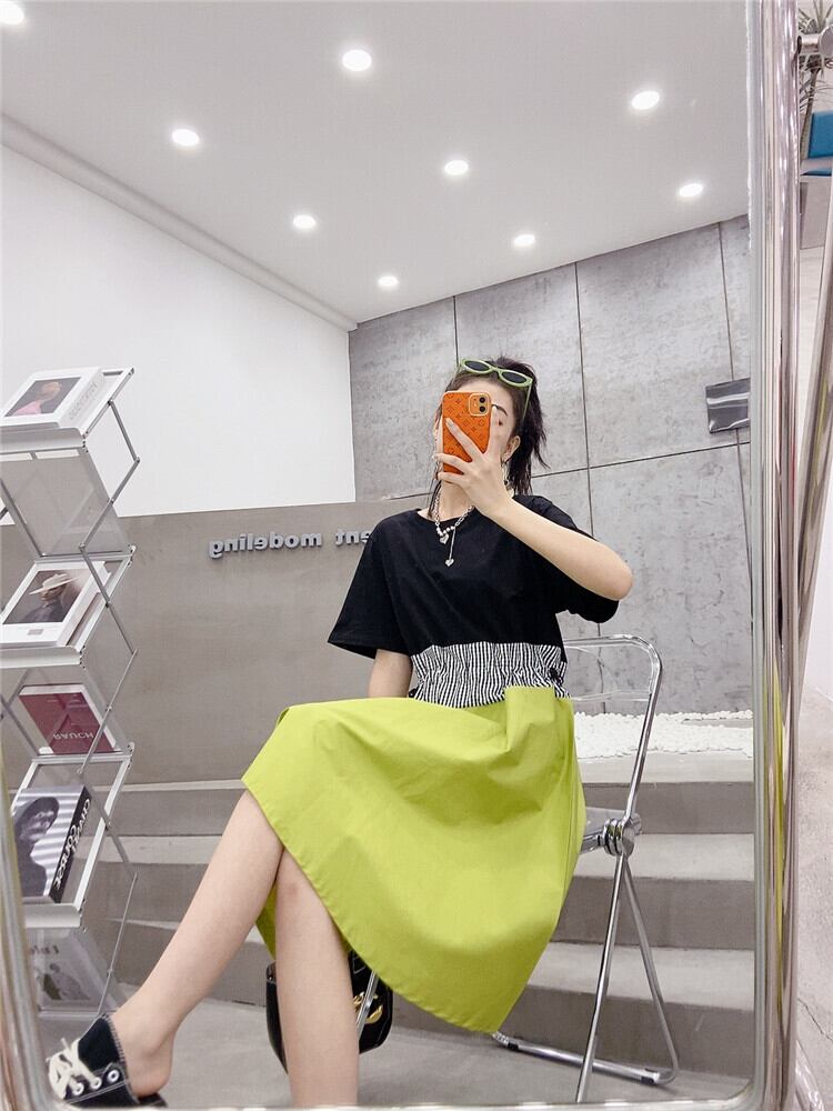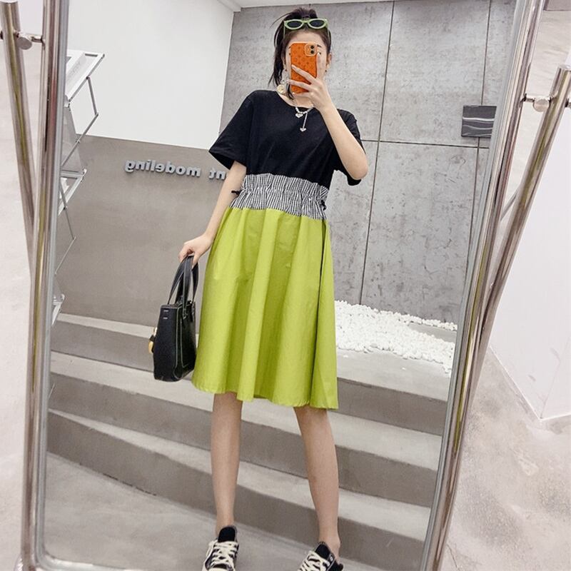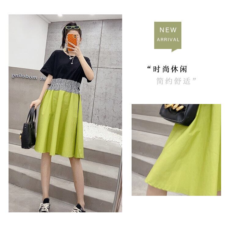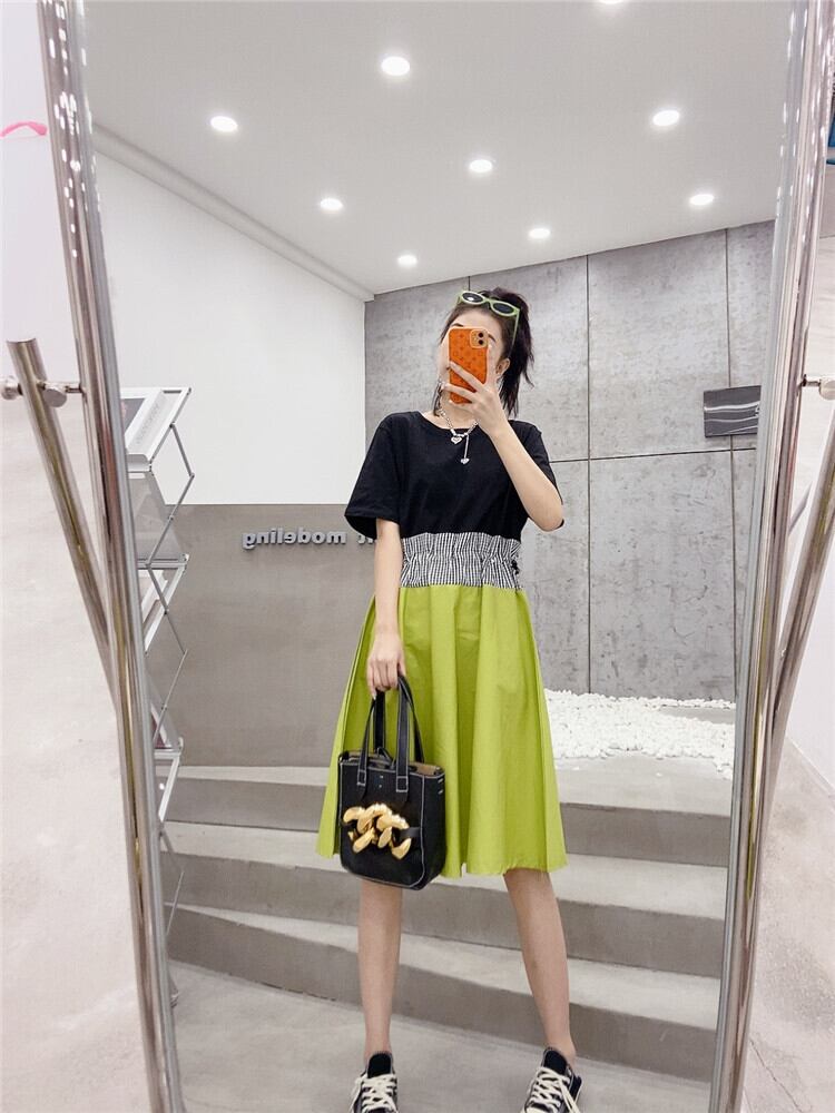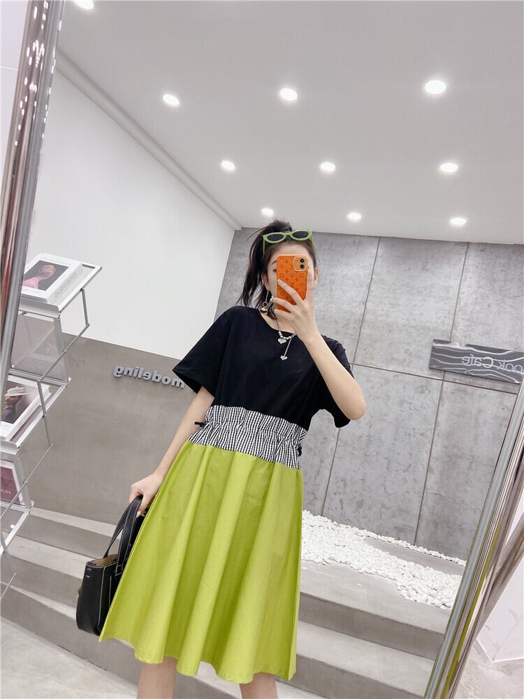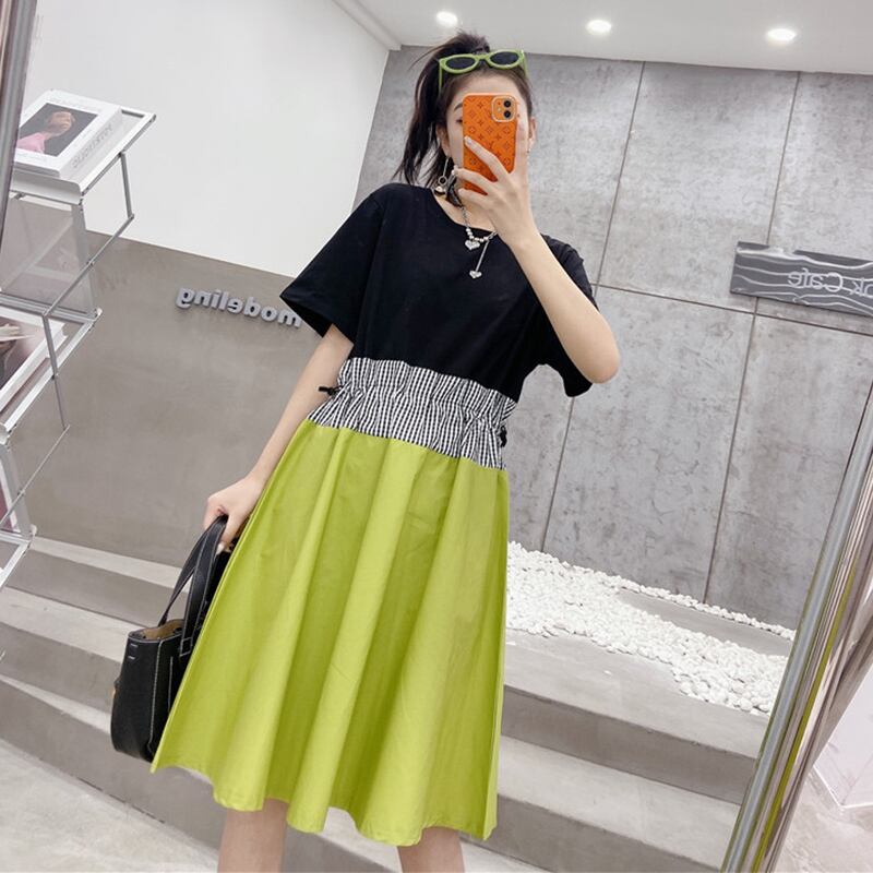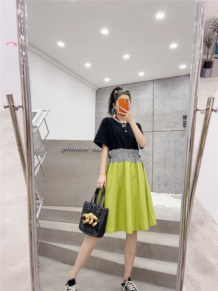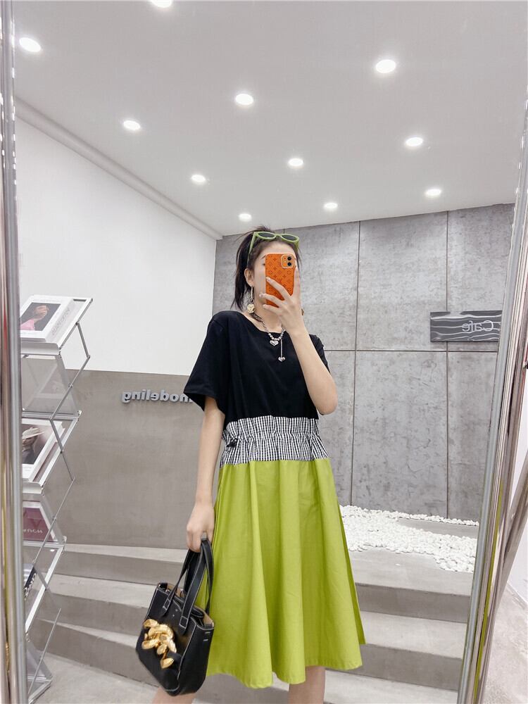 サマーラウンドネック半袖スリーブストレッチウェスト格子柄カラースカート ドレス ショート ハーフスリーブ エラスティック 伸縮 大きめサイズ 夏物 Oネック ステッチ ミックスインファッション57542634775