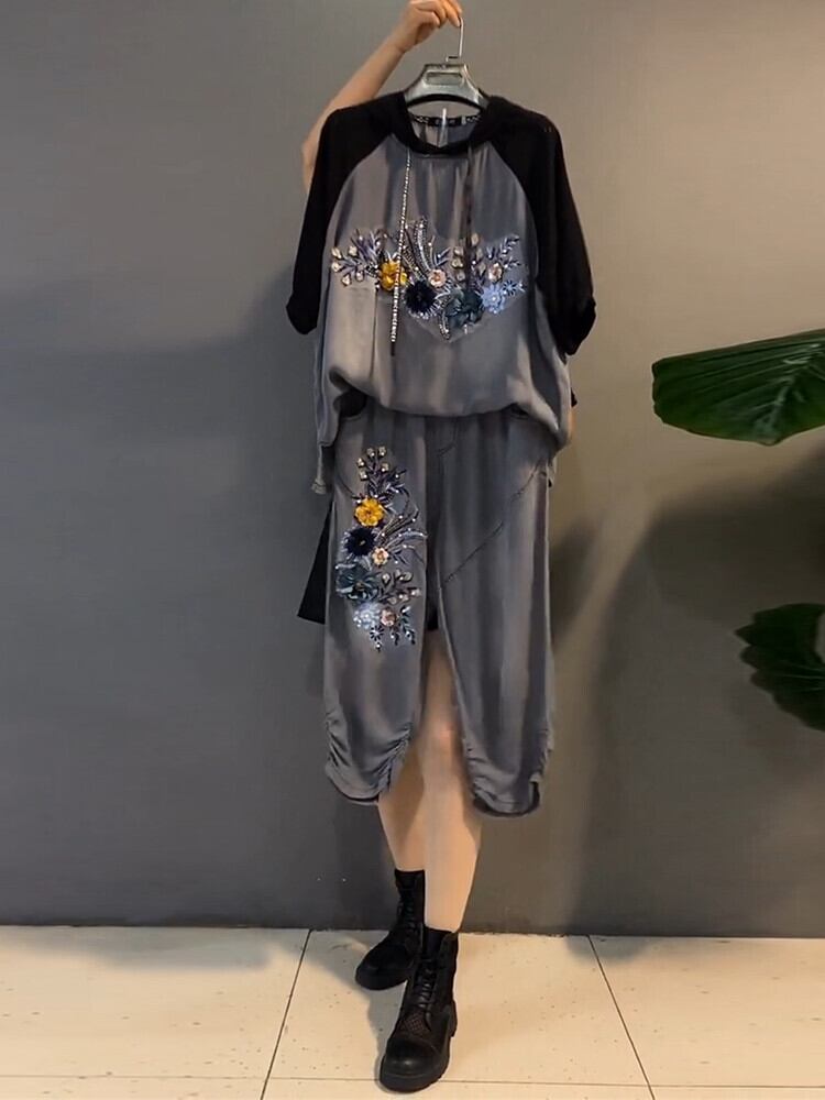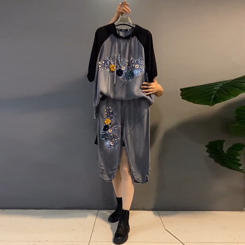 スリムサマースタイルフードFlowerデザイン ブラウス ジーンズ 大きめサイズ 夏物 フラワーデザイン ミックスインファッション56833120032