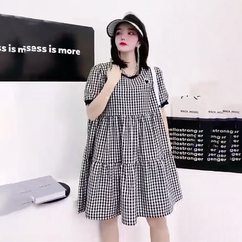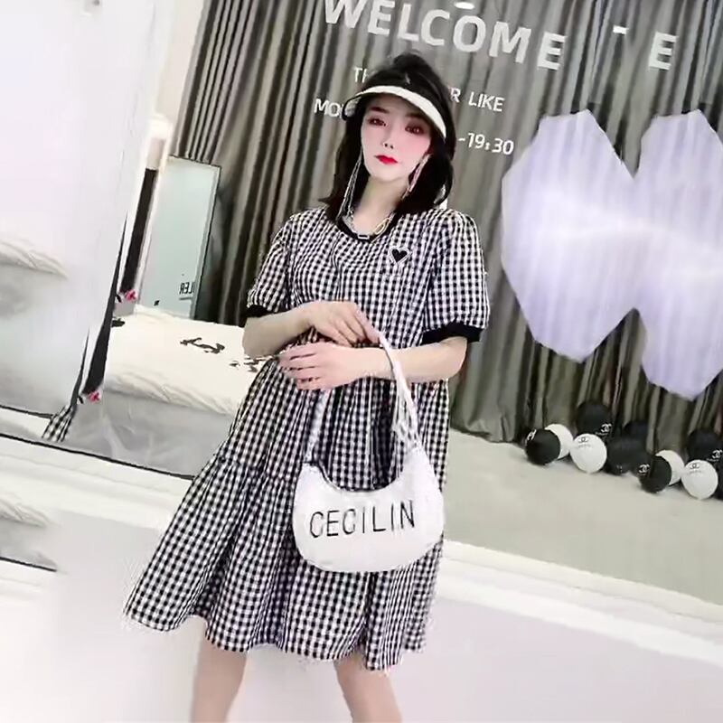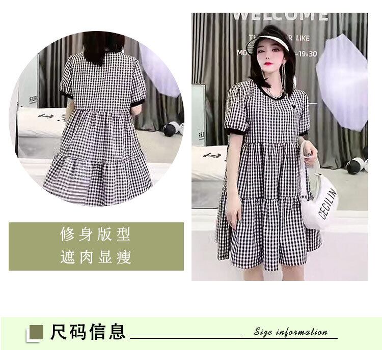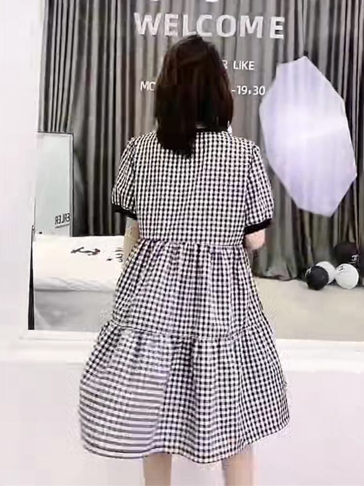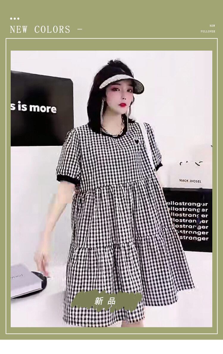 カジュアルサマーラウンドネック格子柄Aラインドレス 大きめサイズ 夏物 Oネック ステッチ ミックスインファッション95704721647