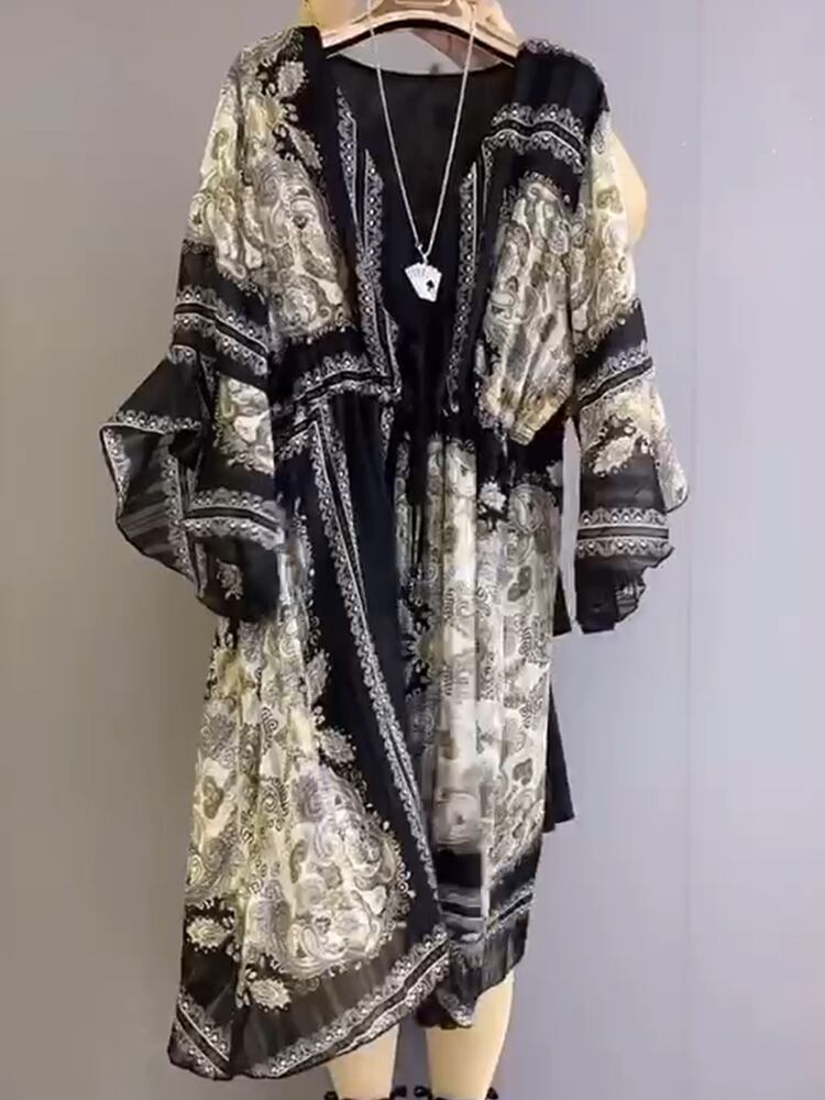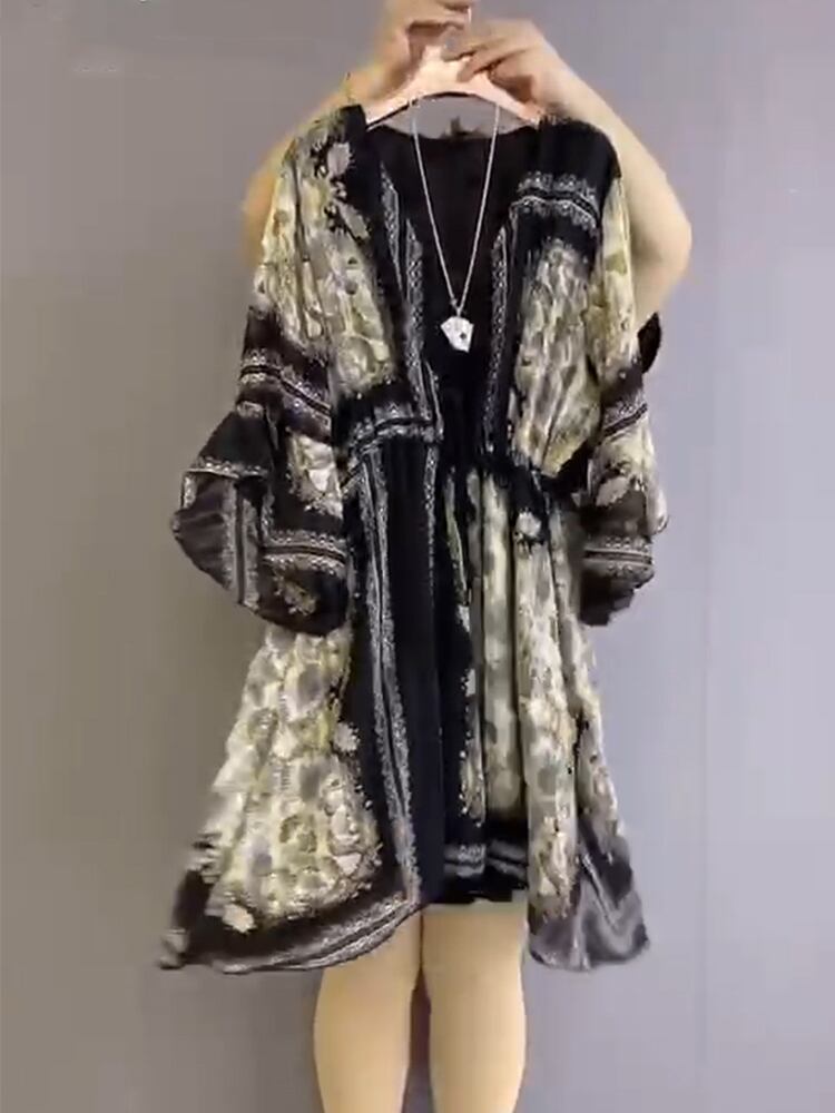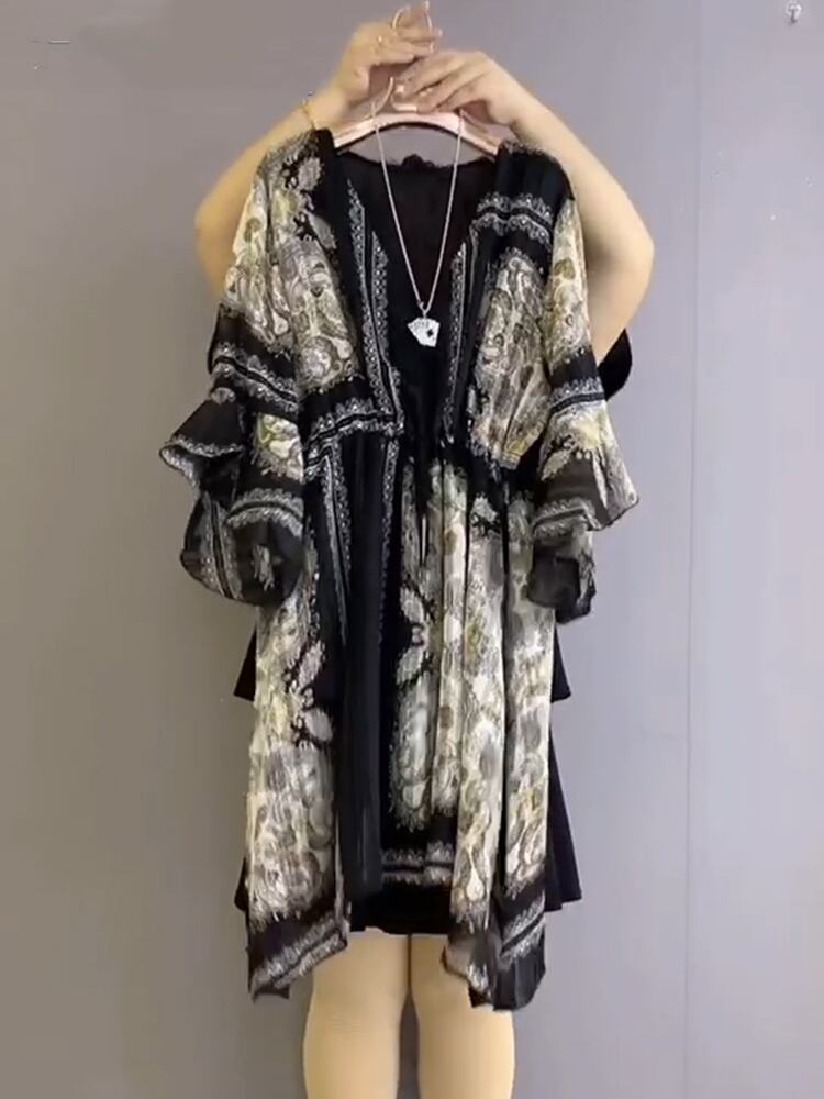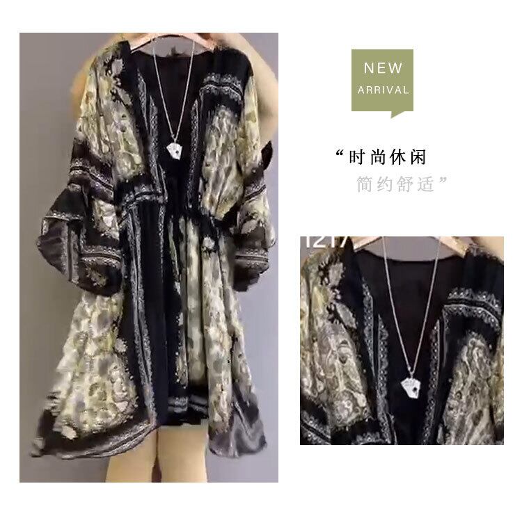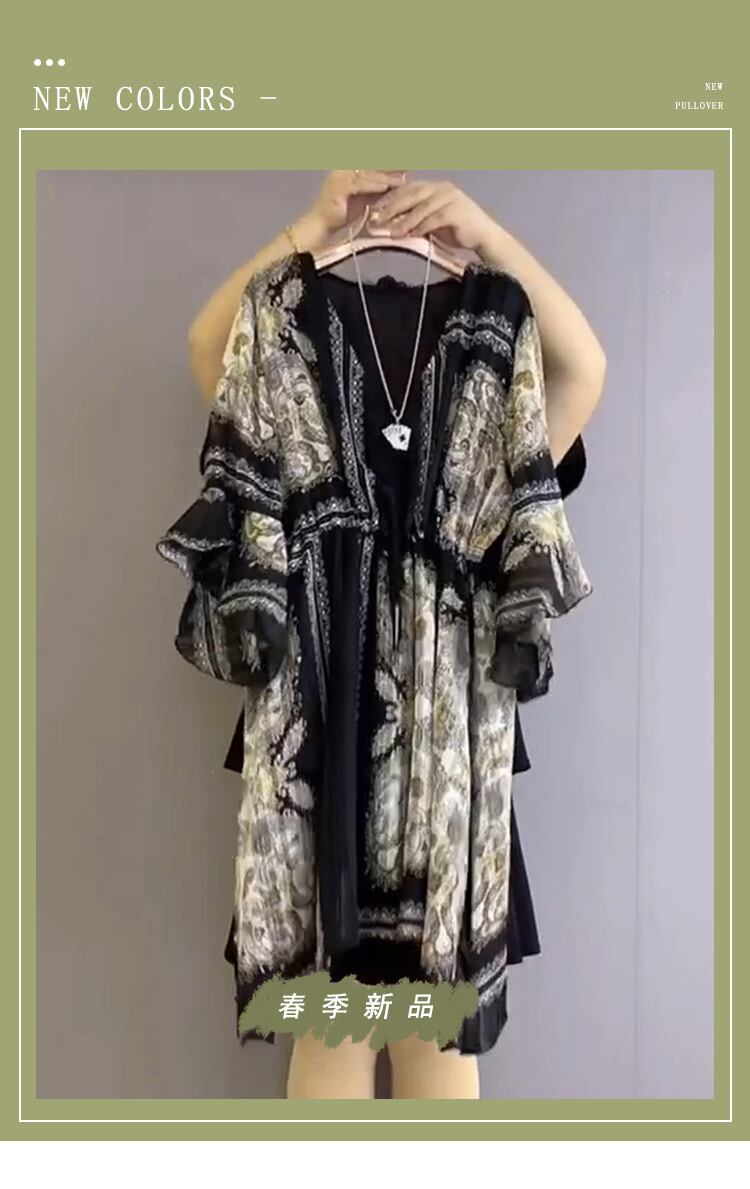 スタンダードスリーブプリントスカート スプリングスタイルVネックウェストドレス レトロ 大きめサイズ 春物 ミックスインファッション27461878640