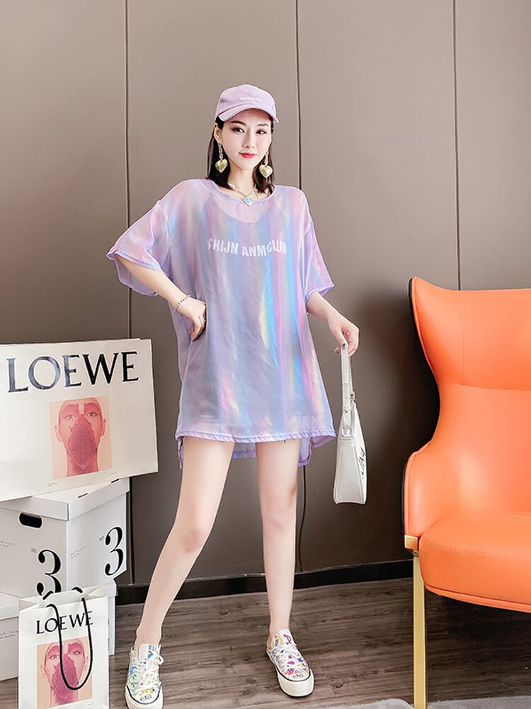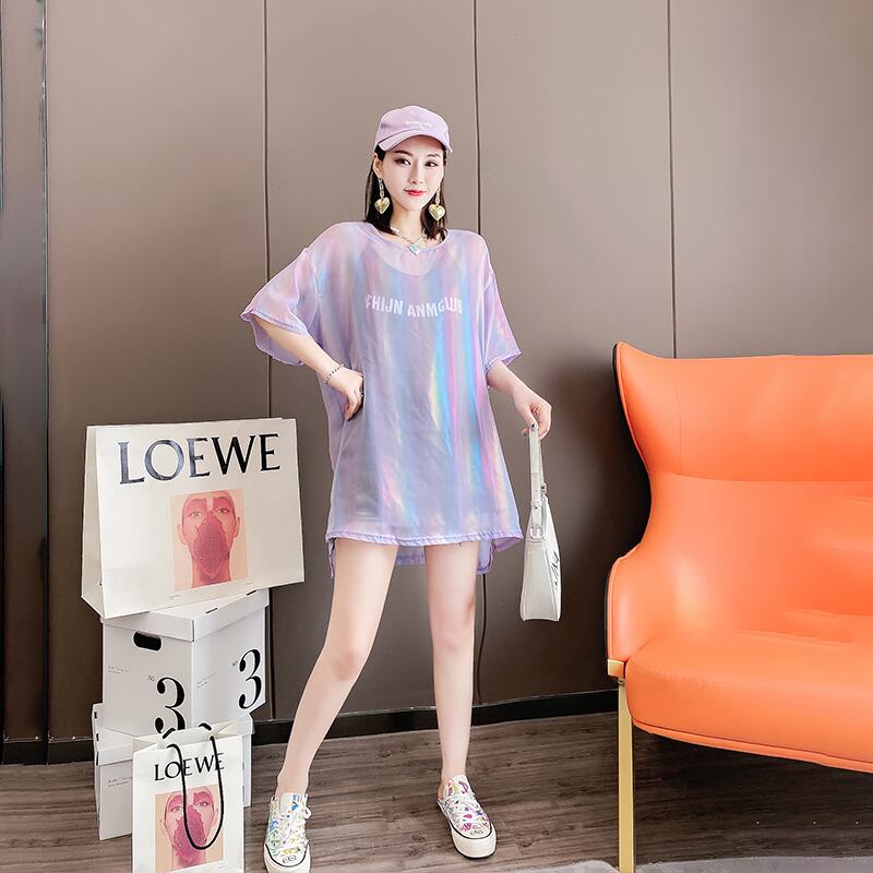 サマーラウンドネックメッシュトップス 大きめサイズ 夏物 Oネック ミックスインファッション85017051045
