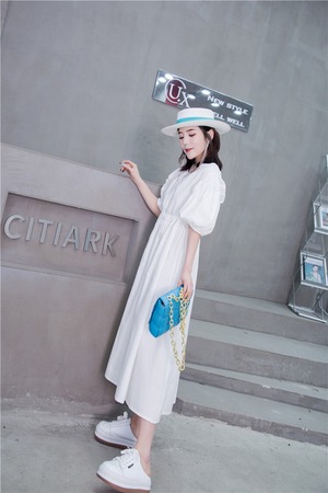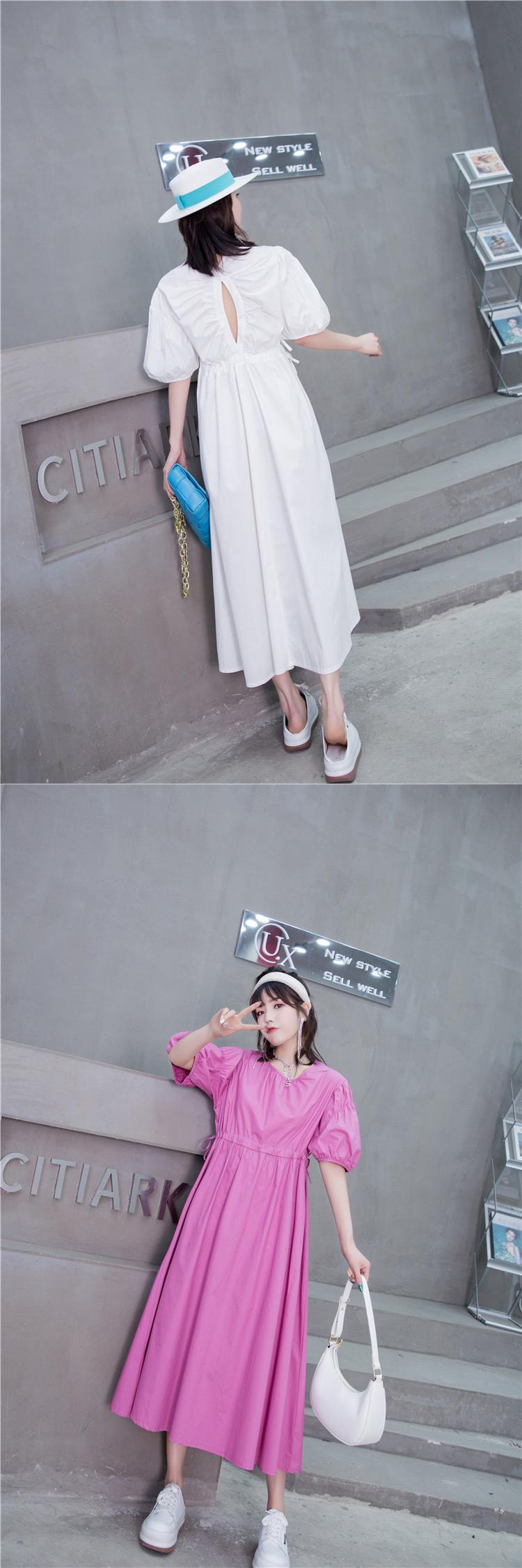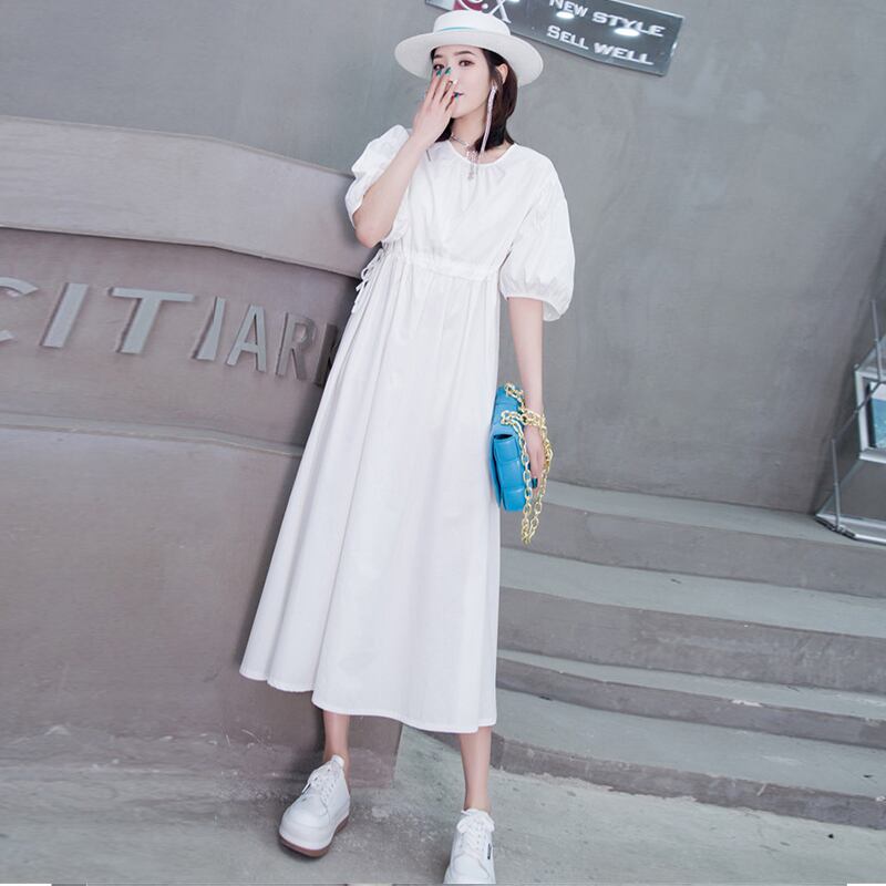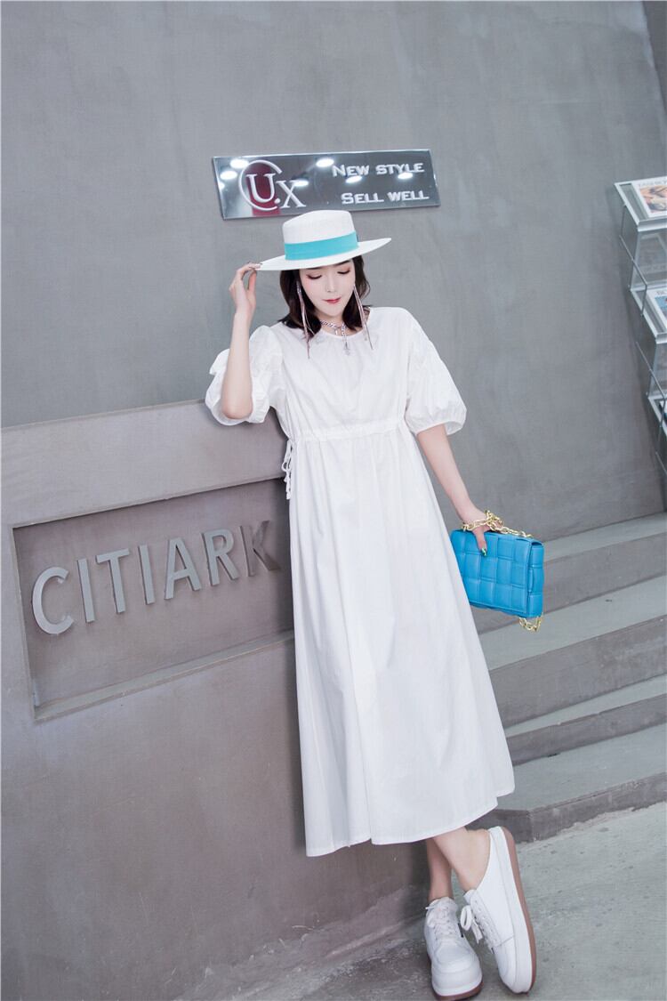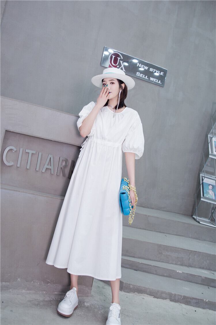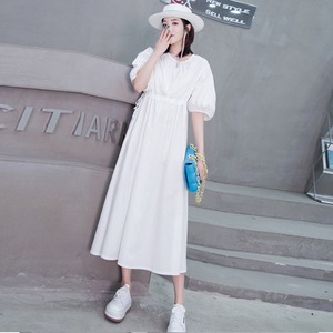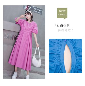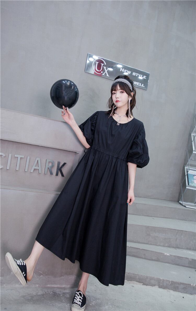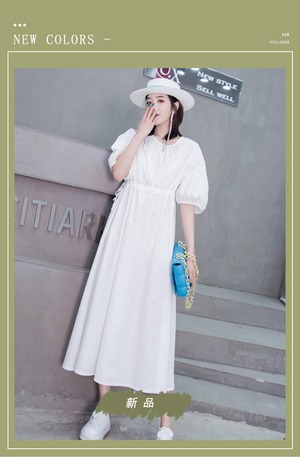 カジュアルウェストギャザースリーブドレス ラウンドネックルーズ薄手スカート 大きめサイズ Oネック ミックスインファッション61787869788