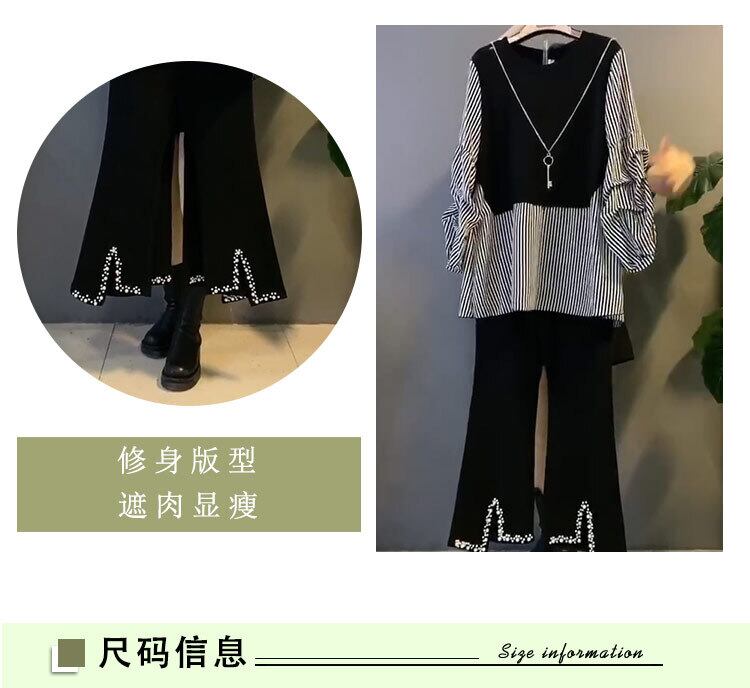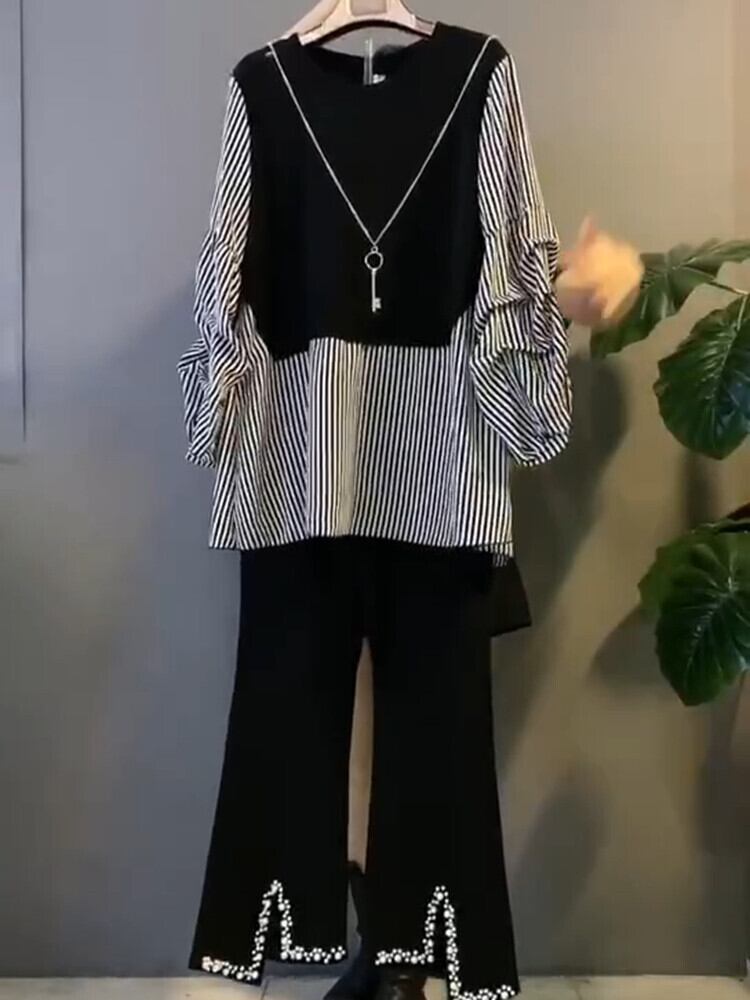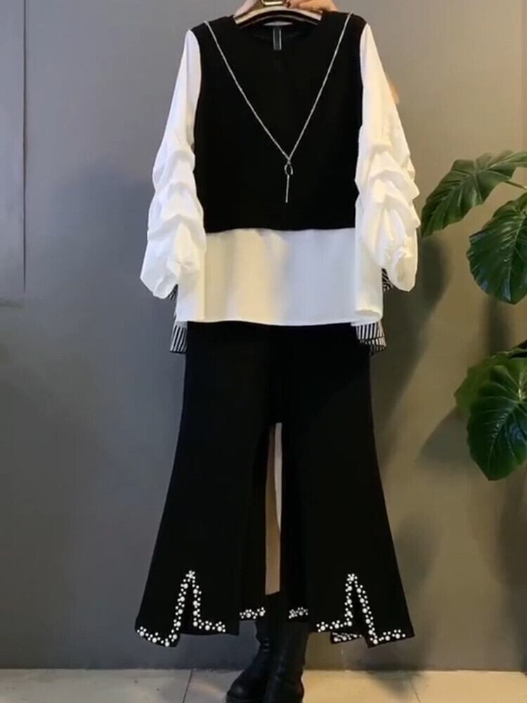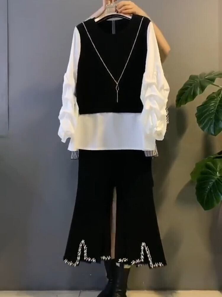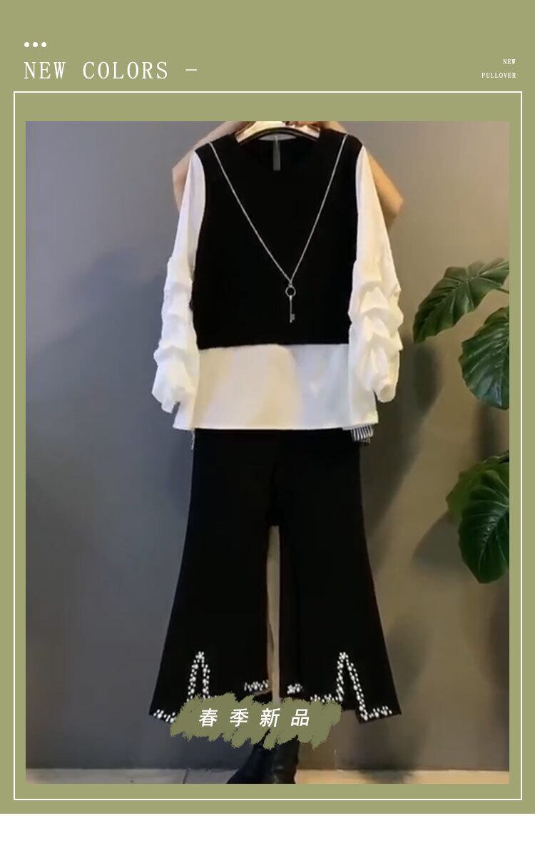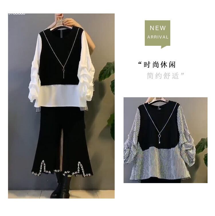 スプリングラウンドネックプリーツシャツ Tシャツ ルーズパンツ ロング 大きめサイズ 春物 Oネック ミックスインファッション8675166090