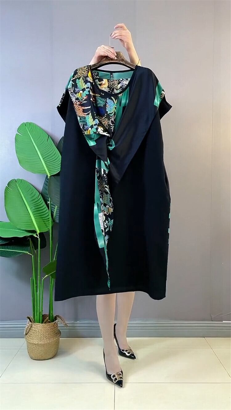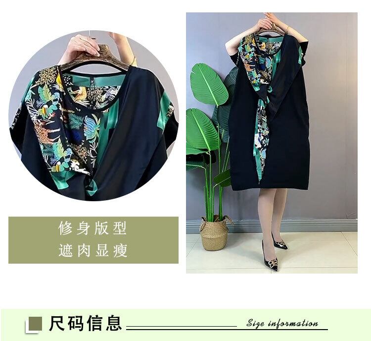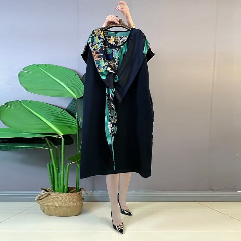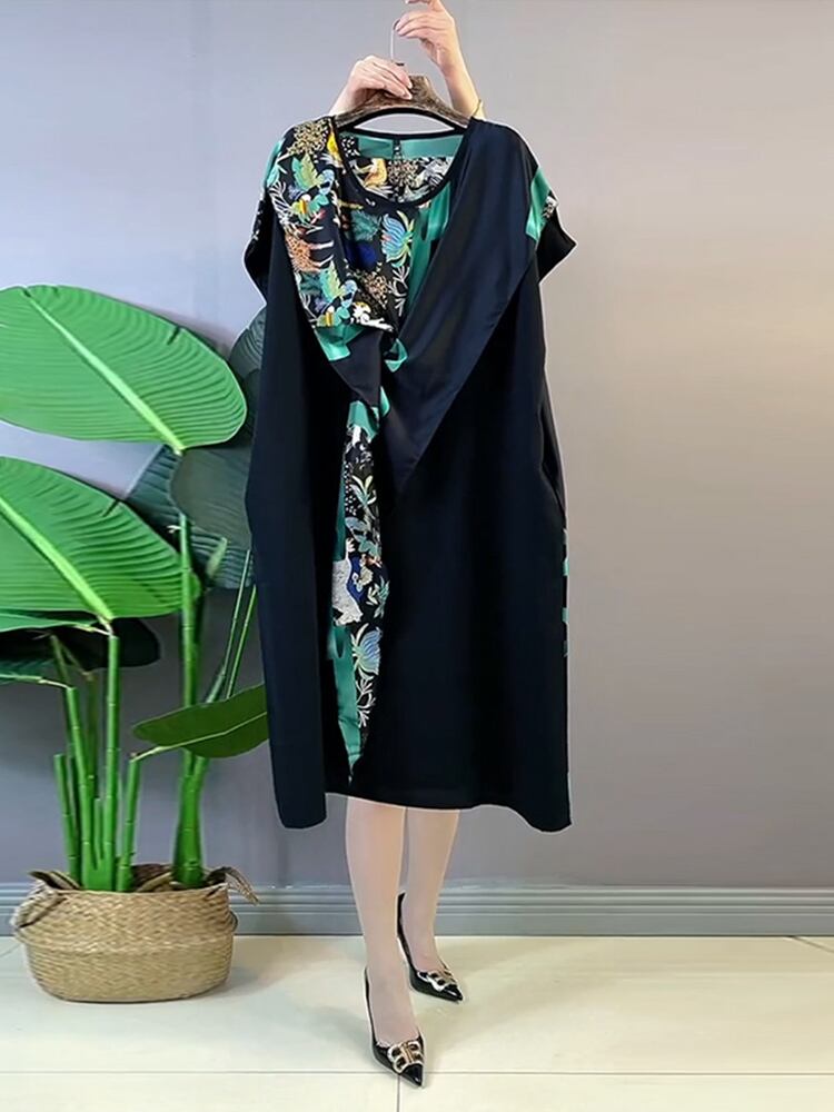 ラウンドネックショートパターンドレス サマースタイル 大きめサイズ 夏物 Oネック ステッチ ミックスインファッション24071551493