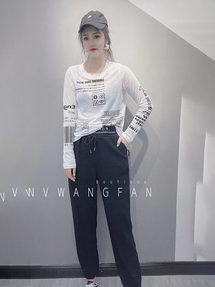 サマーラウンドネックプリントTシャツ ルーズウェストカジュアルパンツ ロング 大きめサイズ 夏物 Oネック ミックスインファッション73755975779