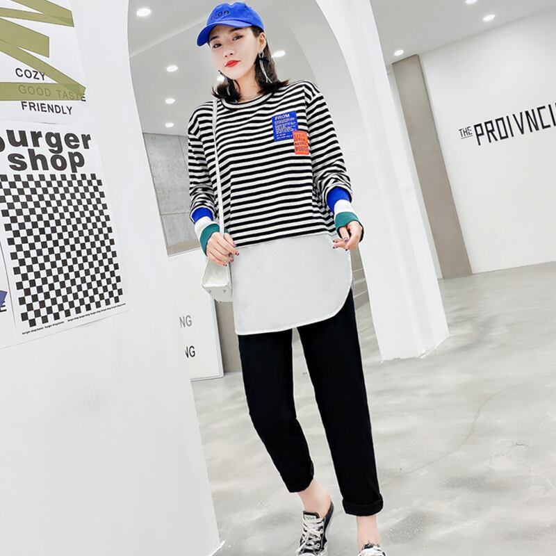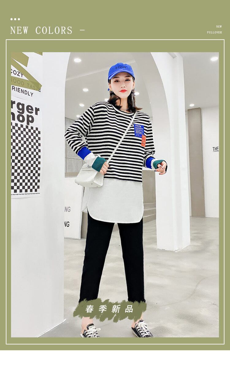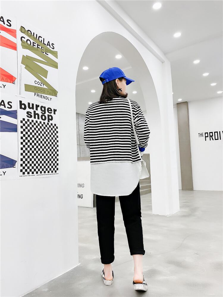 ラウンドネックストライプシャツ スプリングオータムスタイルTシャツ ロング 大きめサイズ 春物 秋物 Oネック ミックスインファッション8991092248