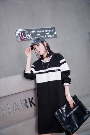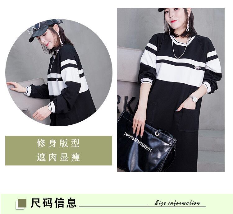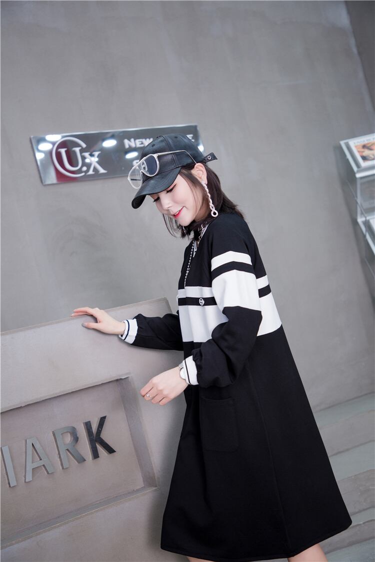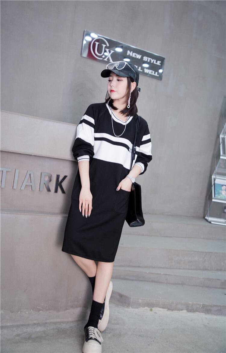 スプリングスカート ブラックホワイトストライプダブルポケットセーター ドレス ストリート 大きめサイズ 春物 ミックスインファッション40206384552