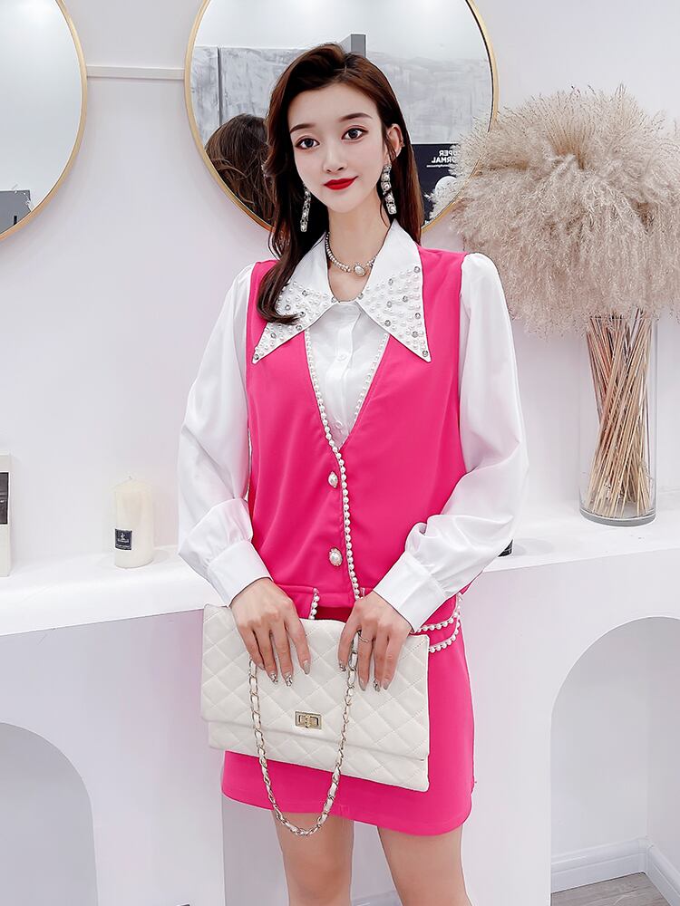 色:ピンクのスーツと白シャツのスリーピーススーツ,黒袖白シャツスリーピーススーツ