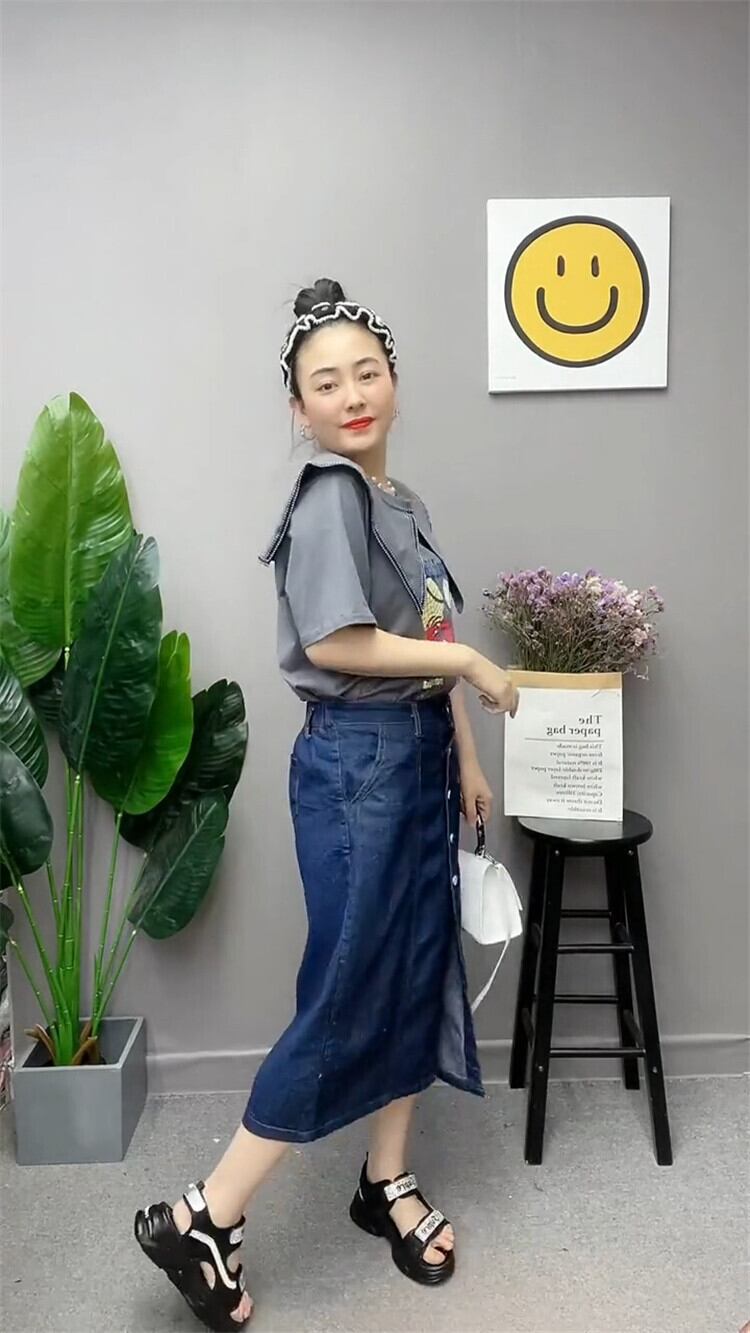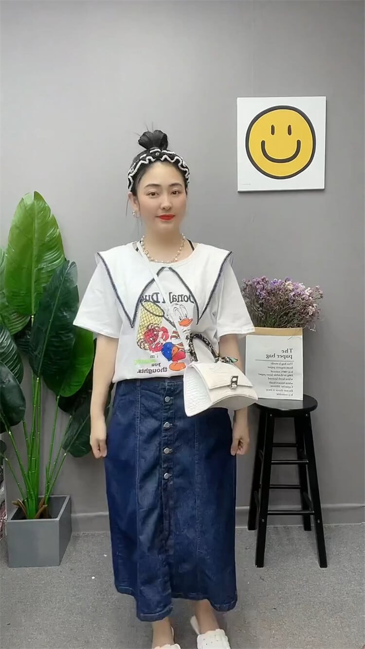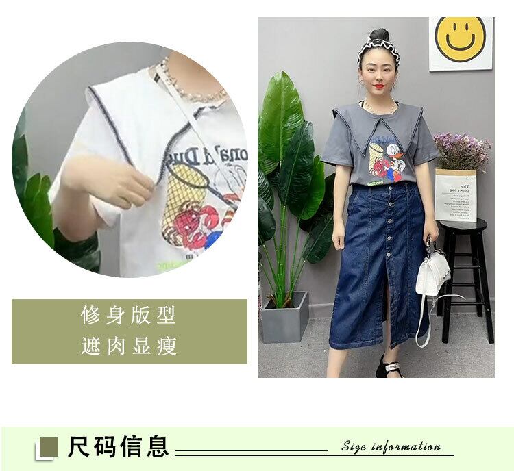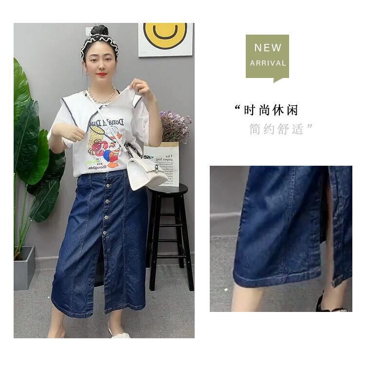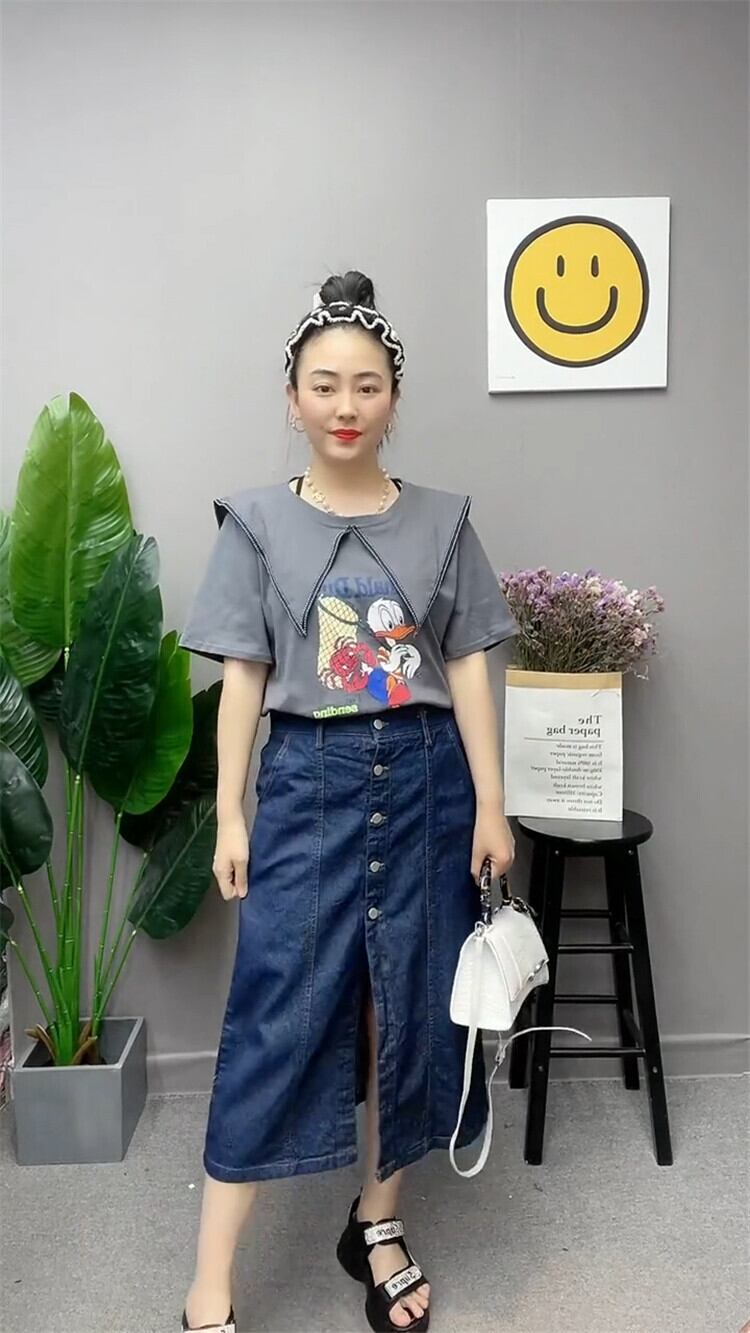 サマーネイビーカラーパターンTシャツ スカート ボタン 大きめサイズ 夏物 ミックスインファッション6953185101