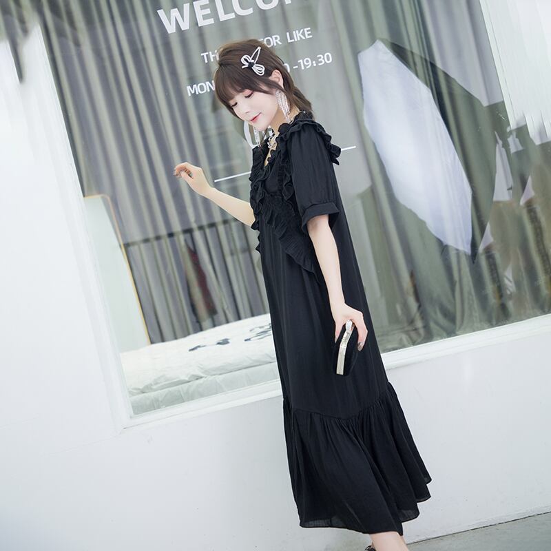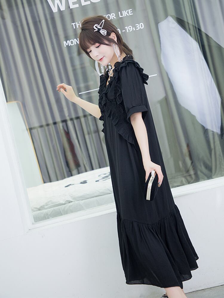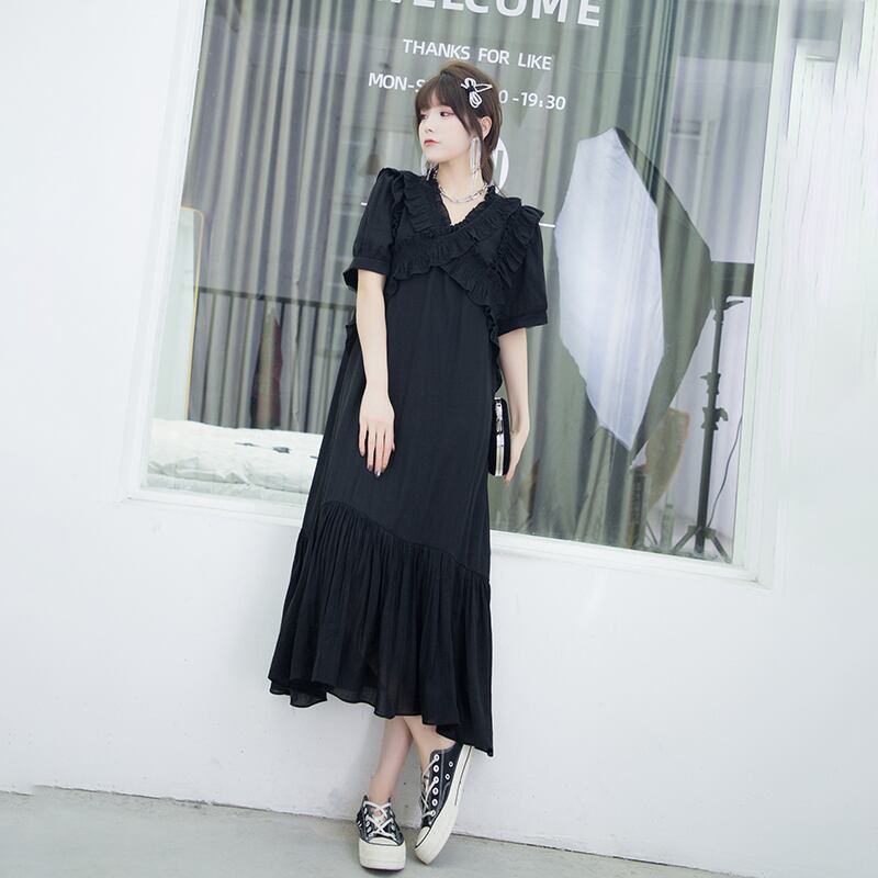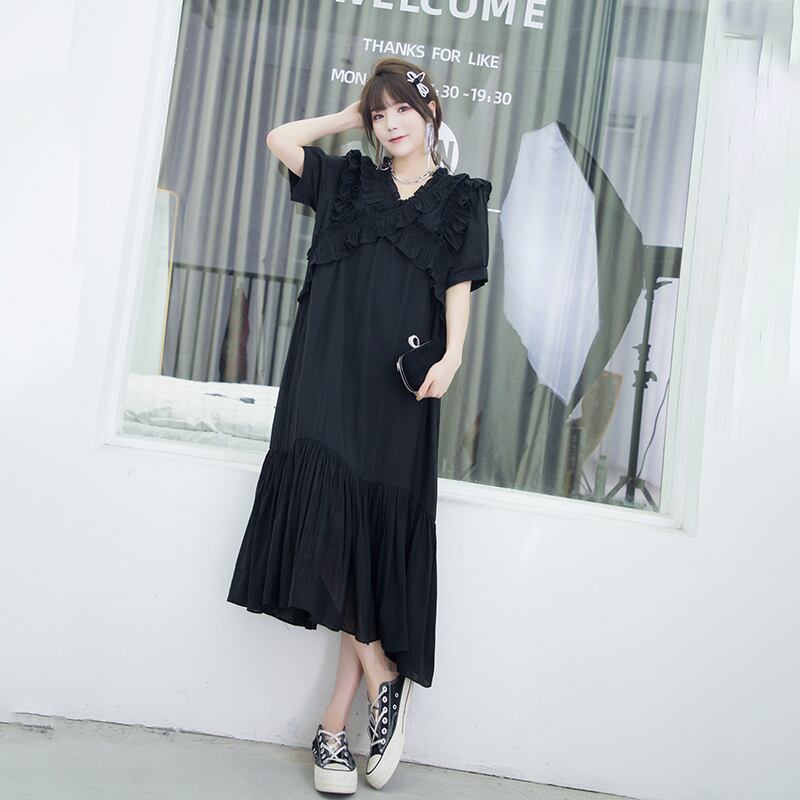 サマーVネックロング薄手ドレス 大きめサイズ 夏物 ミックスインファッション53716142081