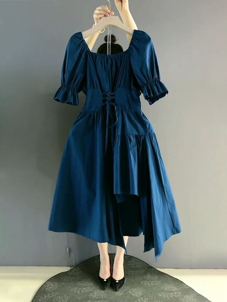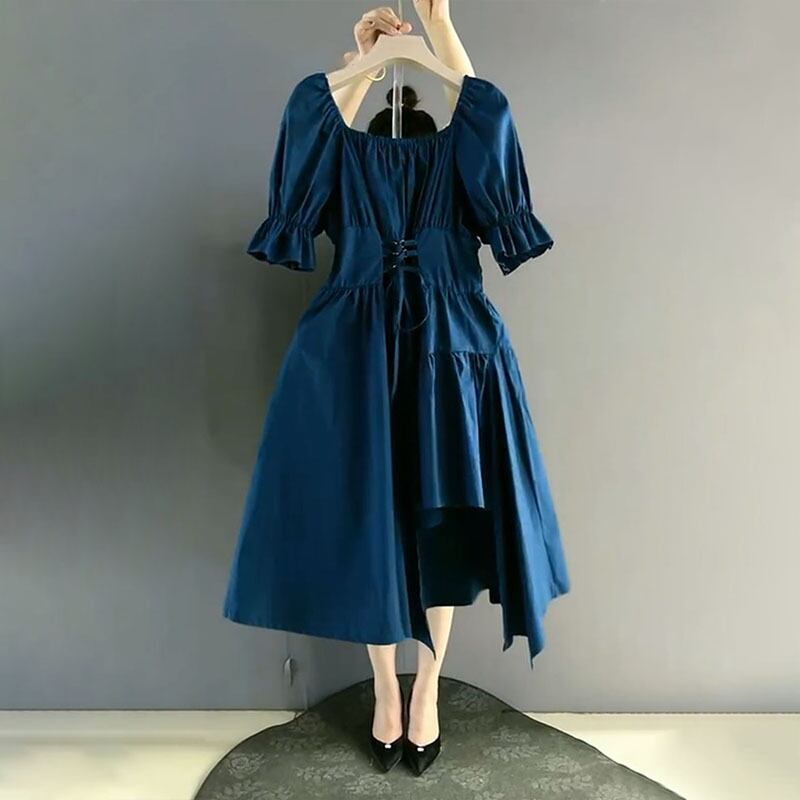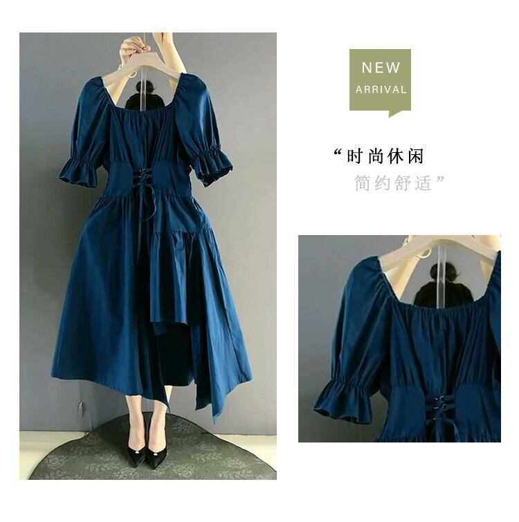 スタンダードカラー半袖スリーブクロスベルト ウェスト薄手ドレス ショート レトロ レース ハーフスリーブ 大きめサイズ ハーネス スクウェア ミックスインファッション25746720744