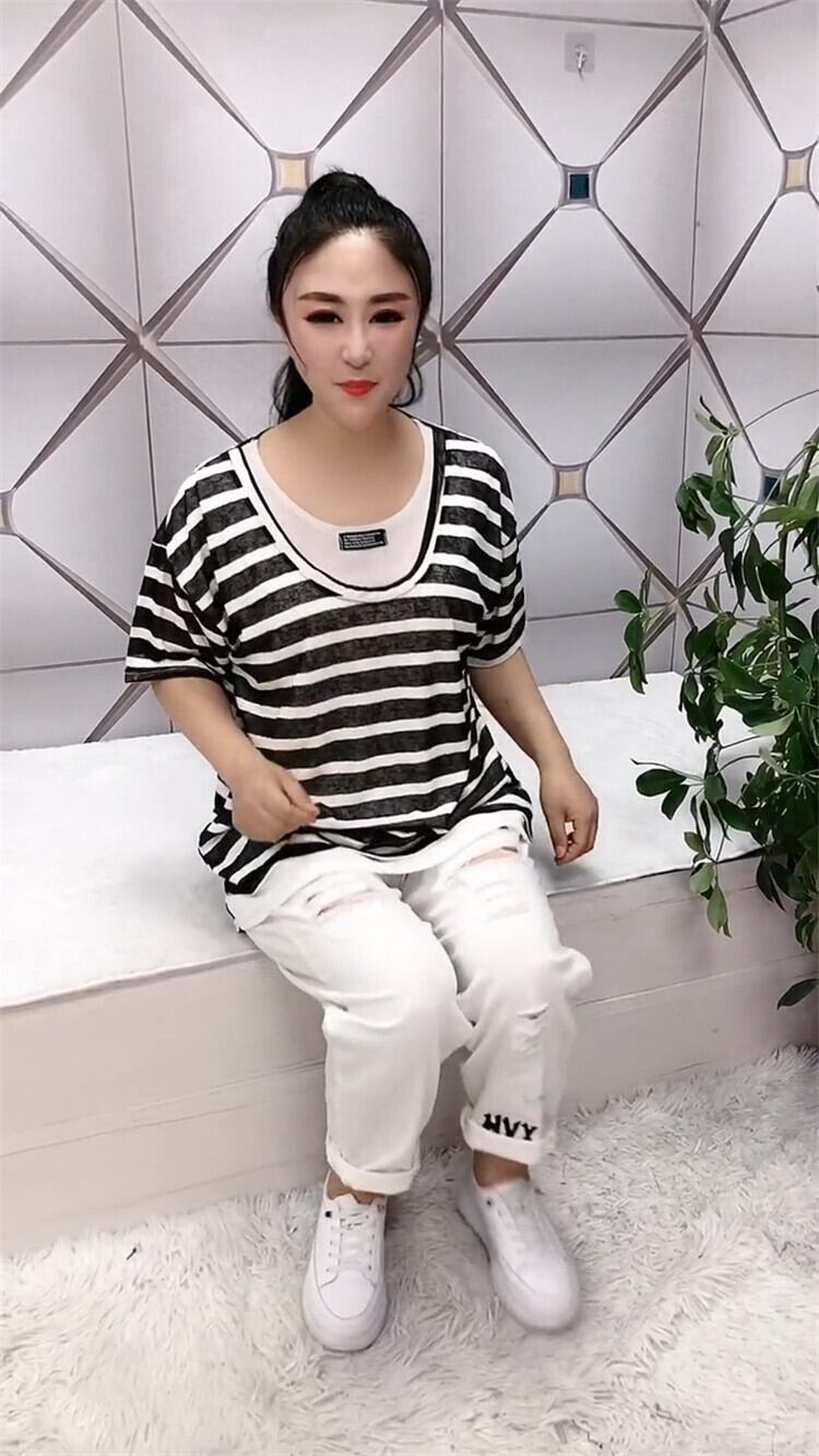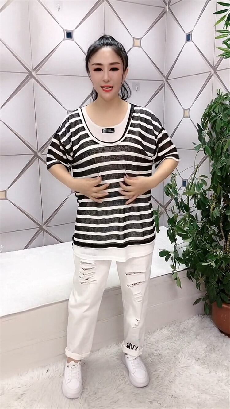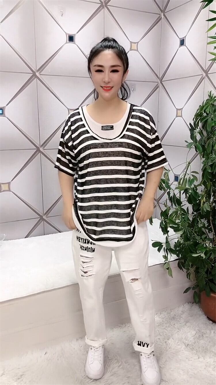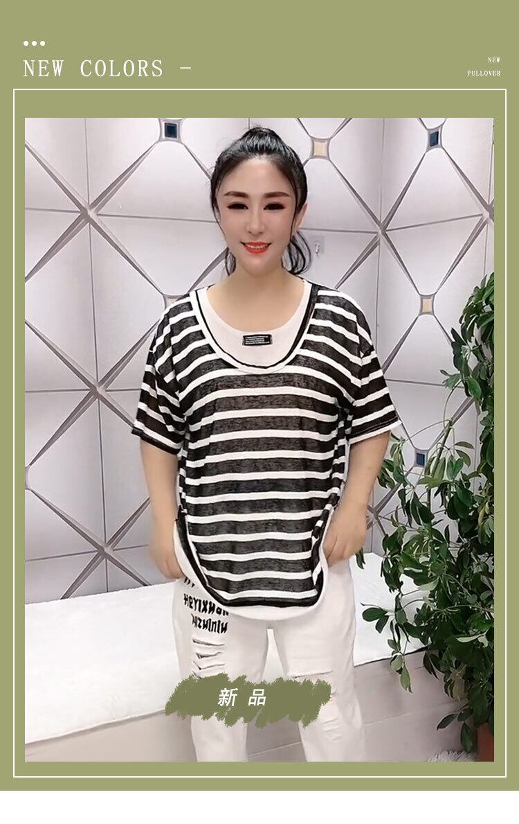 サマーシャツ ストライプTシャツ ラウンドネック 大きめサイズ 夏物 Oネック ミックスインファッション90267831773