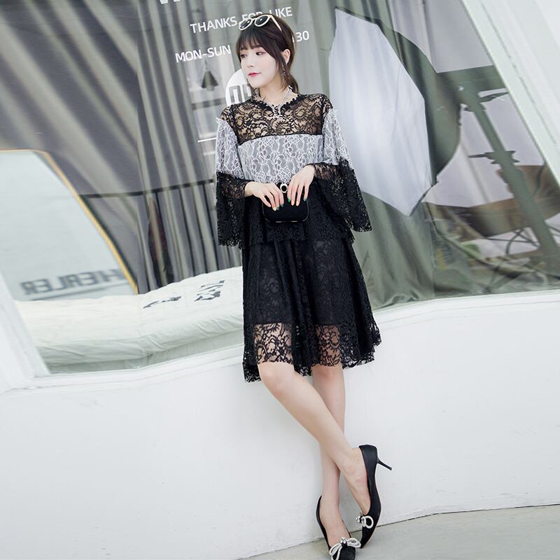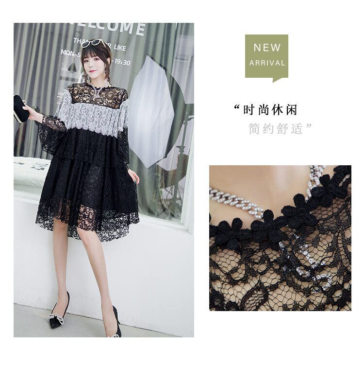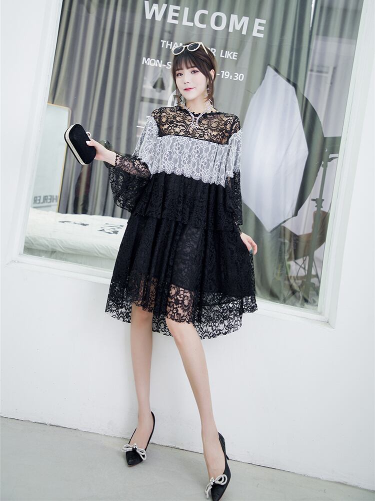 ラウンドネックカラーレースシャツ ドレス 大きめサイズ Oネック ミックスインファッション26613903679