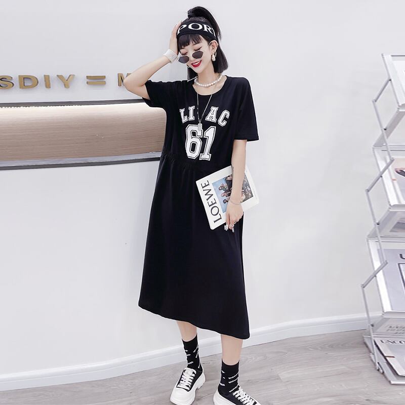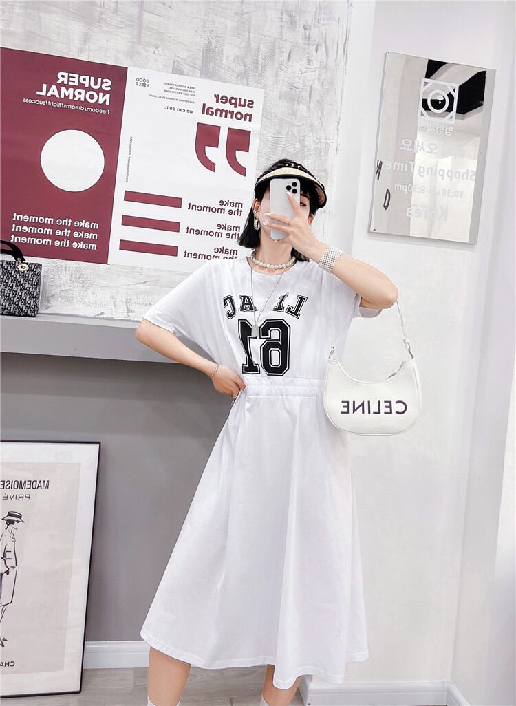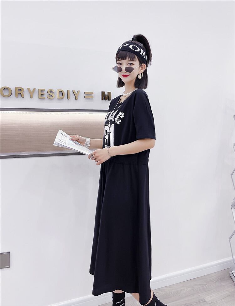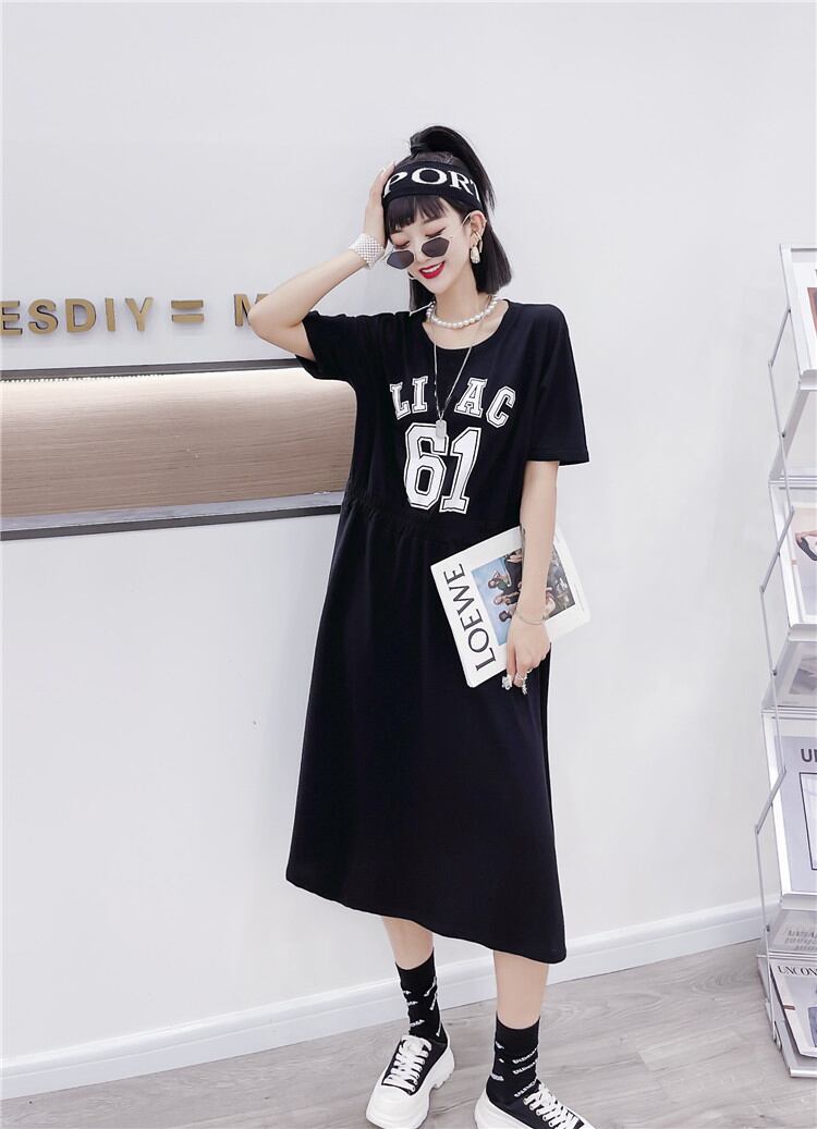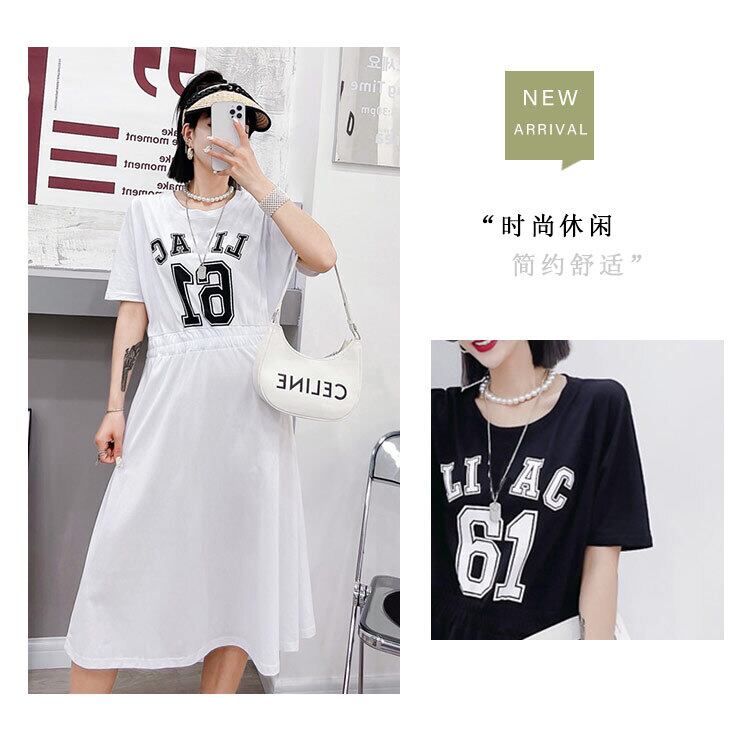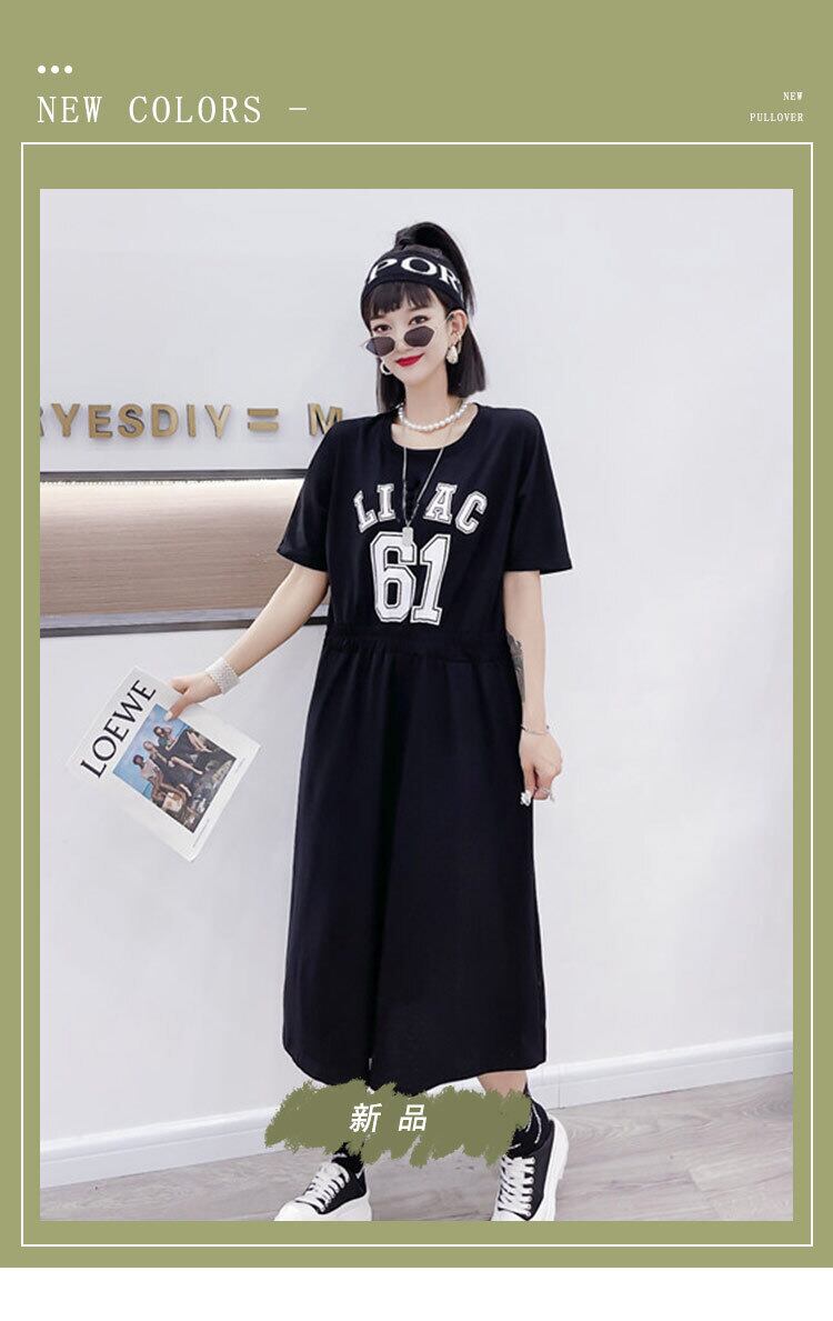 サマースタイルルーズラウンドネックプリントウェストカジュアルTシャツ スカート 大きめサイズ 夏物 Oネック ミックスインファッション30312376232