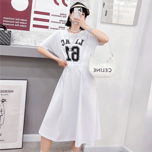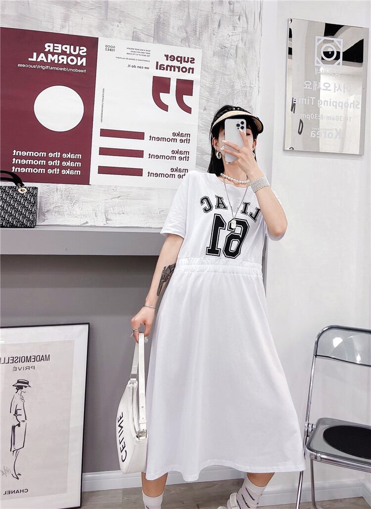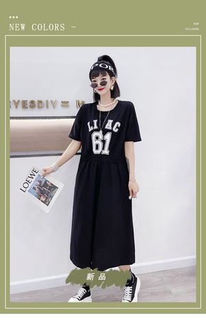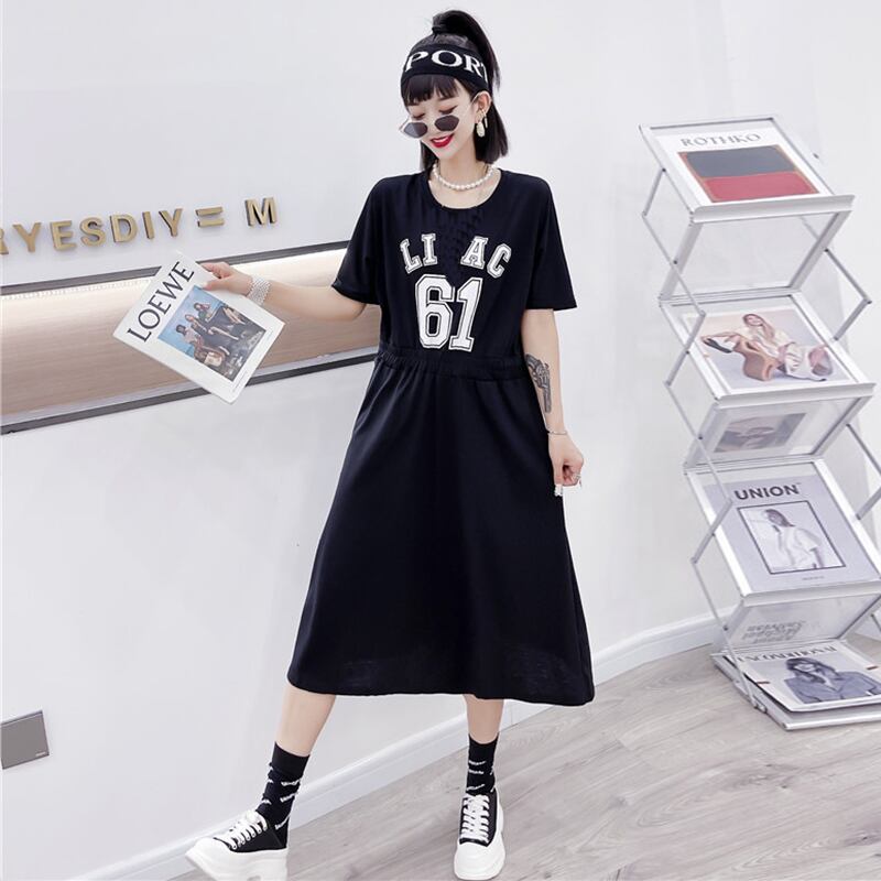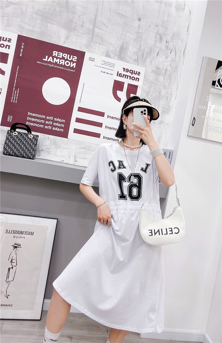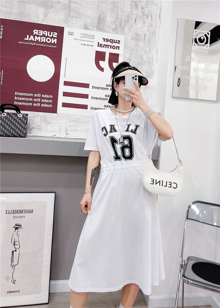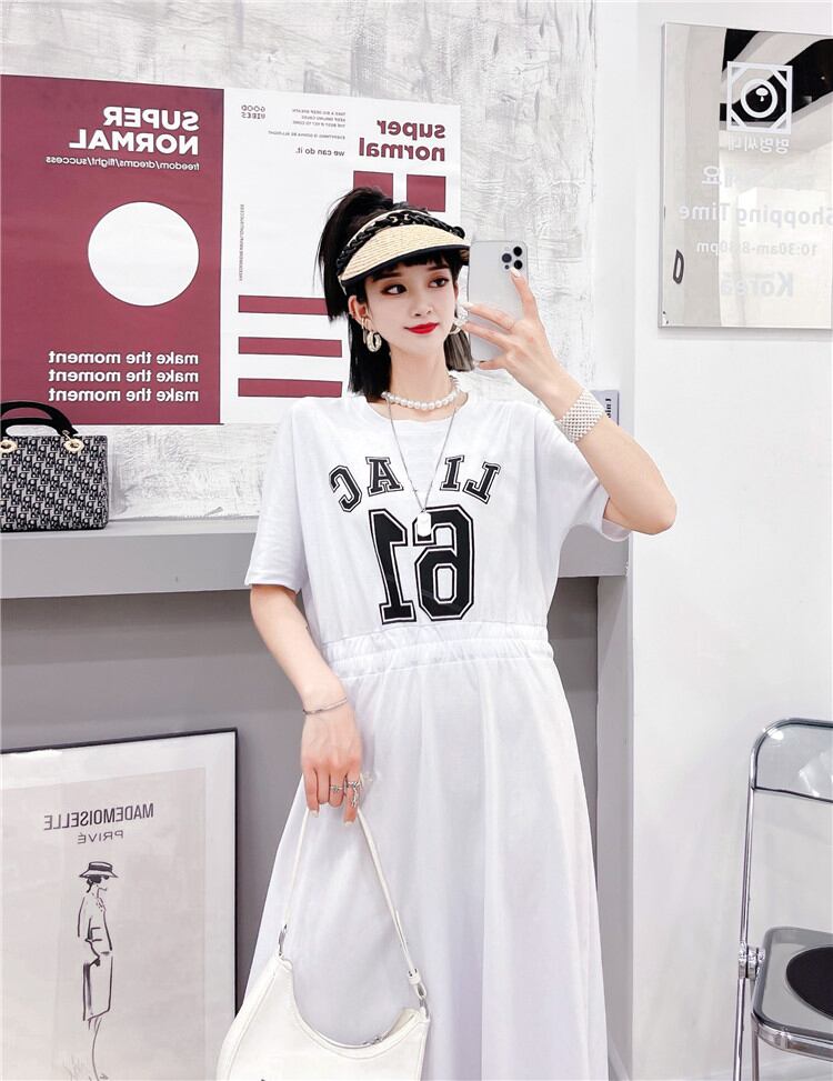 サマースタイルルーズラウンドネックプリントウェストカジュアルTシャツ スカート 大きめサイズ 夏物 Oネック ミックスインファッション30312376232