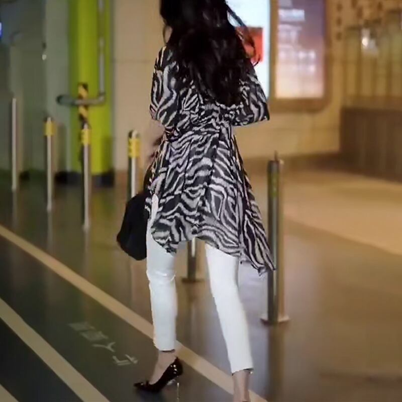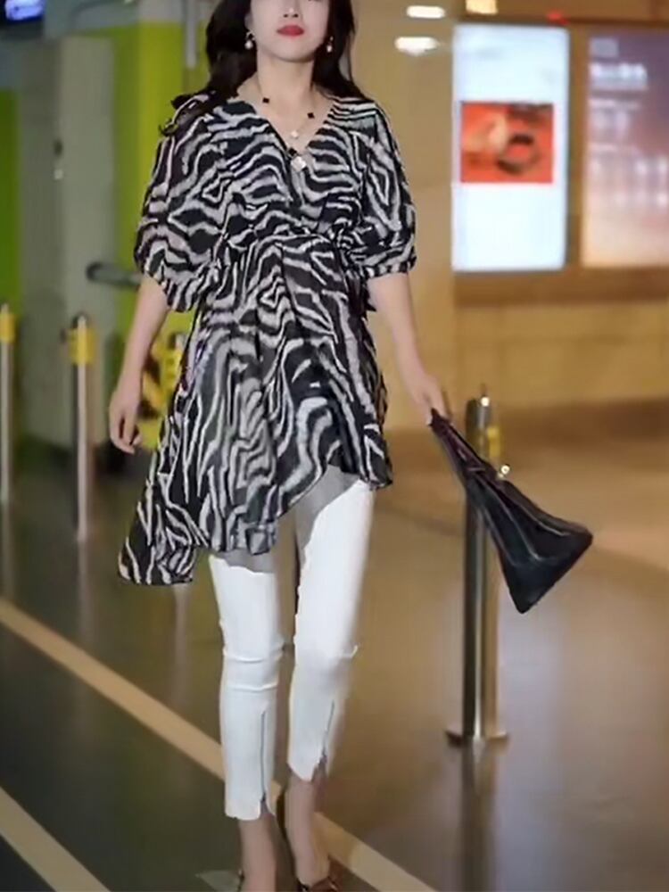 サマースタイルVネックスリーブウェスト薄手ストライプトップス 大きめサイズ 夏物 ミックスインファッション7601480670