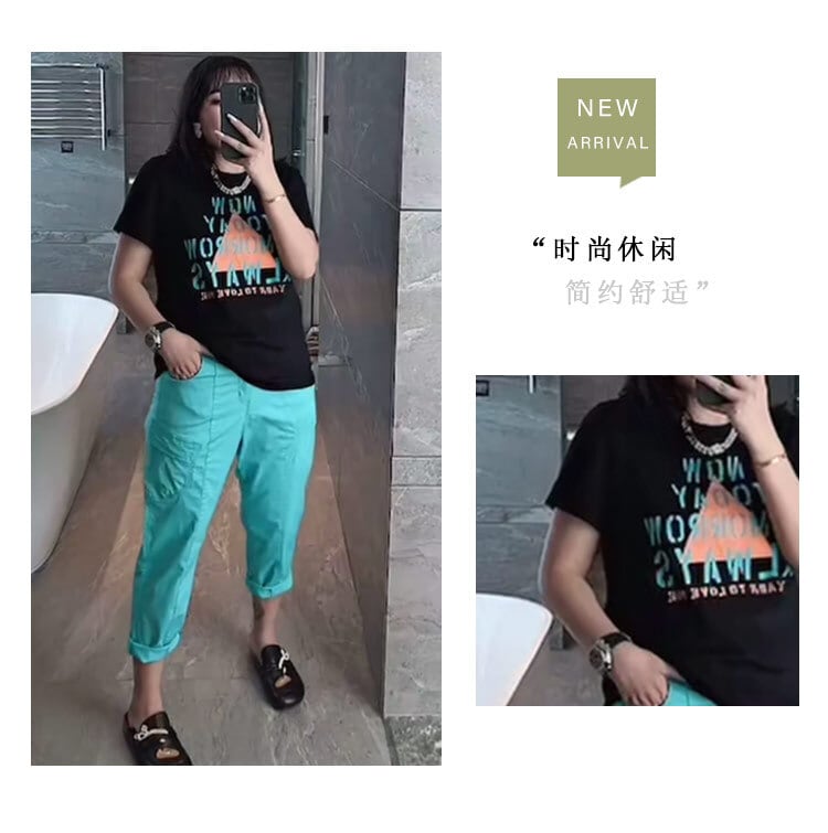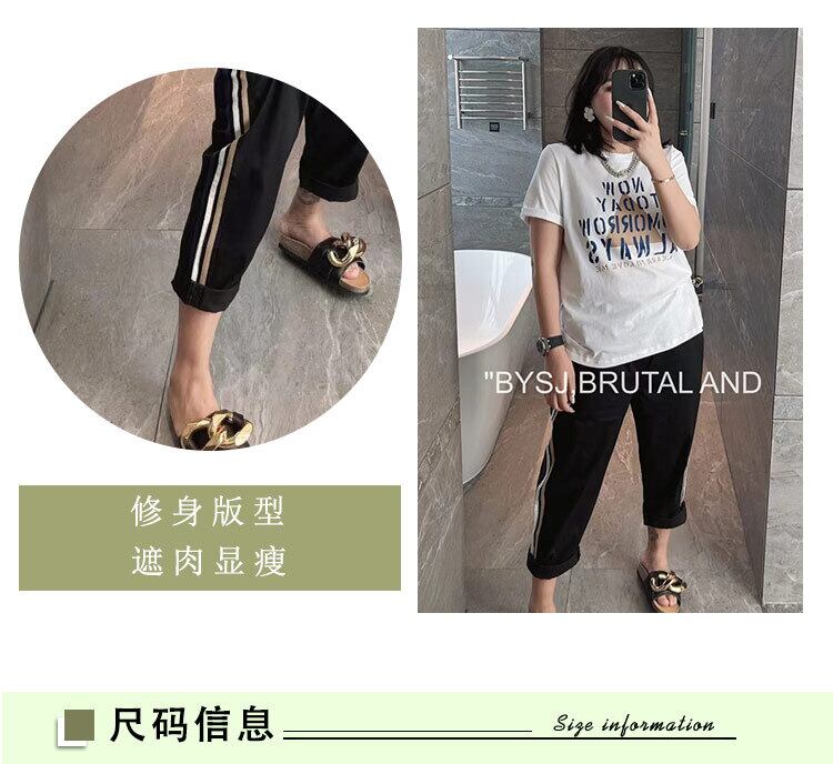 ラウンドネックショートシャツ トライアングルパターンプリントトップス サイドストライプカジュアルパンツ 大きめサイズ Oネック ミックスインファッション20201621181