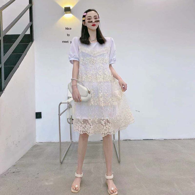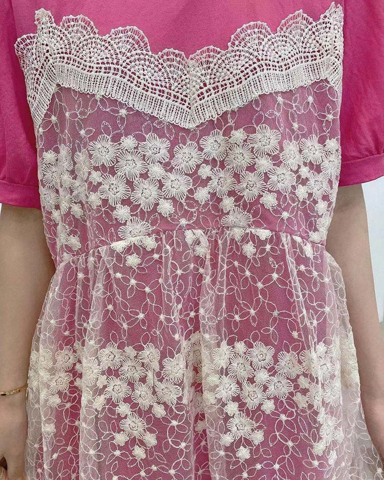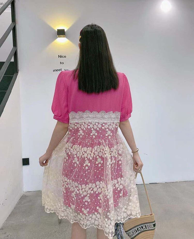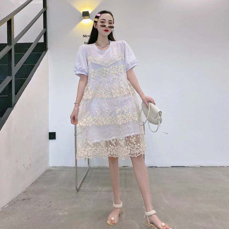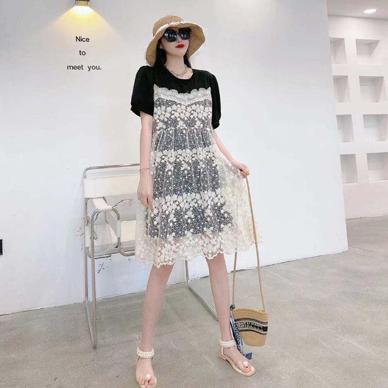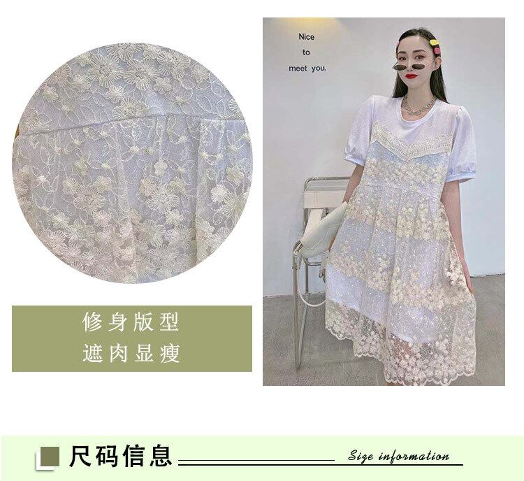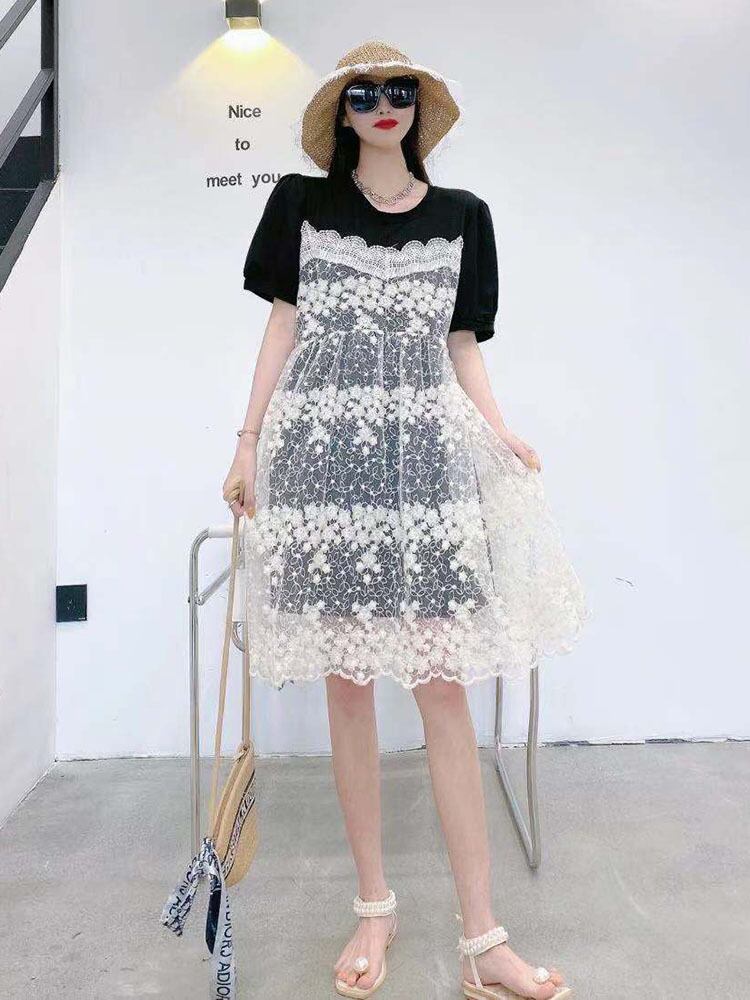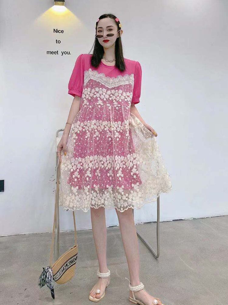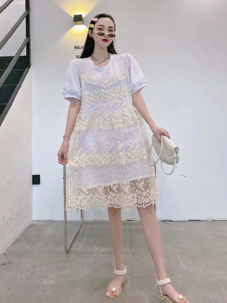 サマーラウンドネックレースドレス 大きめサイズ 大人ガーリー スウィート キュート カジュアル 夏物 Oネック ミックスインファッション18818655467