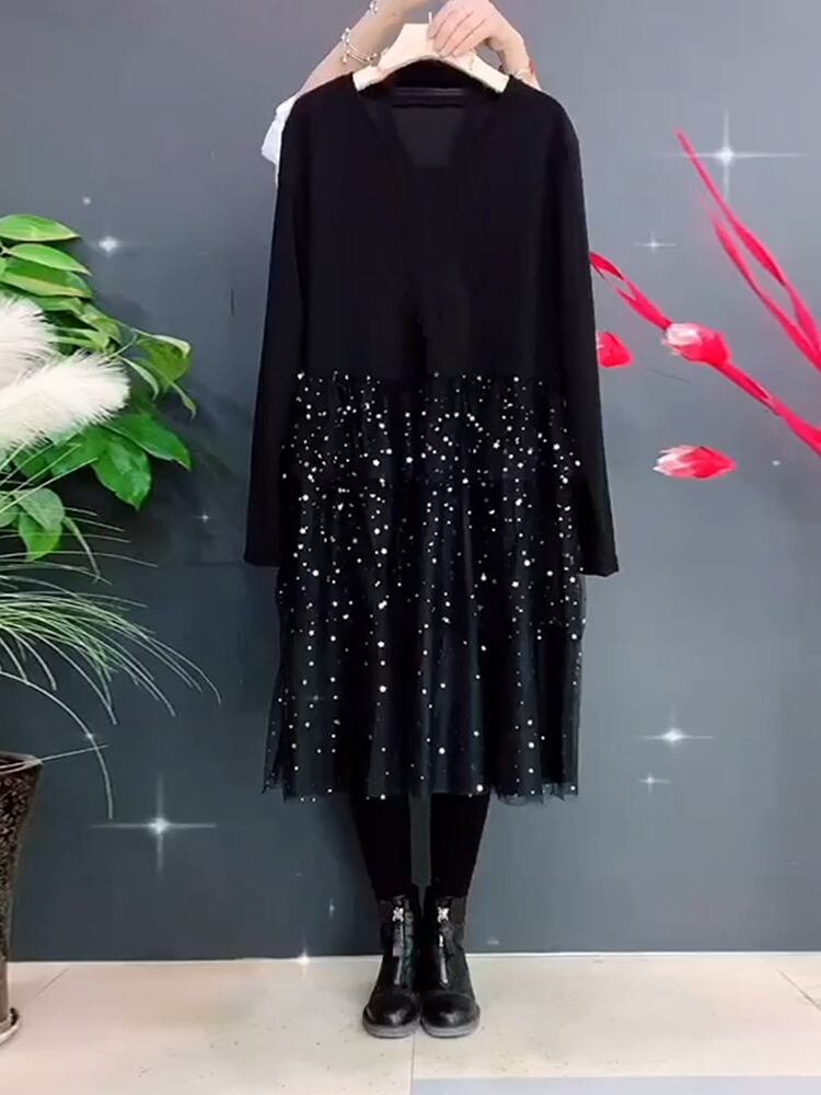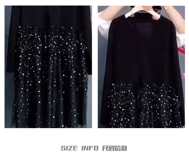 スプリングカジュアルスカート Vネックメッシュドレス ロング 大きめサイズ 春物 ステッチ ミックスインファッション17056314936