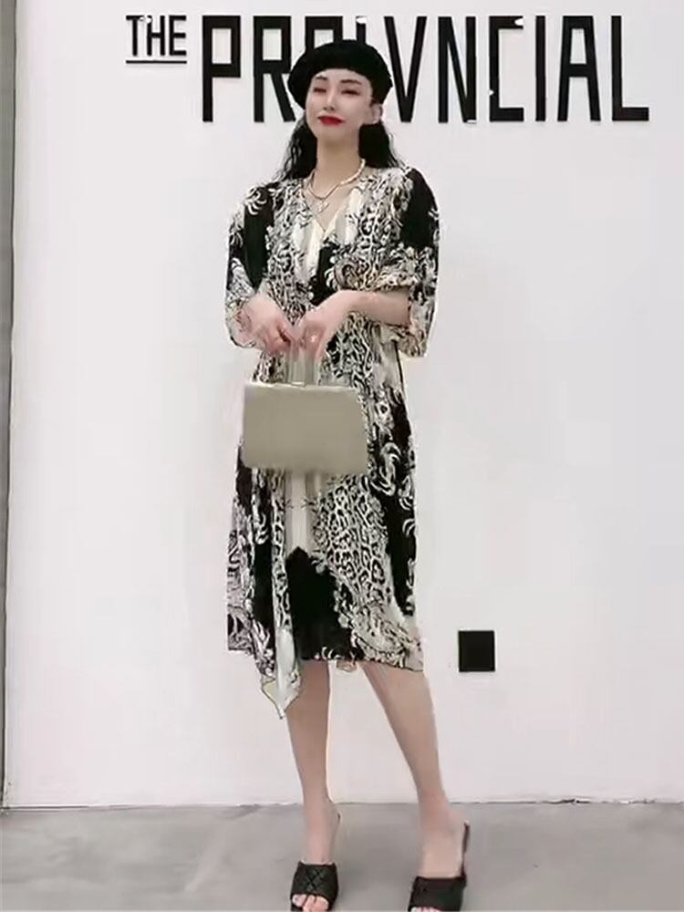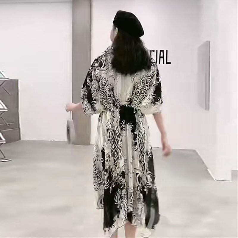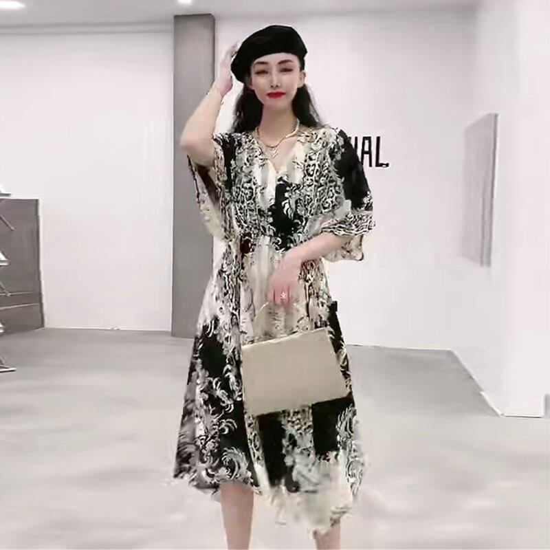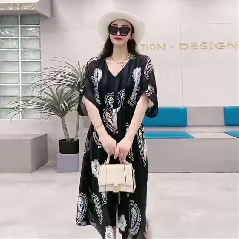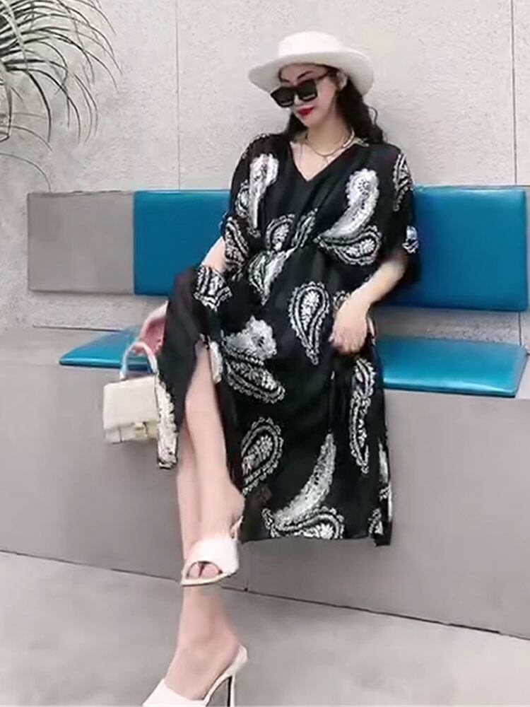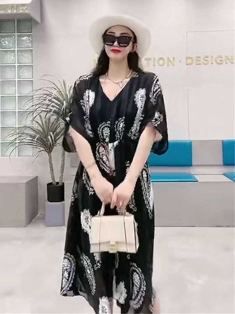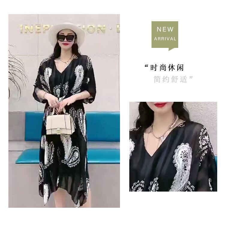 サマーVネックパターンウェスト薄手ドレス 大きめサイズ 夏物 ミックスインファッション10003611604