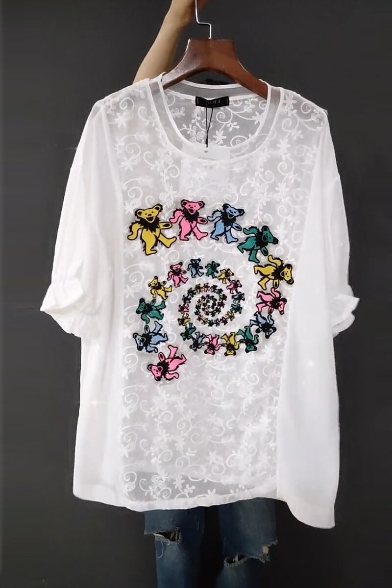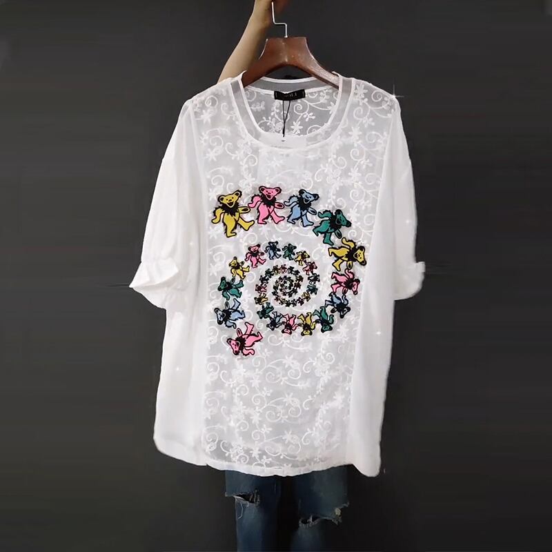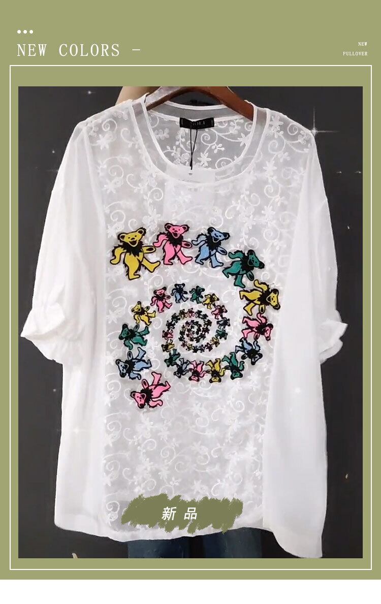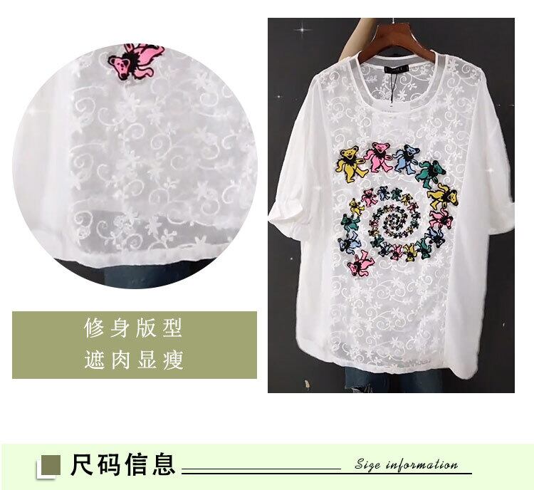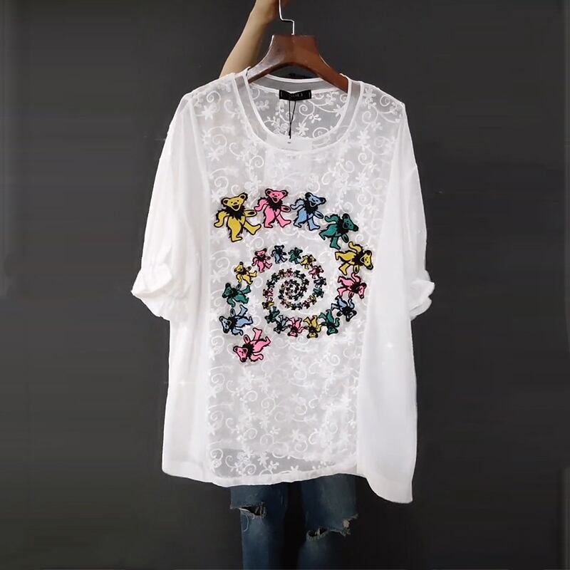 サマーブラウス レースパターンルーズラウンドネックカジュアルTシャツ 夏物 Oネック ミックスインファッション24133307390