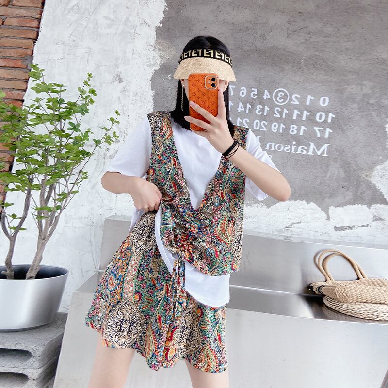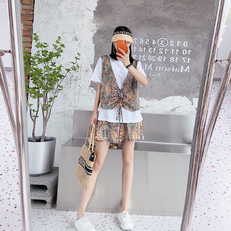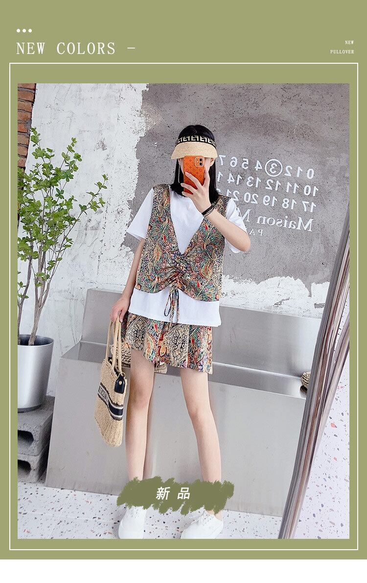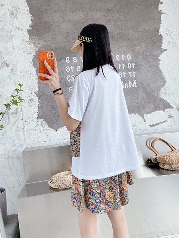 サマーシャツ プリントギャザーTシャツ ショーツ 大きめサイズ 夏物 ブルマー ミックスインファッション3779416006
