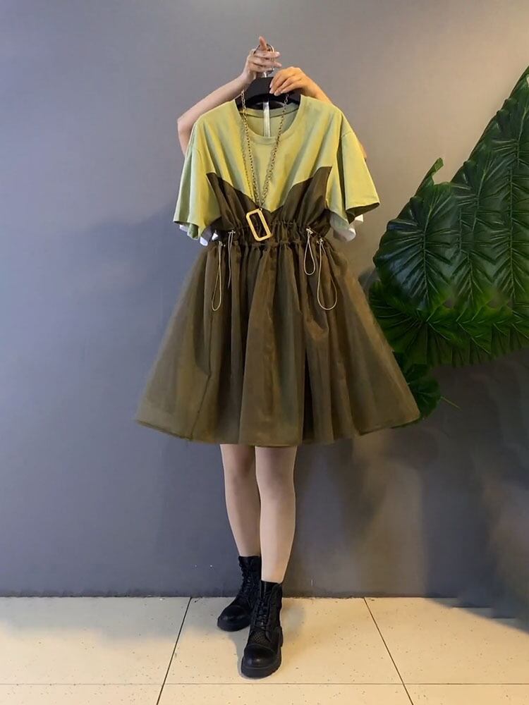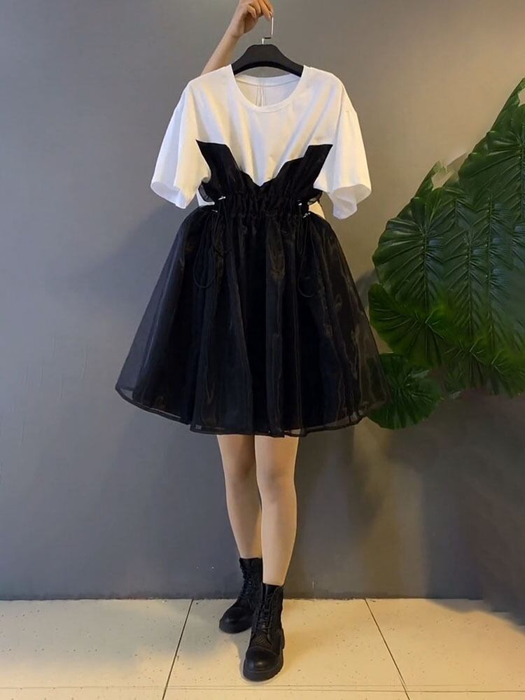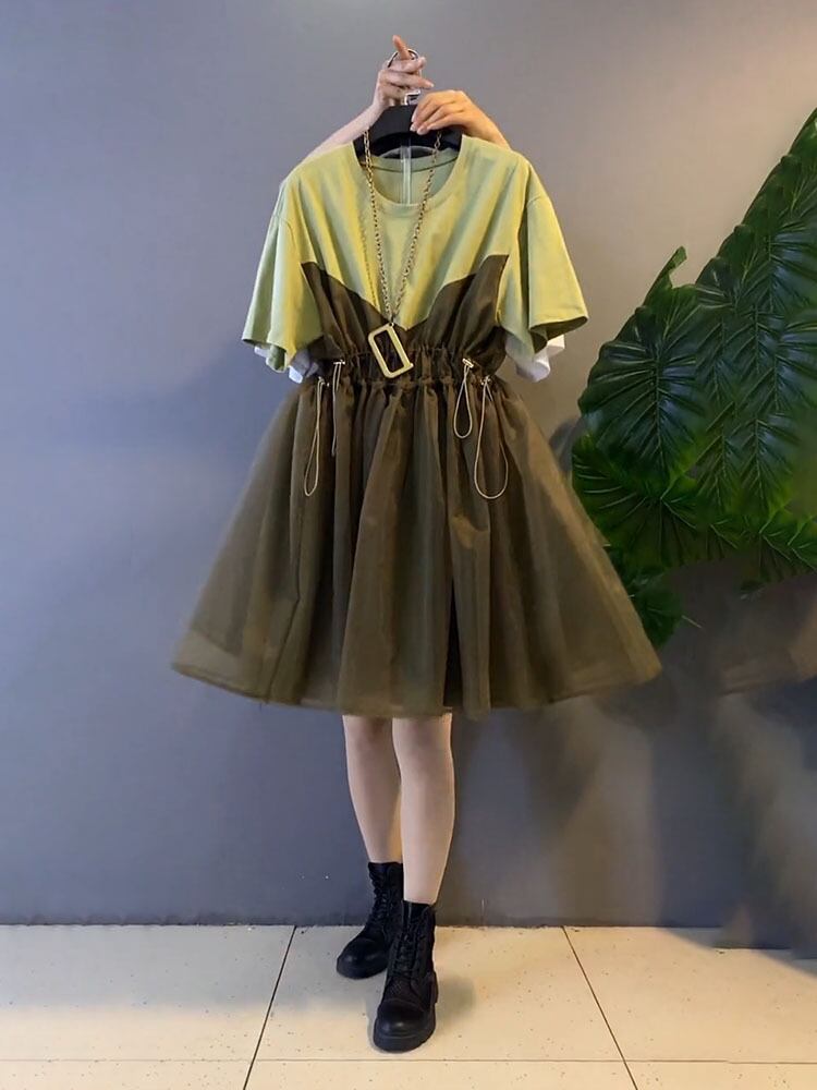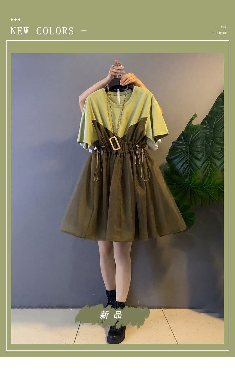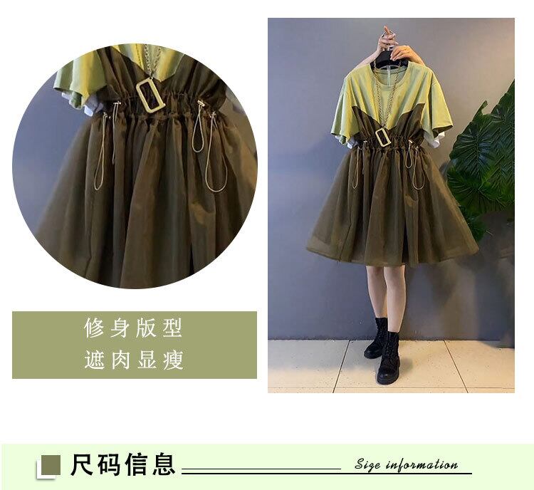 スタイルサマールーズシフォンメッシュドレス スカート 大きめサイズ 夏物 ステッチ ミックスインファッション75722199679