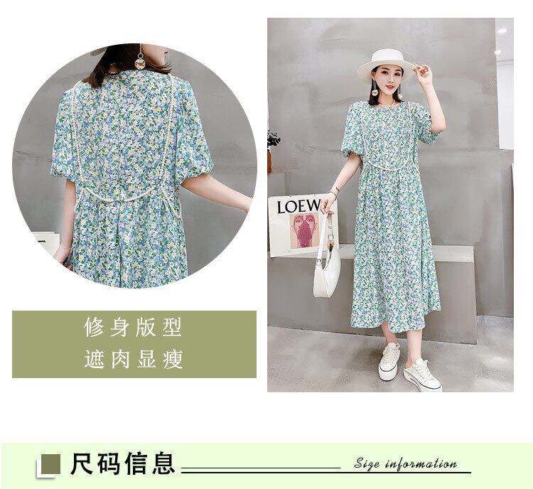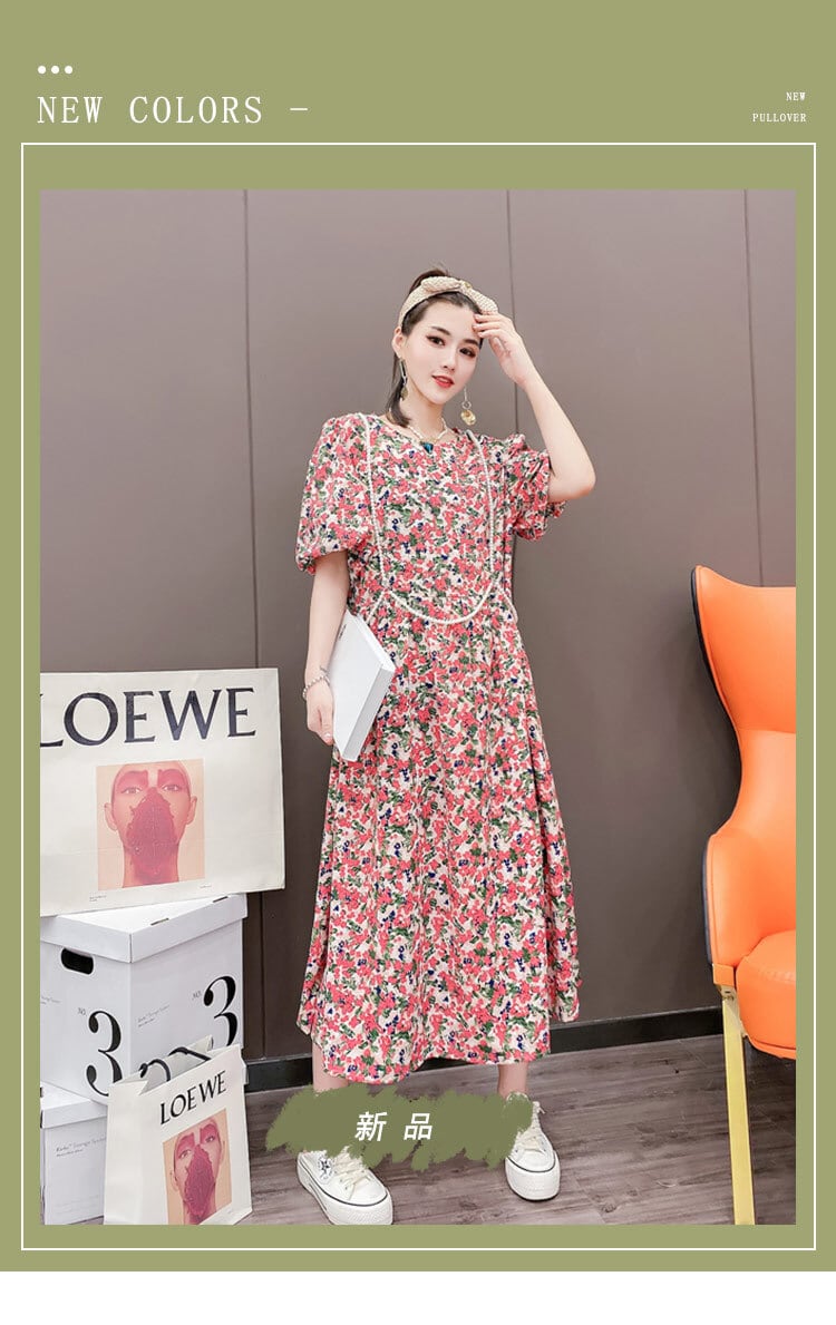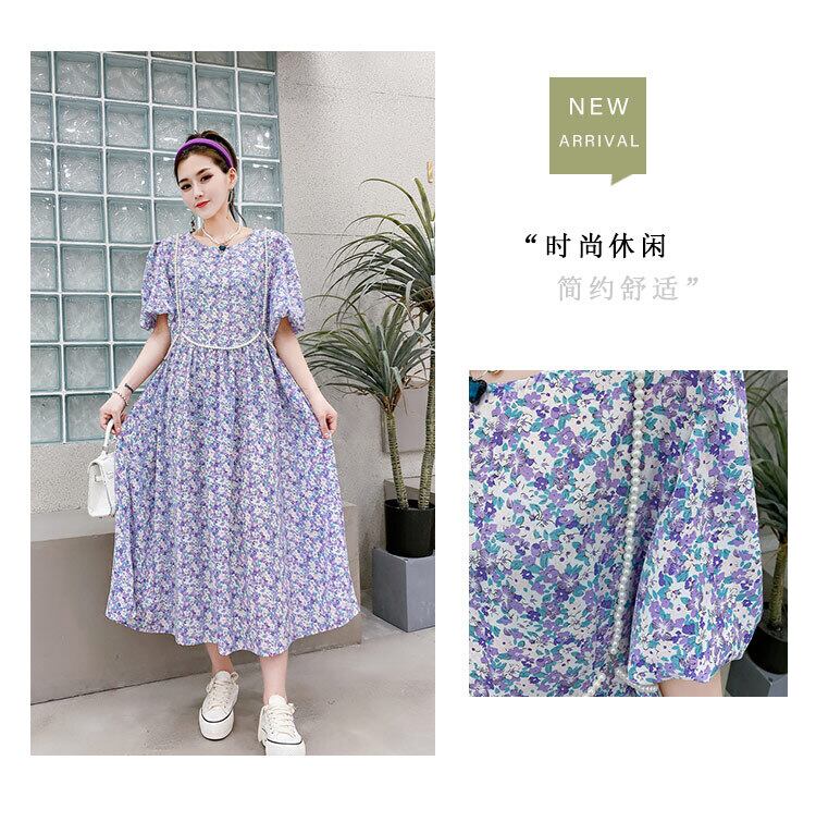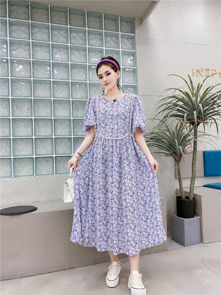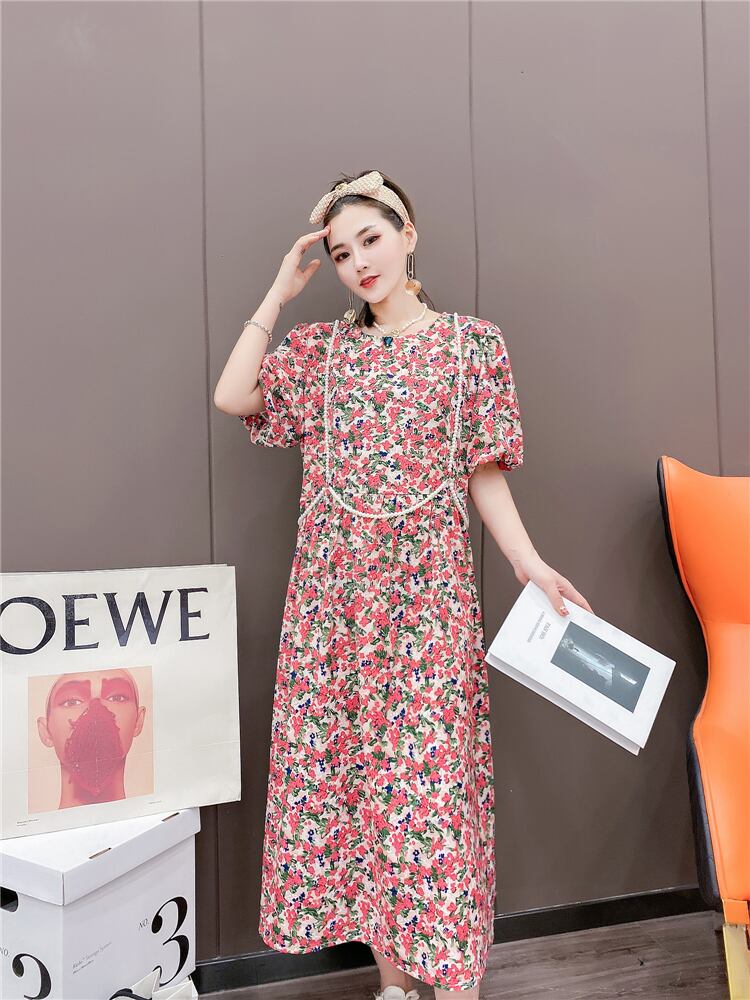 サマーフローラルドレス ロング薄手ラウンドネックスカート 大きめサイズ 夏物 花柄 Oネック ミックスインファッション65588748536