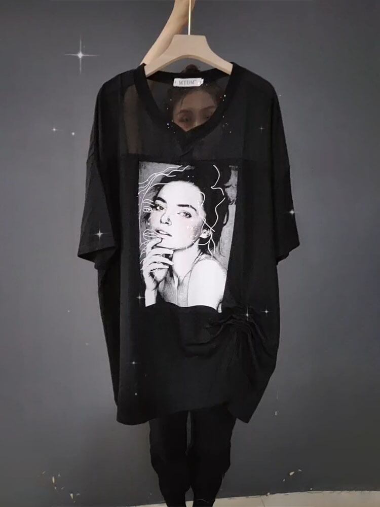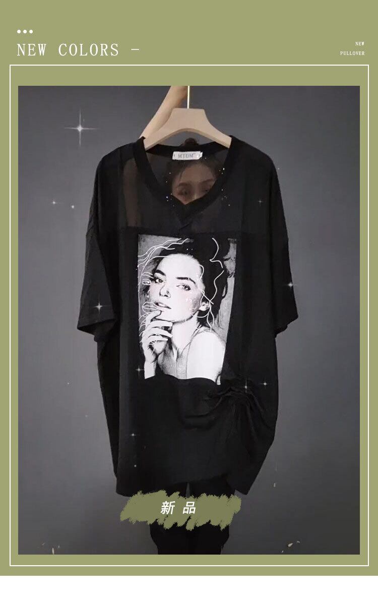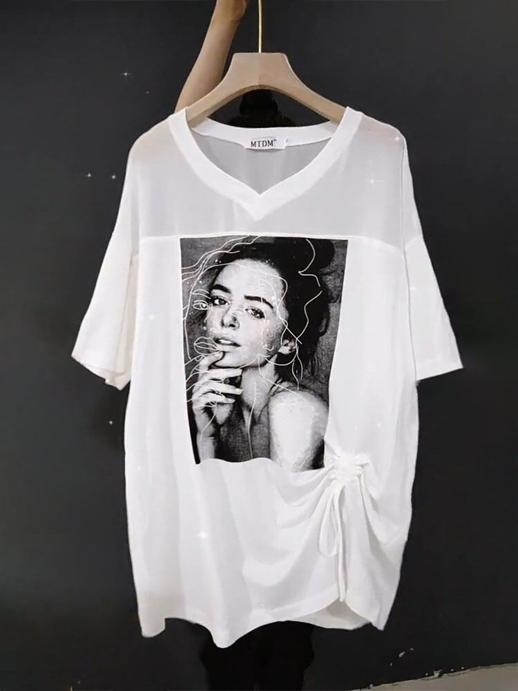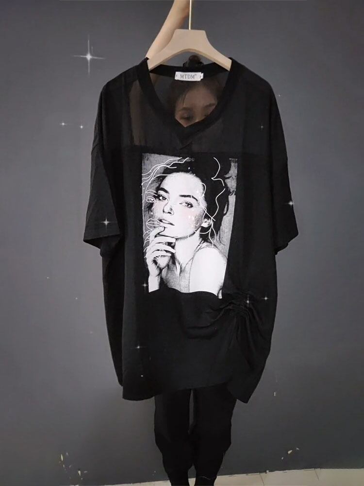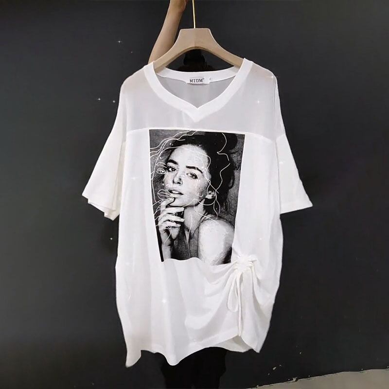 VネックギャザーTシャツ ルーズサマーパターンプリントトップス 大きめサイズ 夏物 ミックスインファッション41901566296
