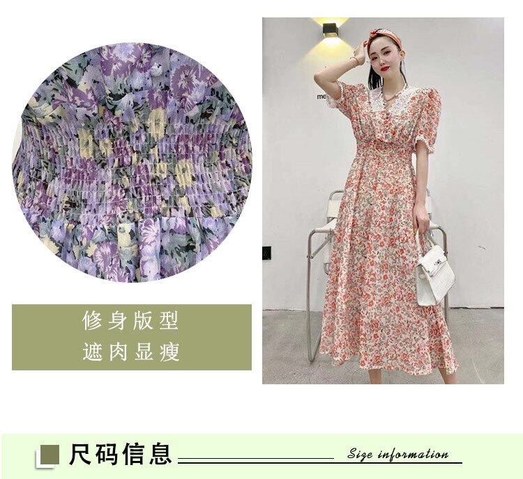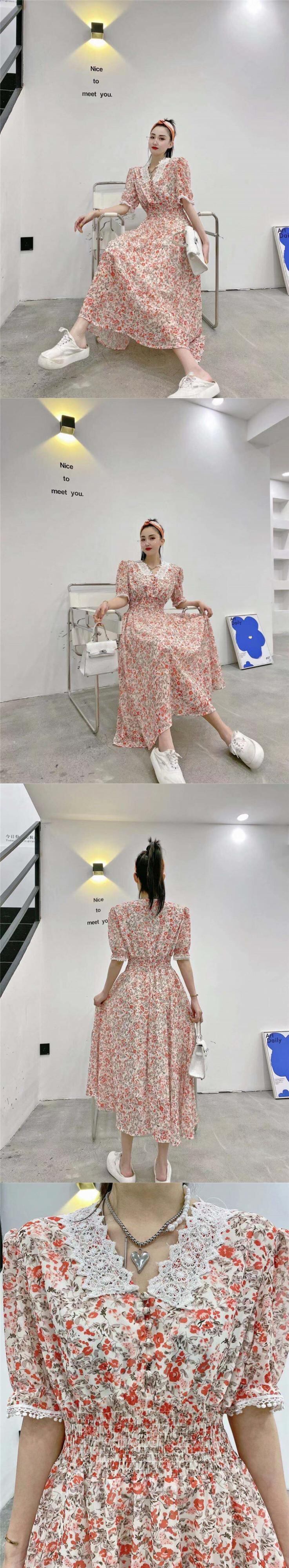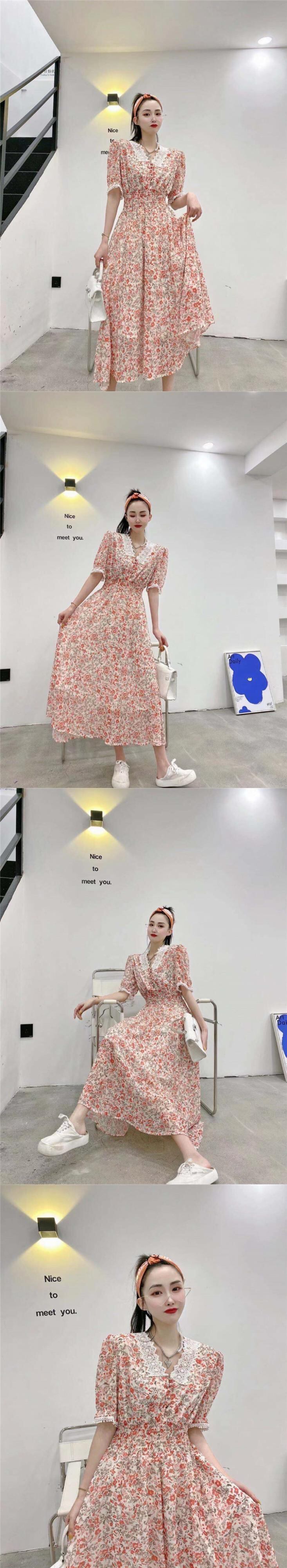 サマーレースVネックフローラルストレッチウェスト薄手ドレス ロングスカート エラスティック 伸縮 大きめサイズ 大人ガーリー スウィート キュート カジュアル 夏物 花柄 ミックスインファッション1050486679
