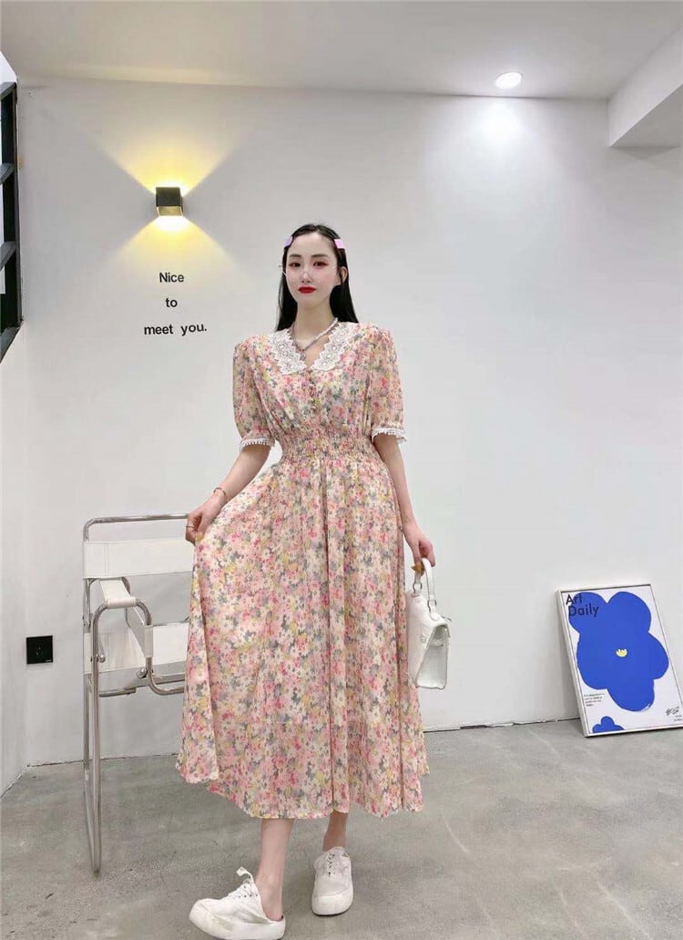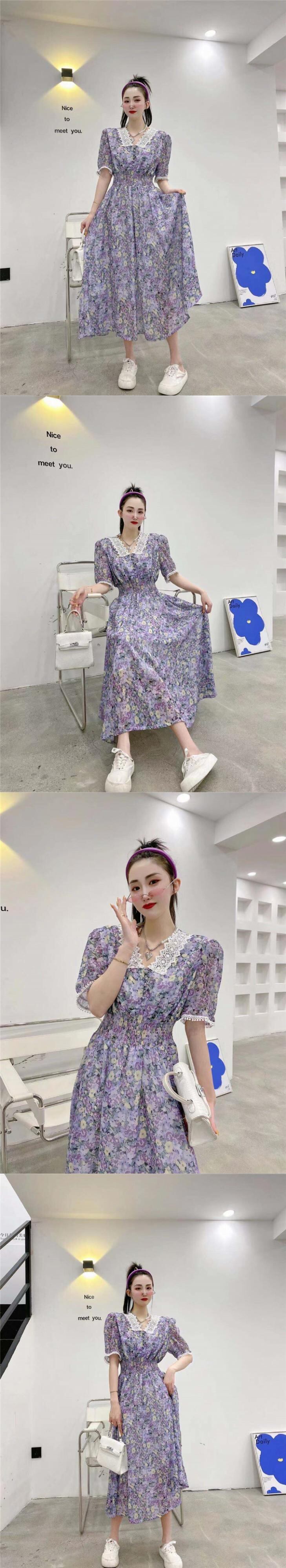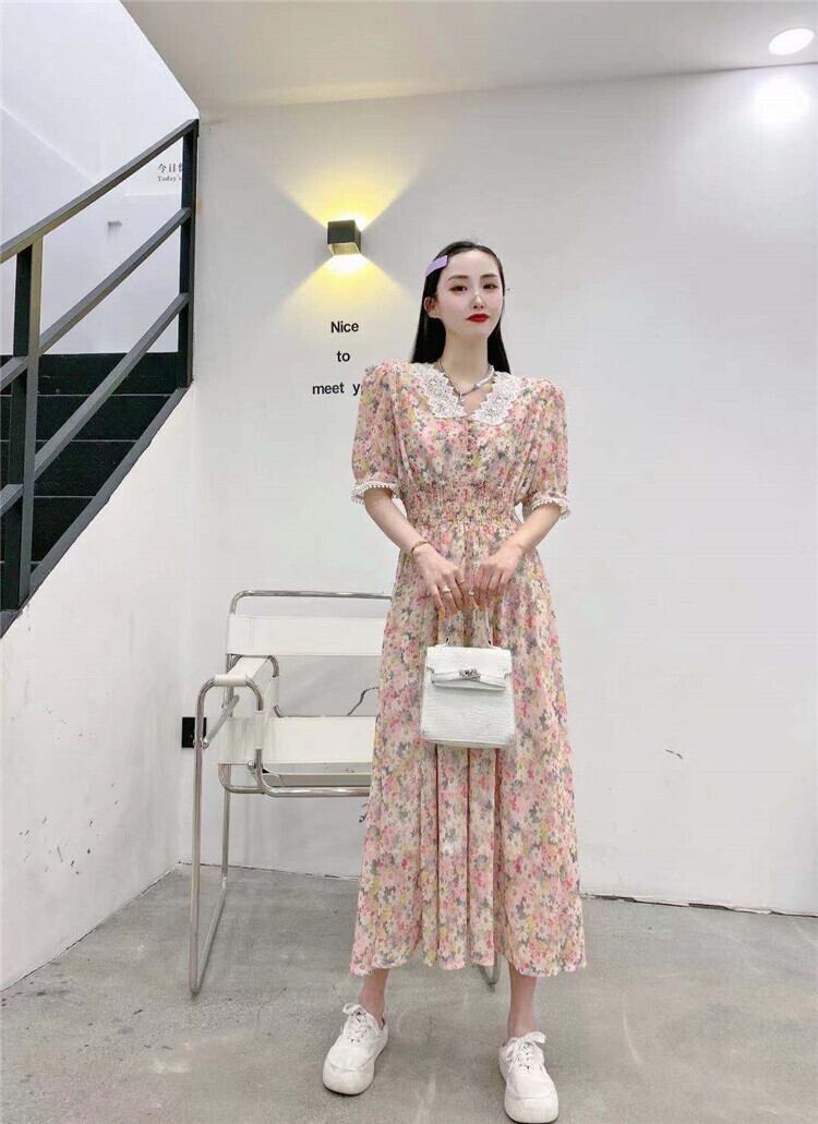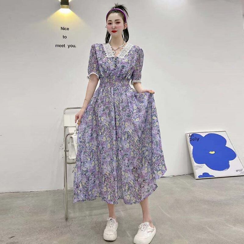 サマーレースVネックフローラルストレッチウェスト薄手ドレス ロングスカート エラスティック 伸縮 大きめサイズ 大人ガーリー スウィート キュート カジュアル 夏物 花柄 ミックスインファッション1050486679