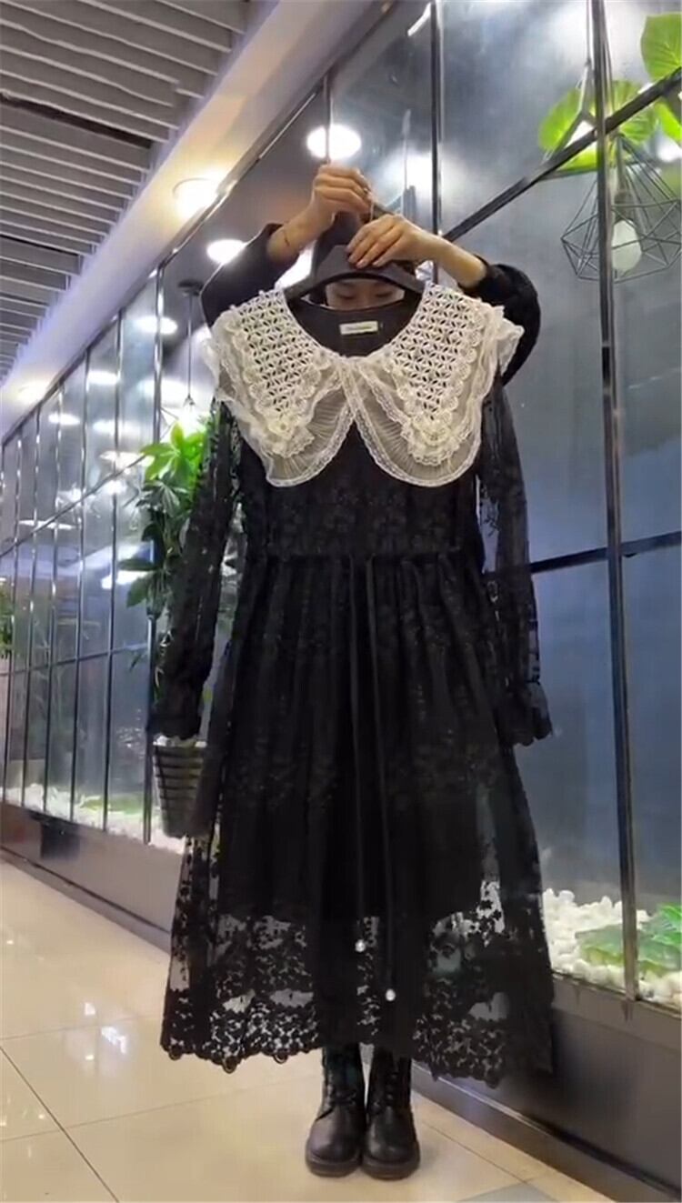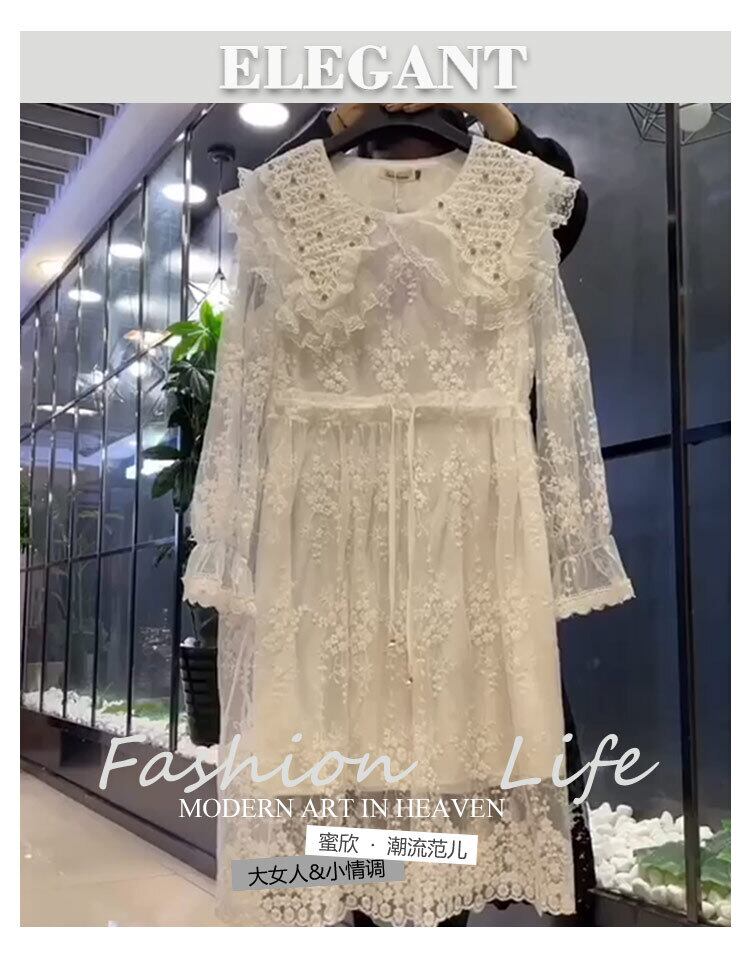 スプリングレースメッシュスリーブウェストドレス 大きめサイズ 春物 ミックスインファッション39846381777