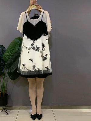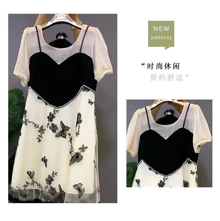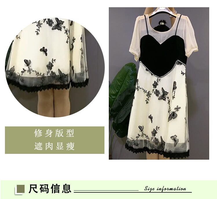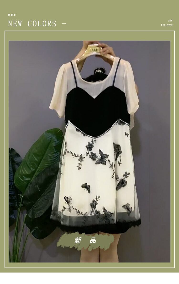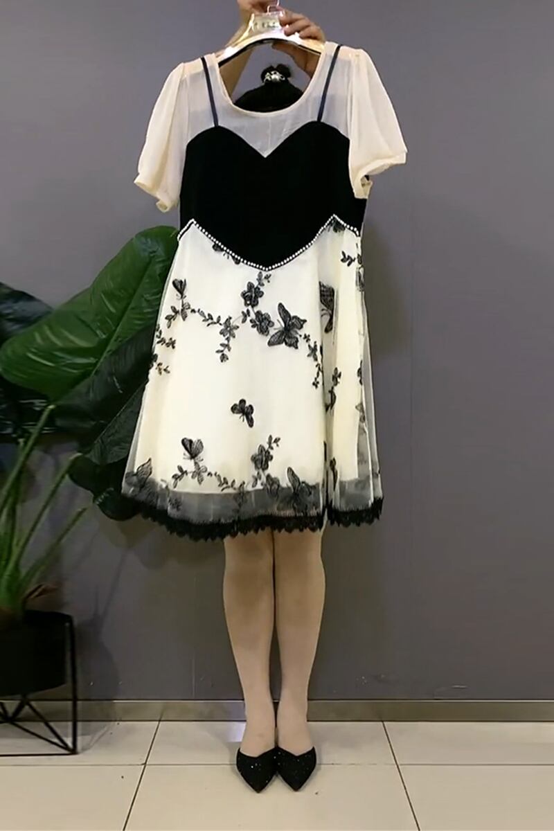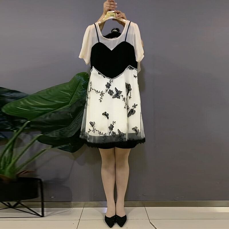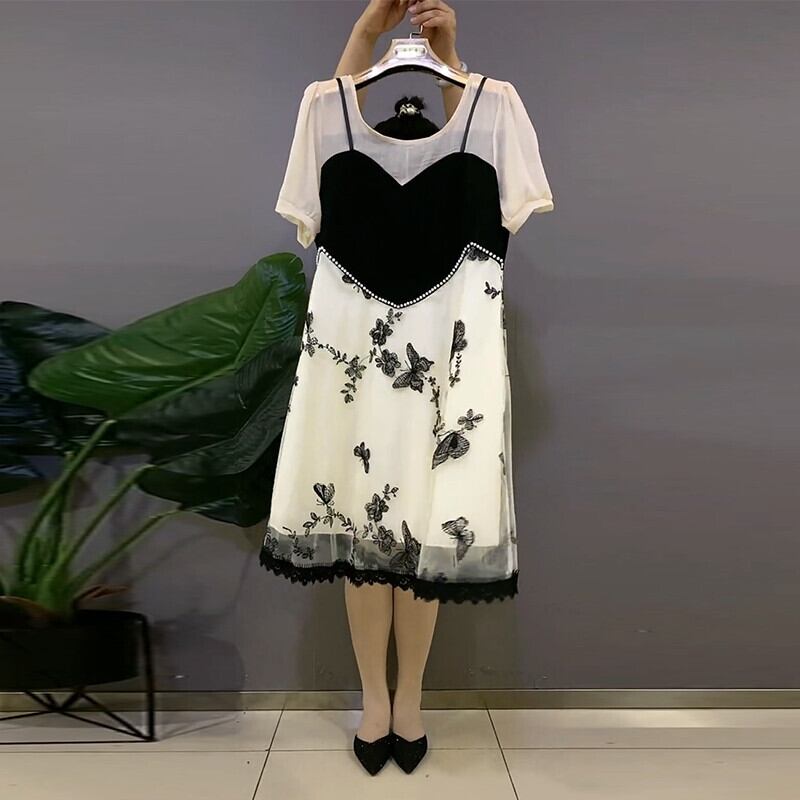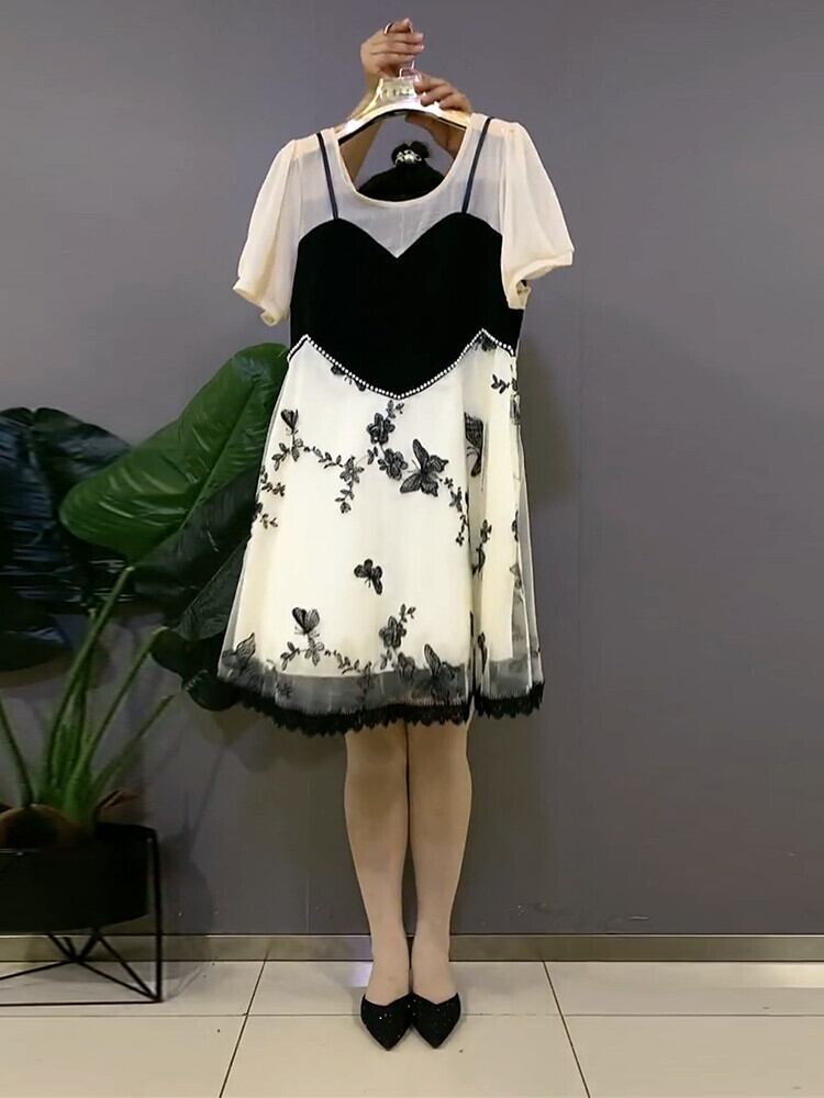 ラウンドネックシフォンメッシュButterflyデザイン Flowerデザイン ドレス サマーツーピース薄手スカート 大きめサイズ 夏物 Oネック フラワーデザイン ミックスインファッション6630277898