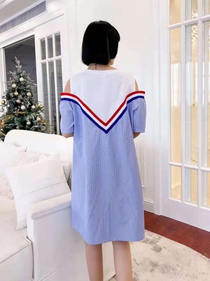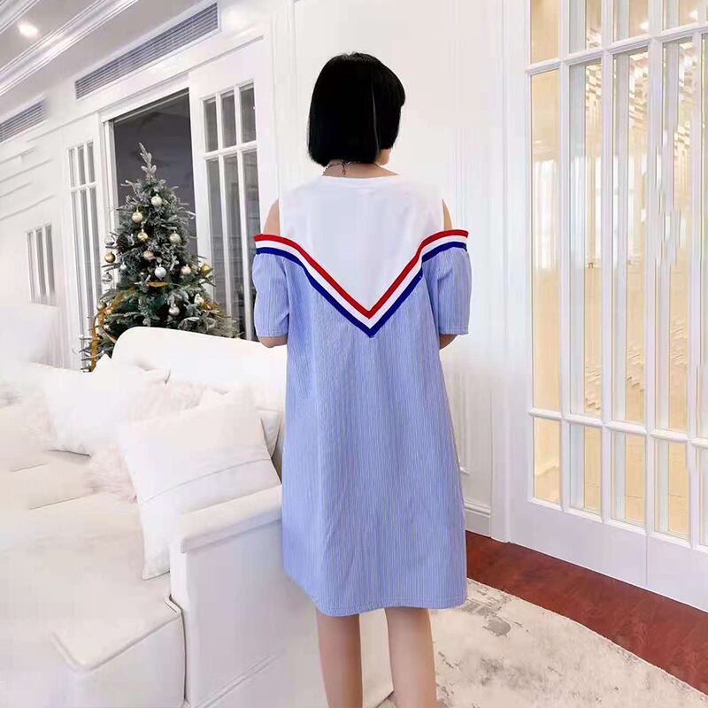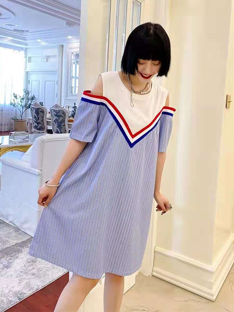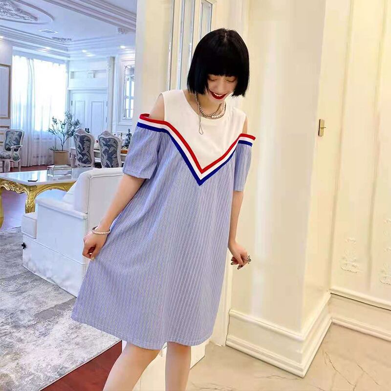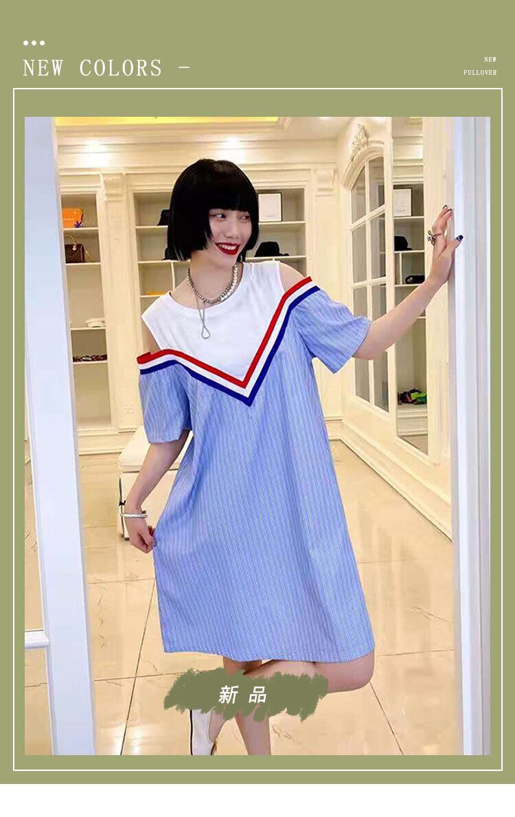 サマーストラップレスウェストラウンドネックストライプドレス 大きめサイズ 夏物 Oネック ミックスインファッション11706474995