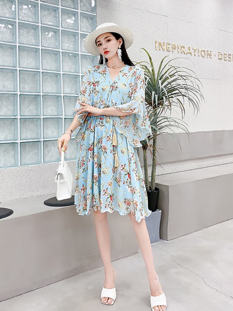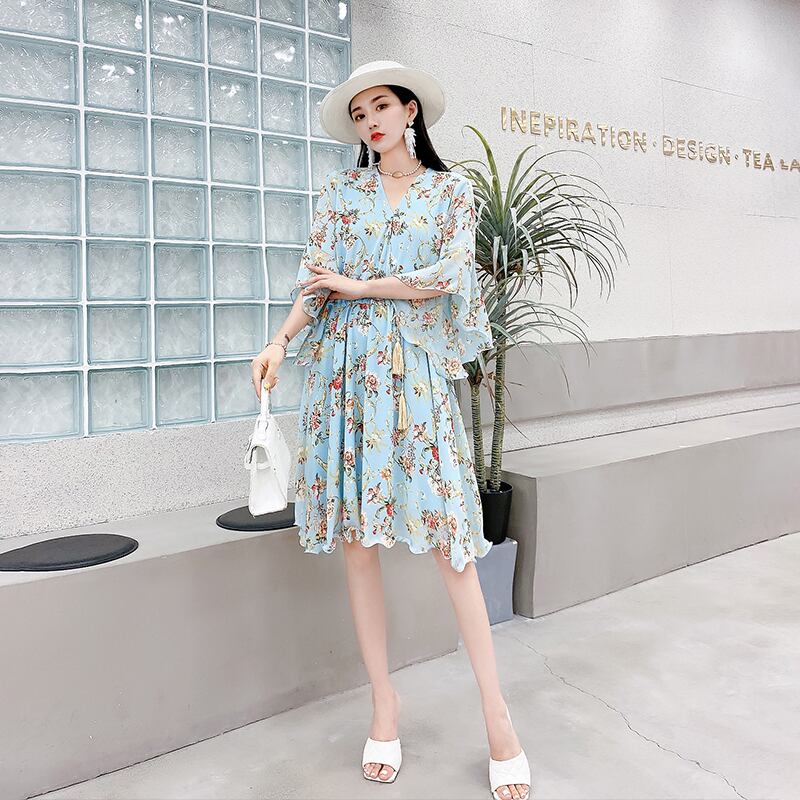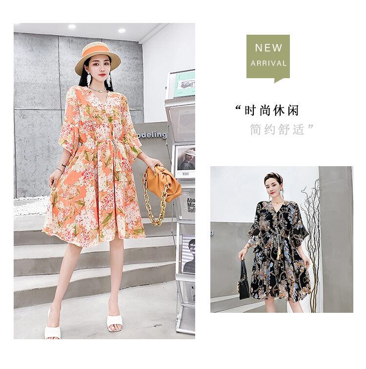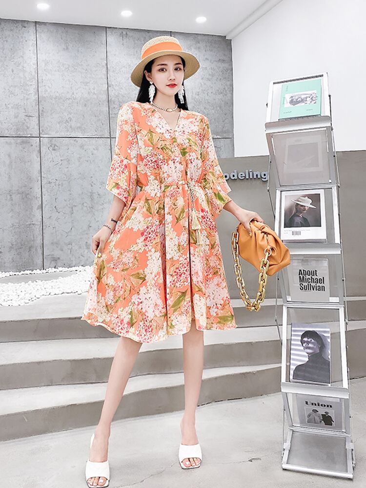 VネックギャザーFlowerデザイン ドレス ルーズ薄手 大きめサイズ フラワーデザイン ミックスインファッション79469368458