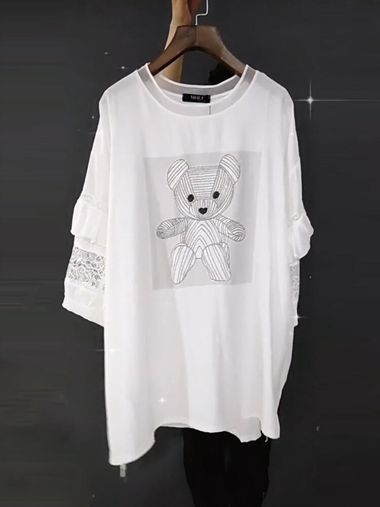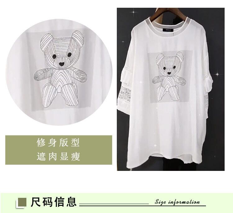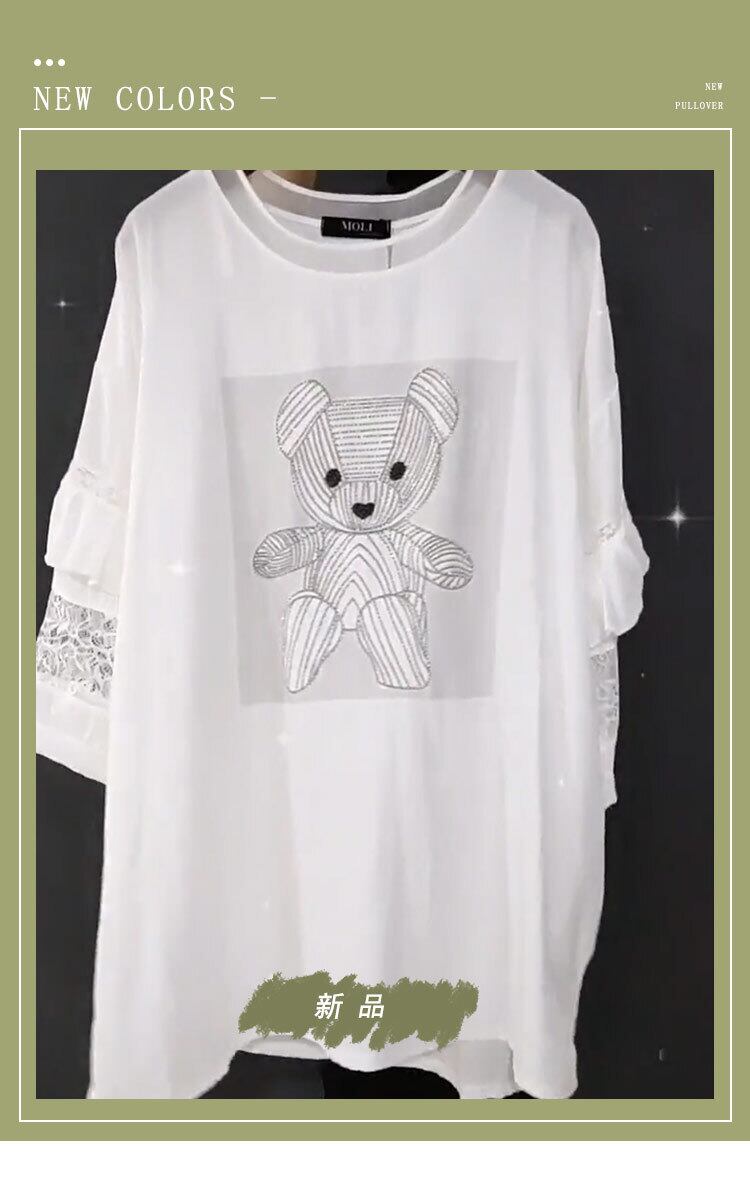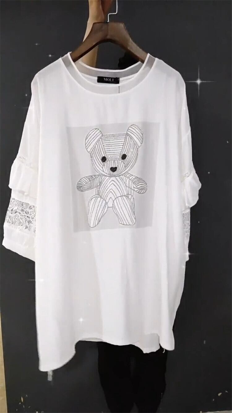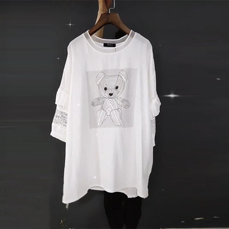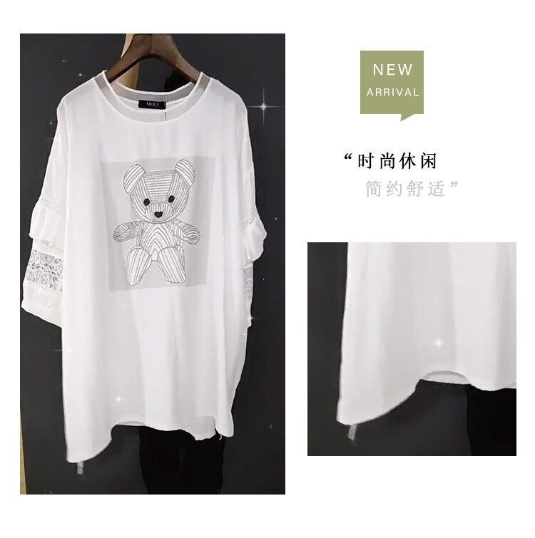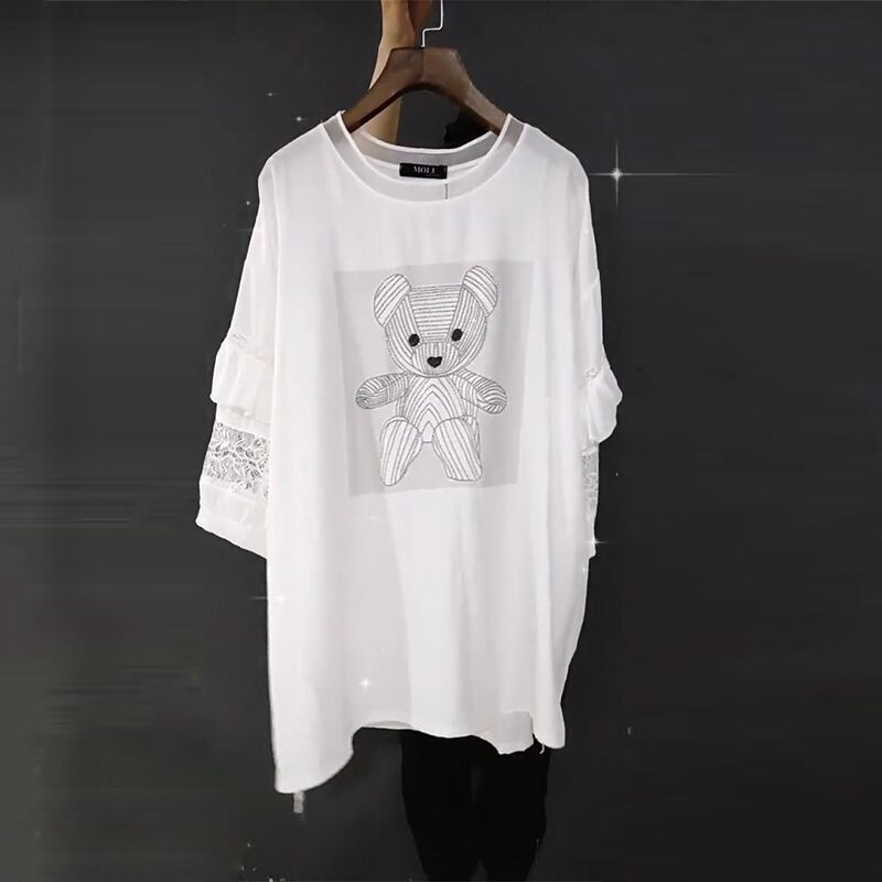 カジュアルラウンドネックシフォンレーススリーブTシャツ 大きめサイズ Oネック ステッチ ミックスインファッション83329952255