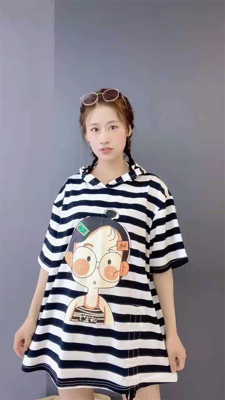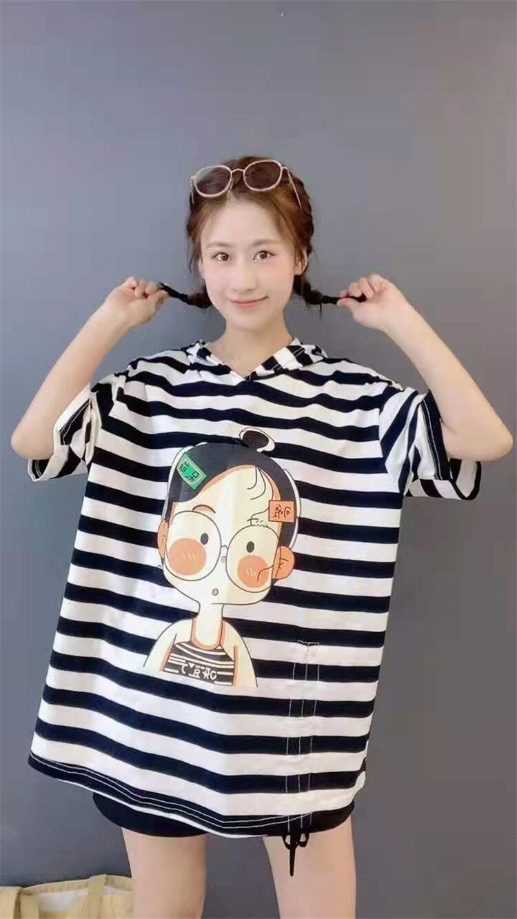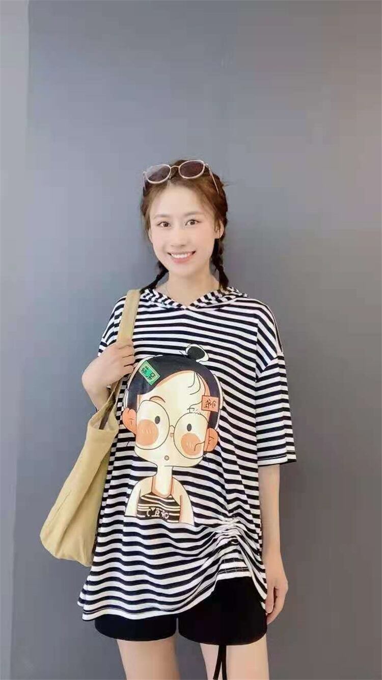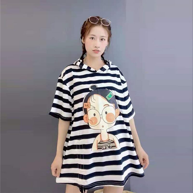 スタイルフードストライプルーズTシャツ シャツ サマードレス 薄手 大きめサイズ 夏物 ミックスインファッション53403542548