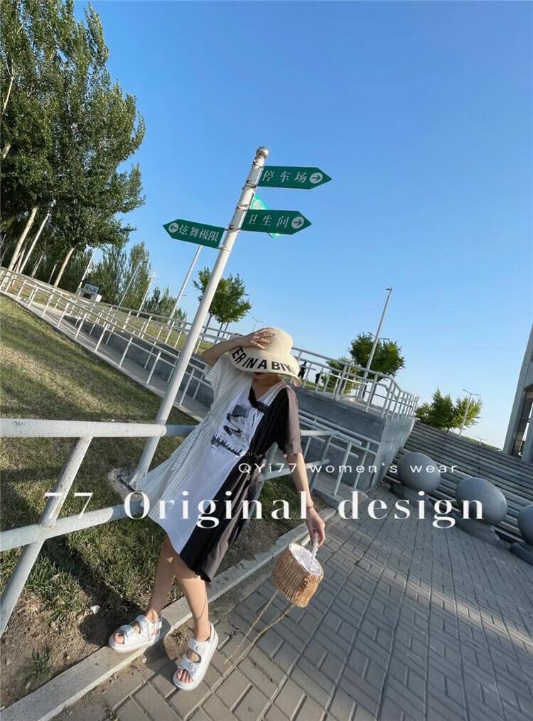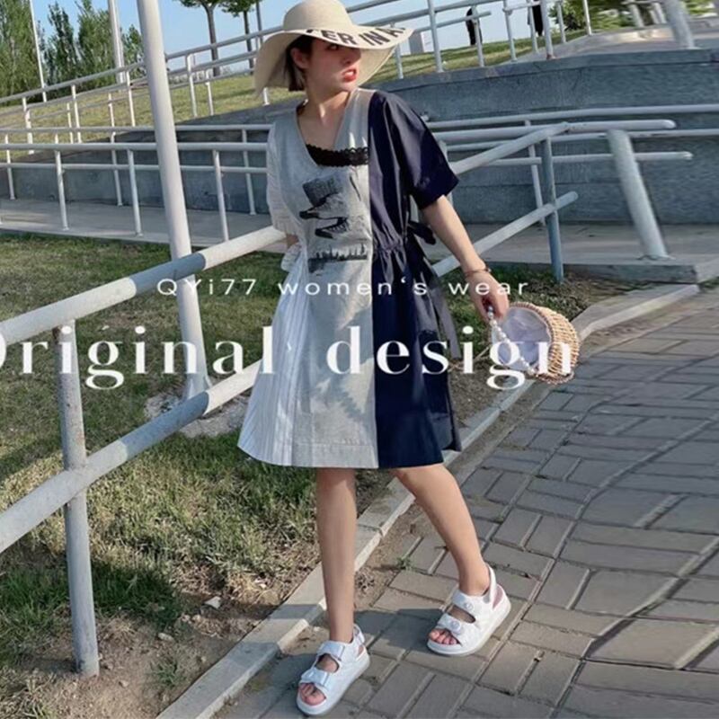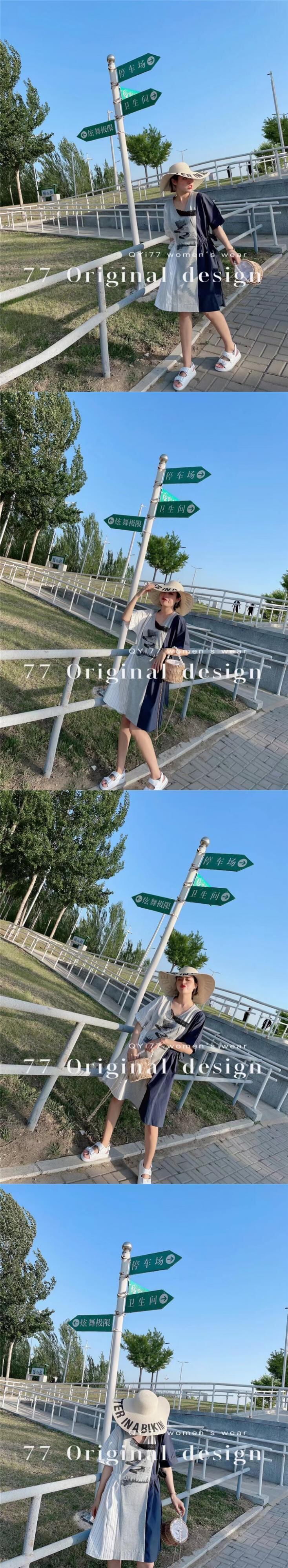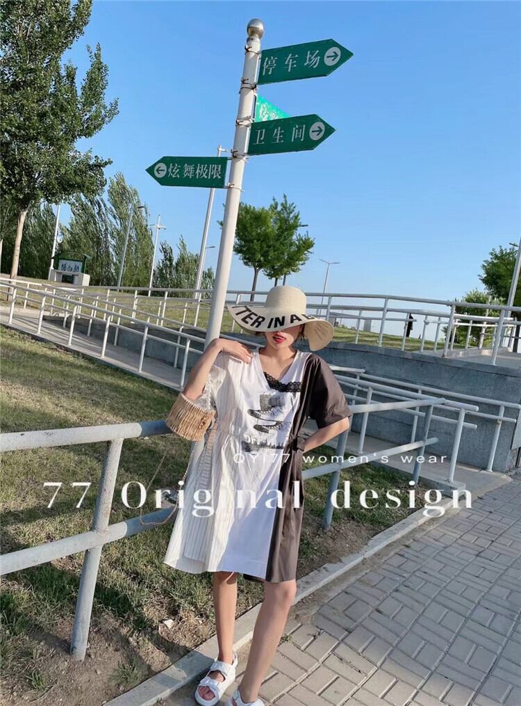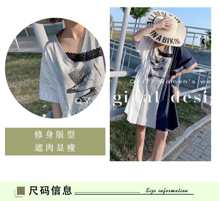 サマーウェストVネックストライプドレス 大きめサイズ 夏物 ステッチ ミックスインファッション76899575191