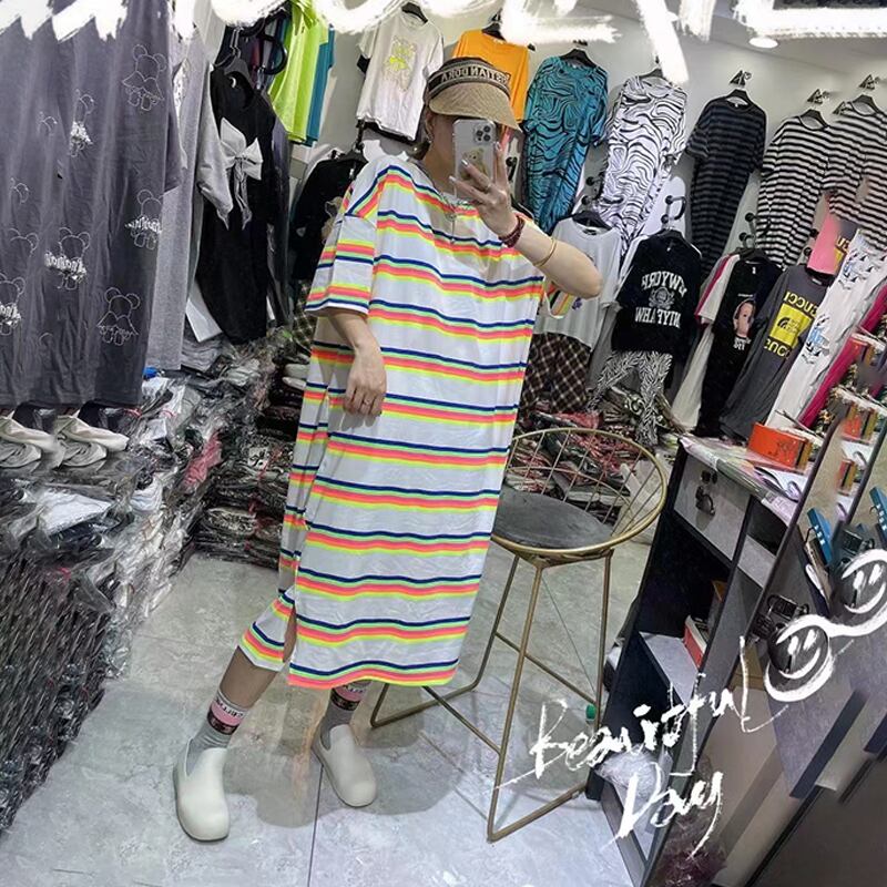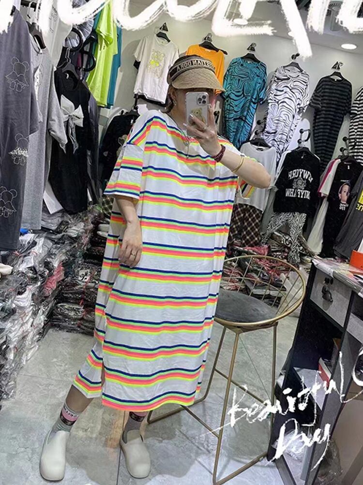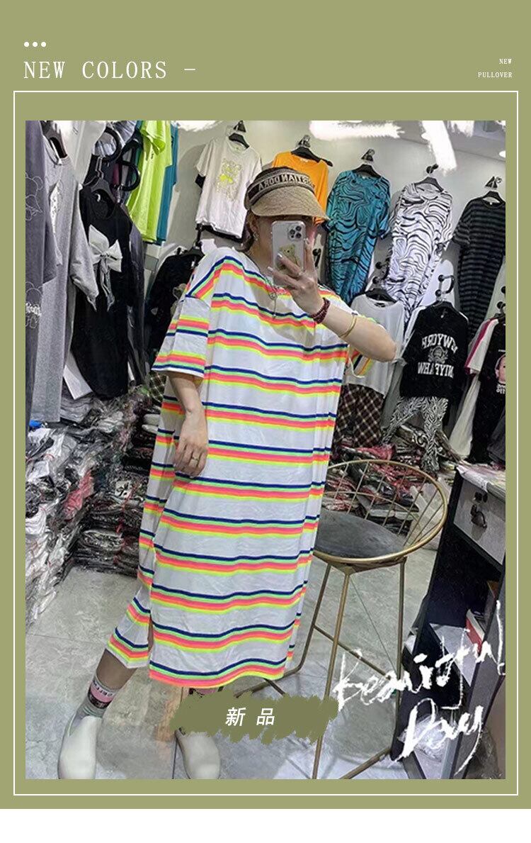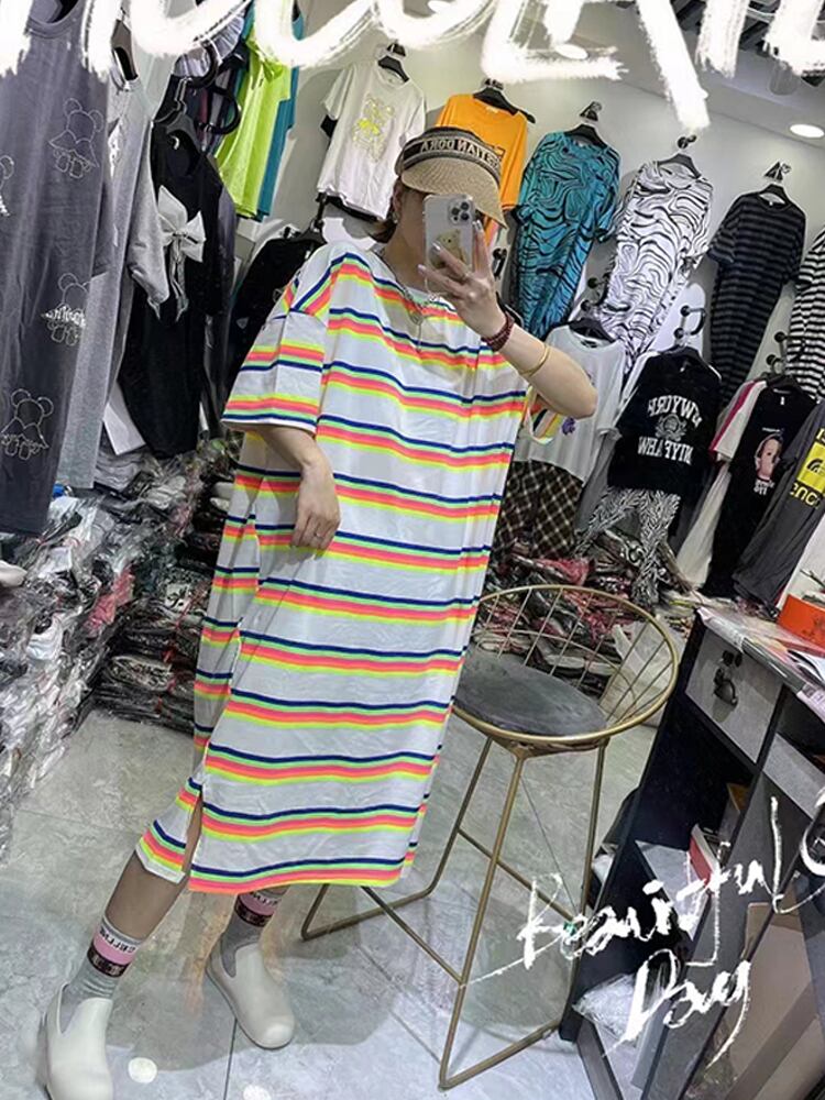 ラウンドネックカラーストライプルーズカジュアルドレス 大きめサイズ Oネック ミックスインファッション54408564210