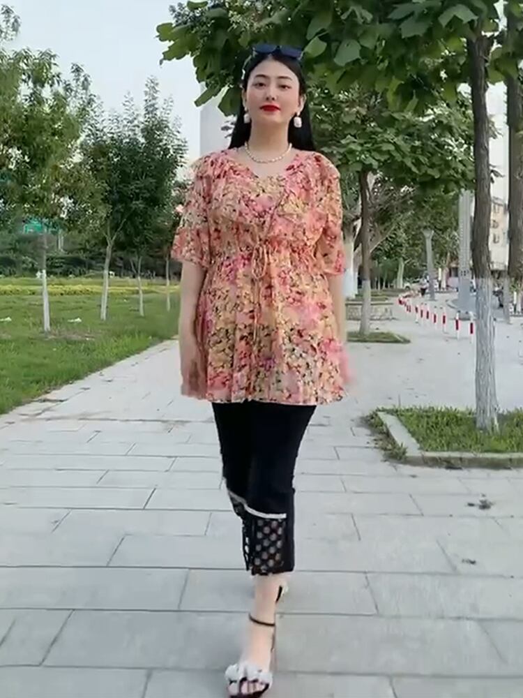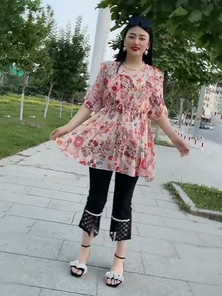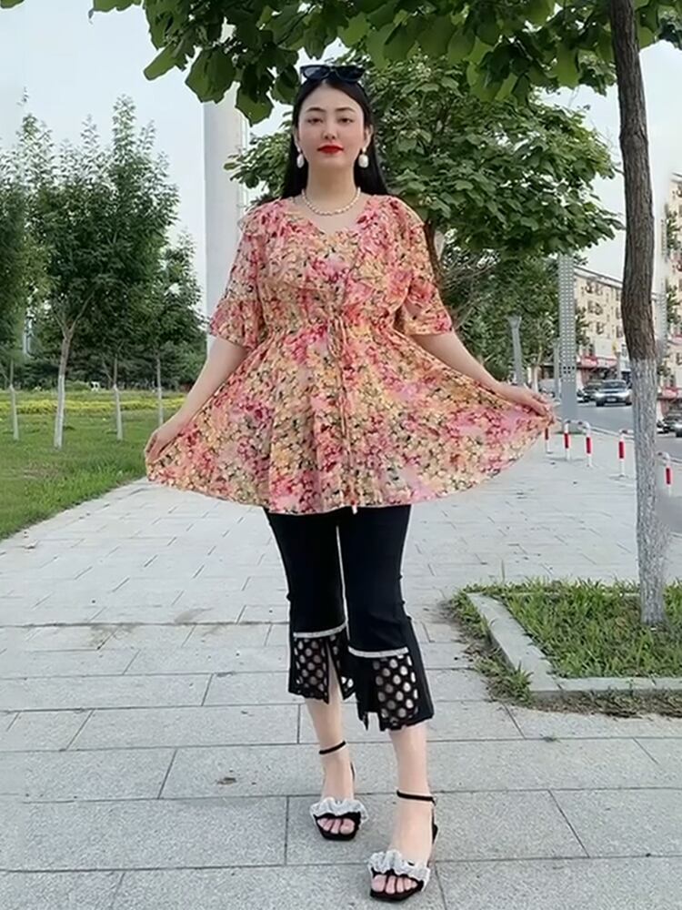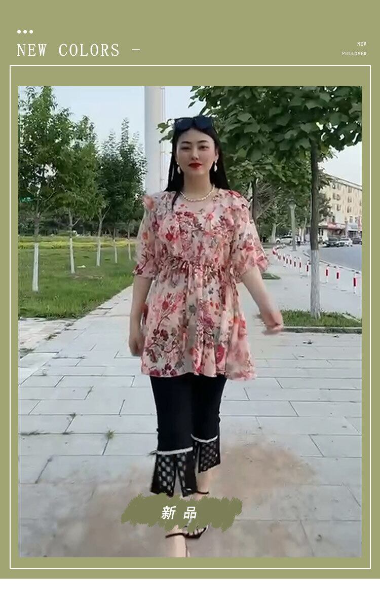 レディースシフォンウェストトップス サマーFlowerデザイン シャツ ルーズTシャツ クロップドパンツ 大きめサイズ 夏物 フラワーデザイン ミックスインファッション63114001587