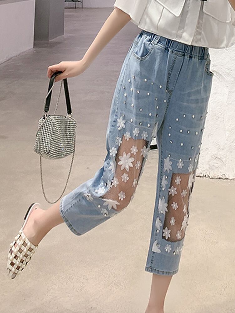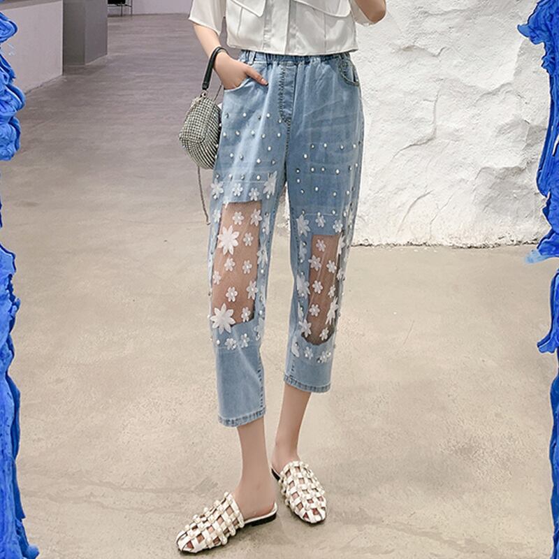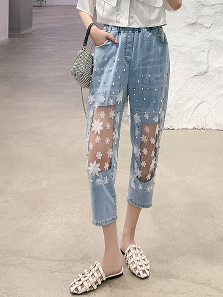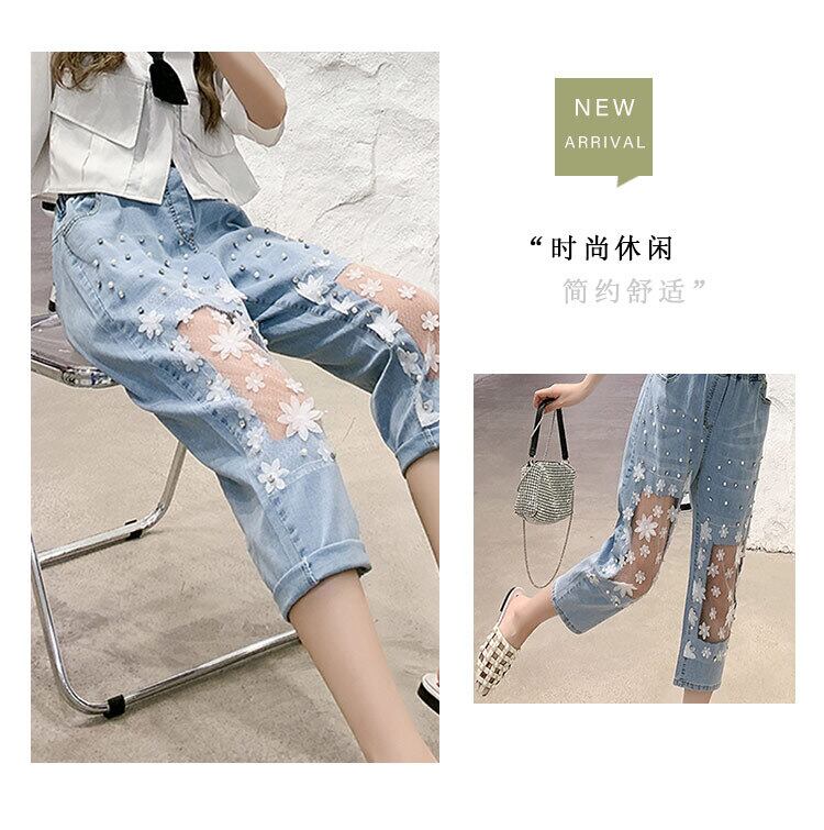 サマースタイルレースジーンズ ルーズクロップドパンツ 大きめサイズ 夏物 ミックスインファッション97303633065