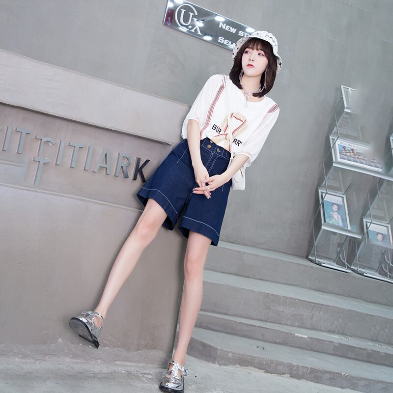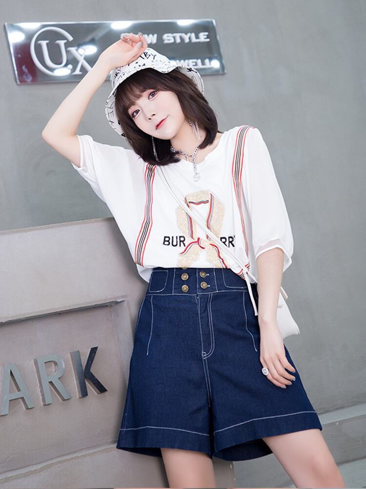 カジュアルラウンドネックストライプTシャツ ハイウェストウェスト薄手ダブルブレストショーツ 大きめサイズ ブルマー Oネック ミックスインファッション88761271252