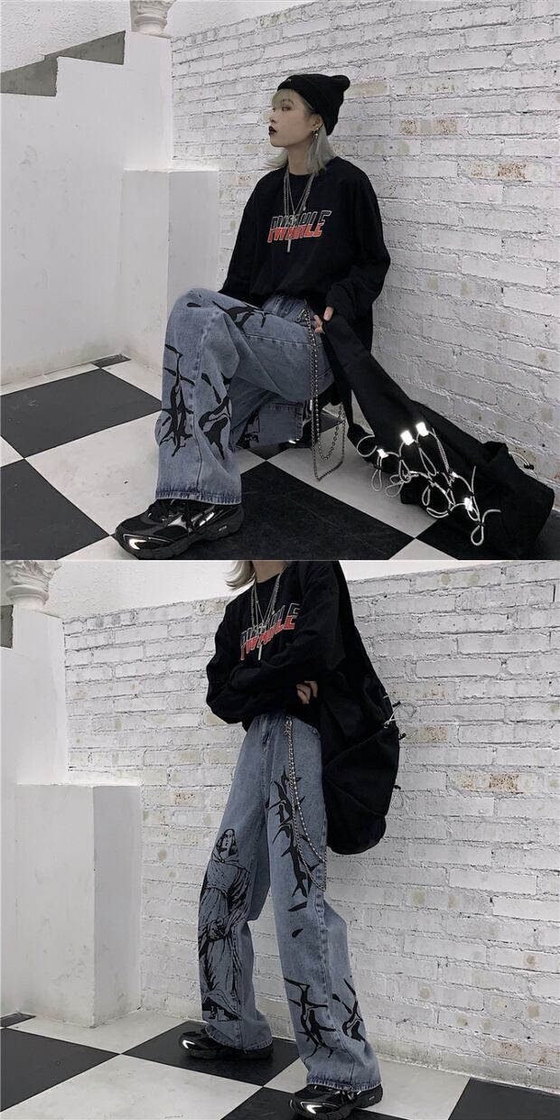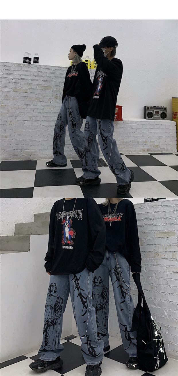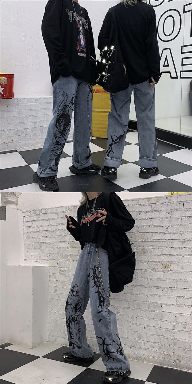 オータムウィンタースタンダードジーンズ ハイウェストウェストパンツ ダークルーズカジュアルプリント レトロ 秋物 冬物 ケッペル63043381702