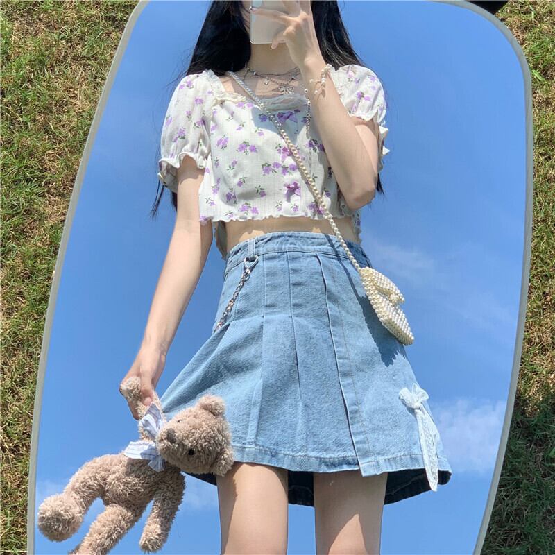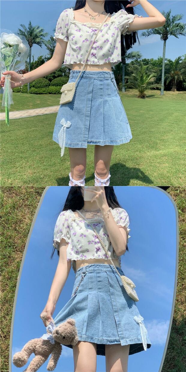 サマーカジュアルリボンフローラルシャツ ハイウェストプリーツAラインスカート 夏物 花柄 ケッペル59784893226