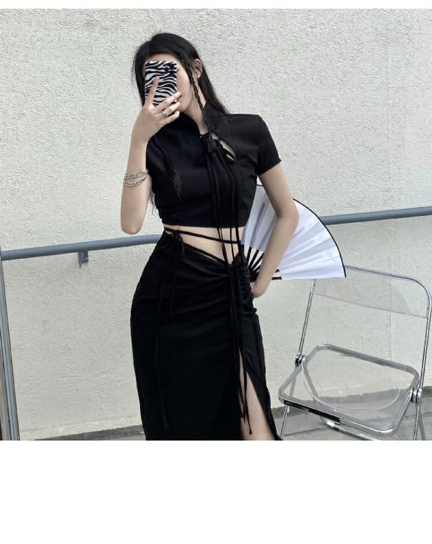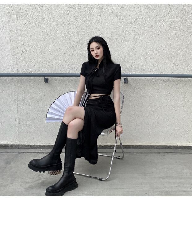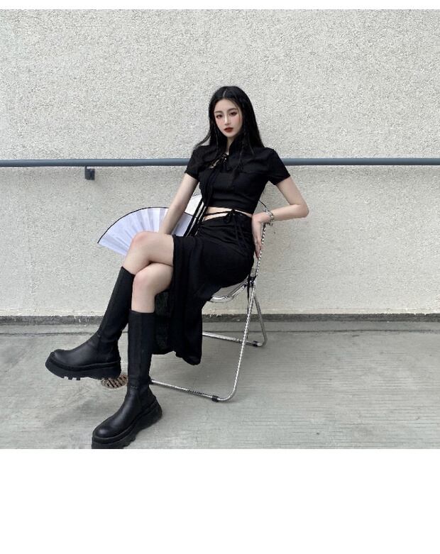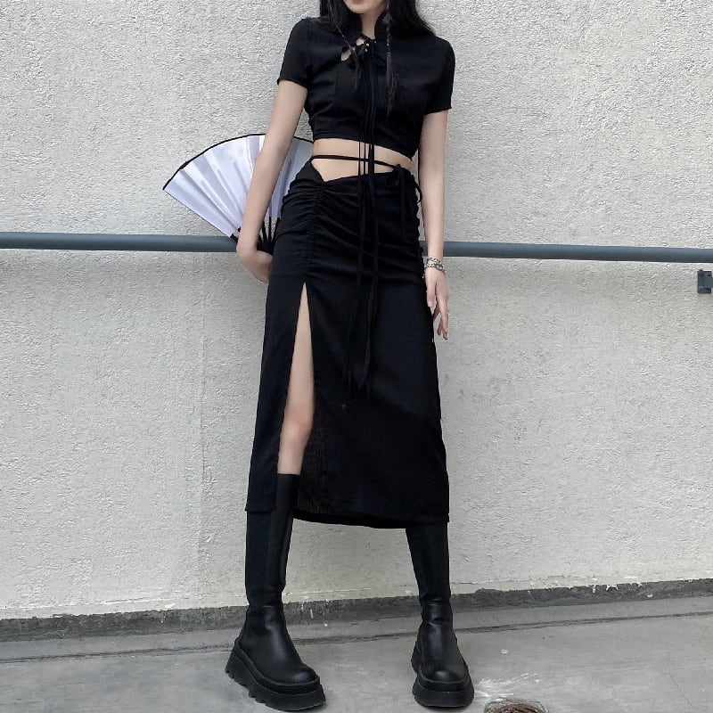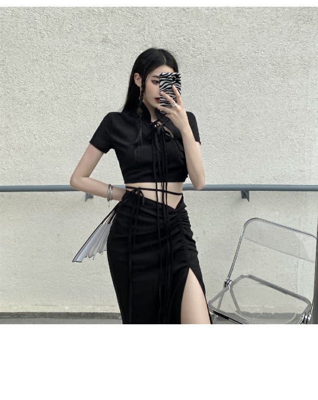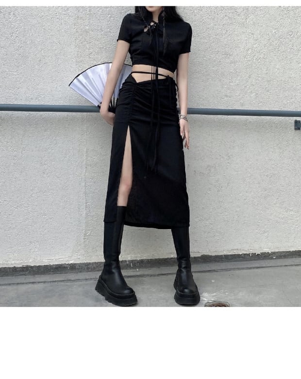 ダークスリムショートレース半袖スリーブトップス スリットハイウェストウェストスカート ハーフスリーブ ケッペル17853043085