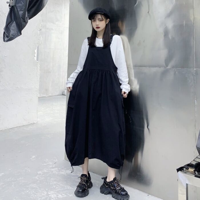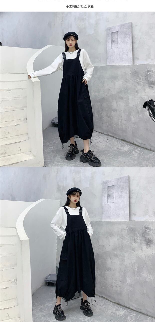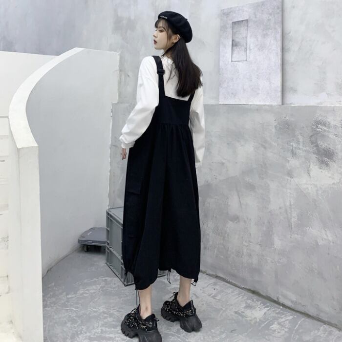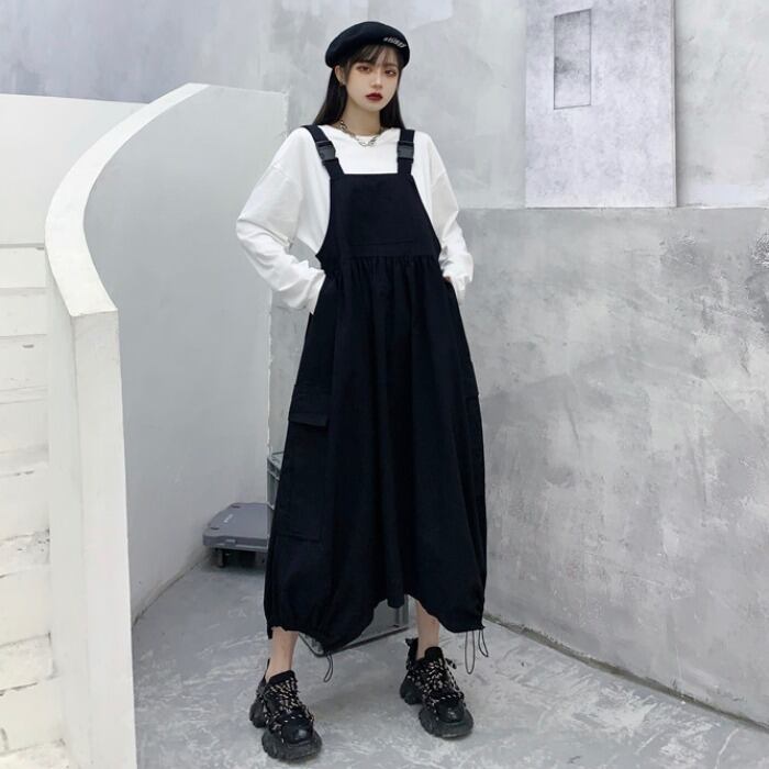 色:白い長袖tシャツ,黒いオーバーオール