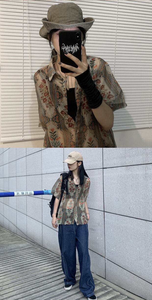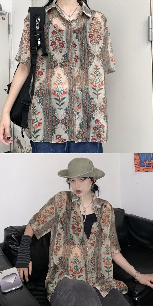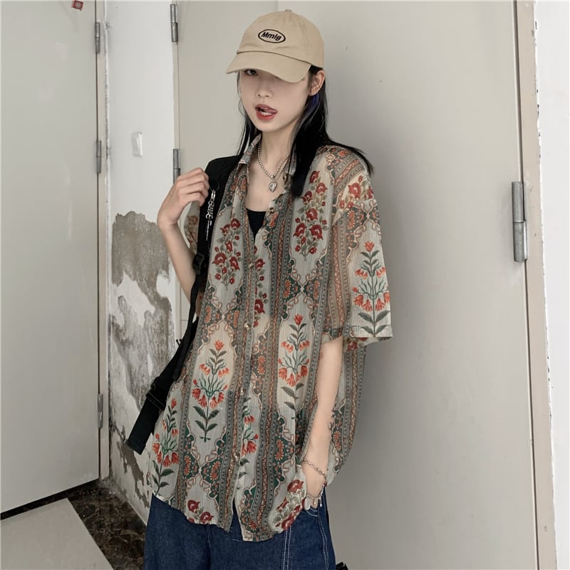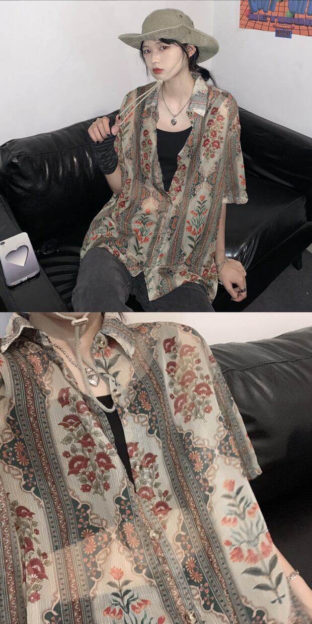 サマーカジュアルシャツ シフォンスタンダードプリント柄ルーズトップス レトロ 夏物 ケッペル36734870344