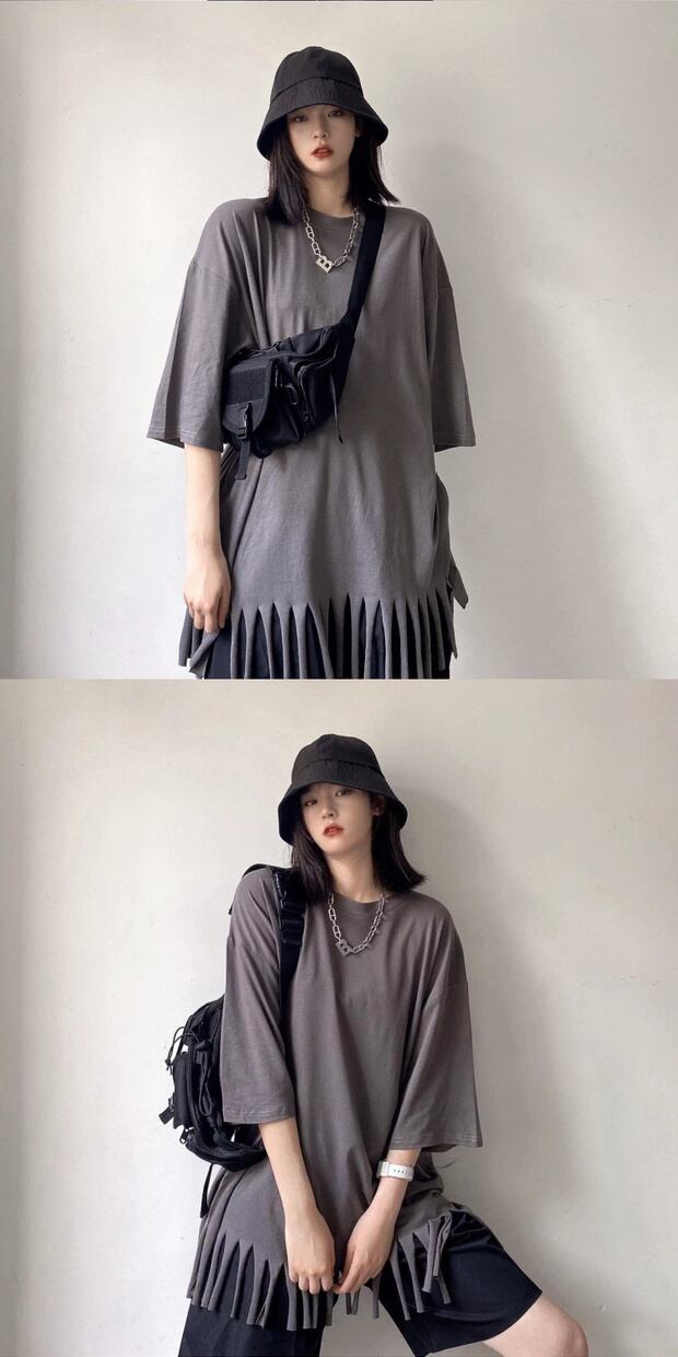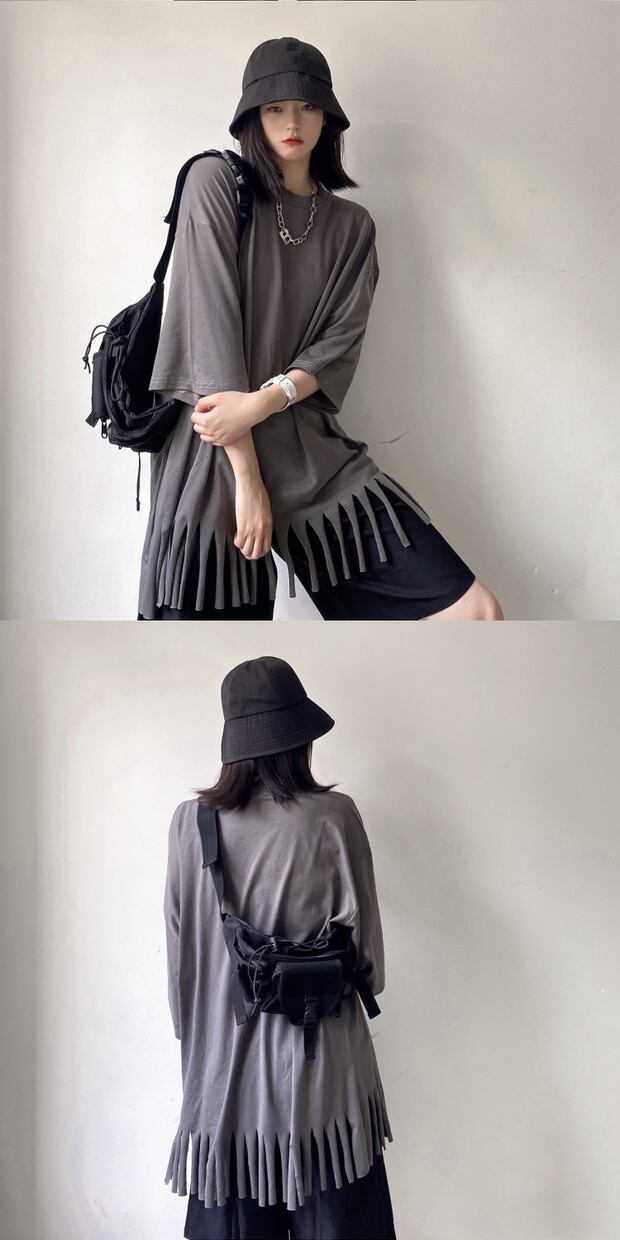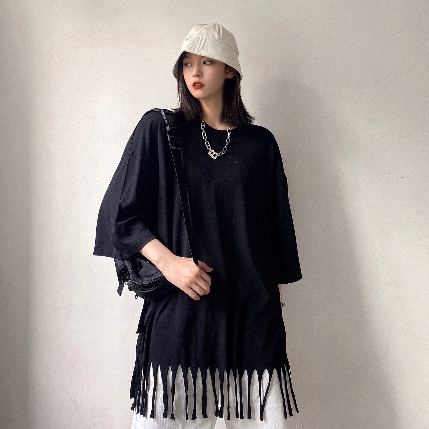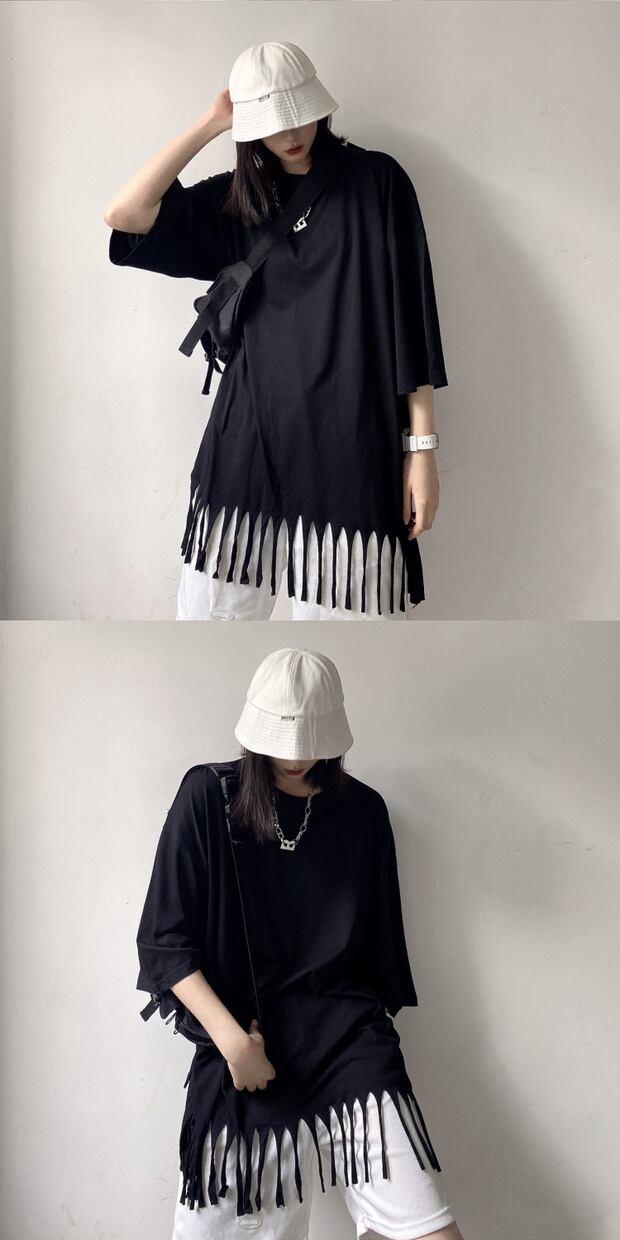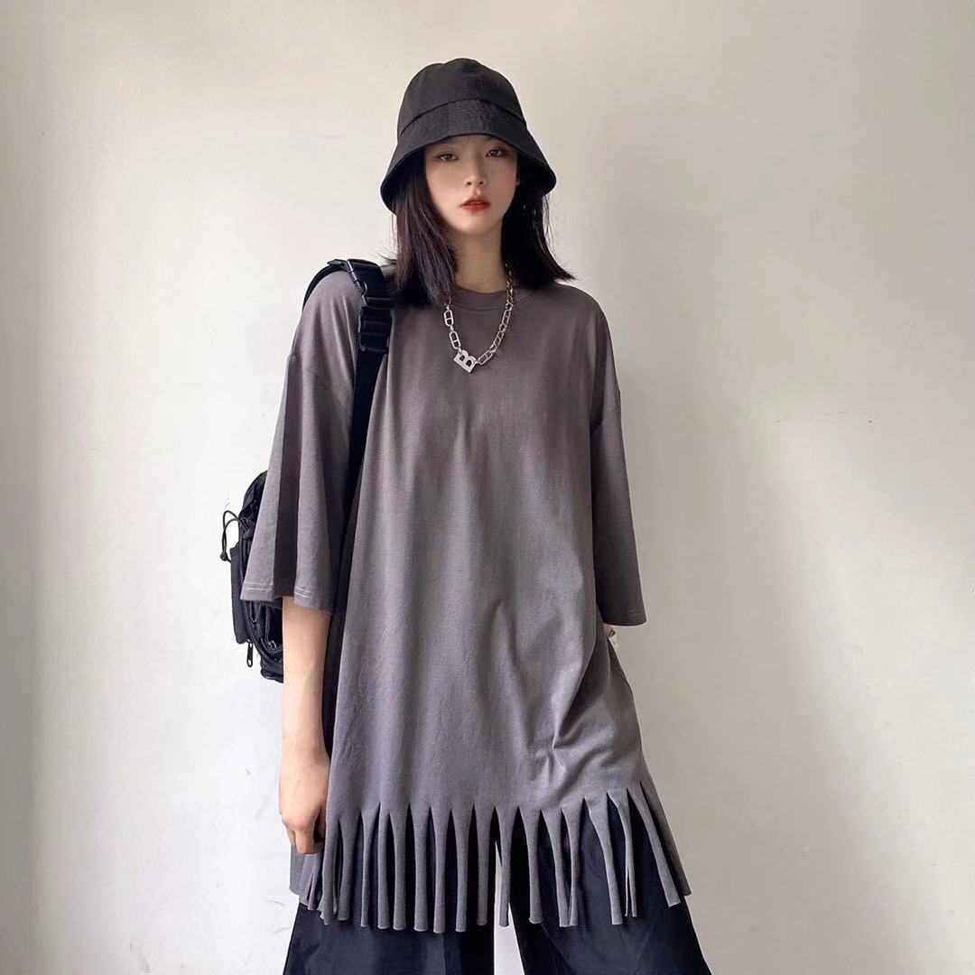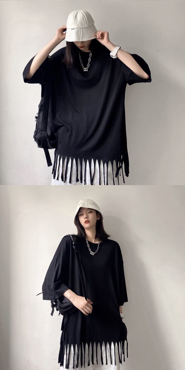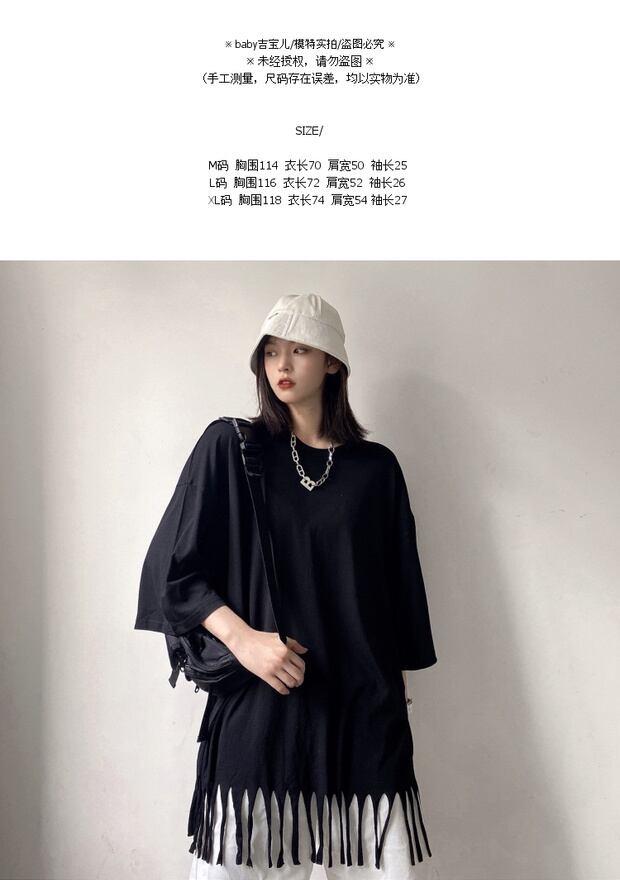 スタイルサマールーズスリーブブラックTシャツ ロングラウンドネック半袖 ハーフスリーブ かわいい 夏物 Oネック ケッペル76403059815
